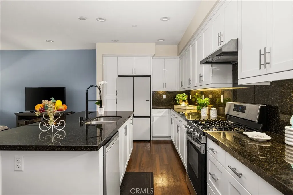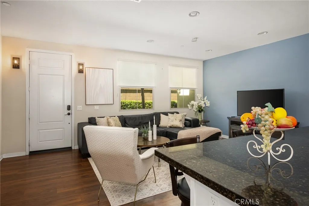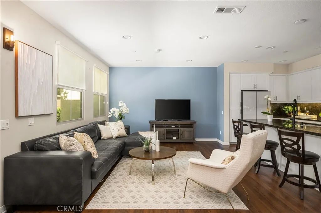 Welcome to this beautifully upgraded end-unit Smart Condo with townhome-like features, perfectly situated in the sought-after Agave community of Portola Springs. This residence offers refined California living on a quiet, tree-lined street, with a layout that blends comfort, style, and function. The open-concept main living space is filled with natural light, featuring rich hardwood floors, custom window treatments, and an inviting ambiance. The gourmet kitchen boasts granite countertops, high-end Bespoke Samsung appliances, a large center island, and abundant cabinetryperfect for culinary enthusiasts and entertaining alike. A downstairs bedroom and full bath provide flexibility for guests or a home office, while upstairs, the spacious primary suite offers a generous walk-in closet, dual vanities, and a sleek walk-in shower. Additional highlights include Smart Home technology, an EV charger, central heating and cooling, in-unit laundry, and an attached 2-car garage. Enjoy a private gated patio for outdoor dining or relaxation, and take advantage of the communitys resort-style amenitiespools, parks, and scenic trails. Located minutes from the Great Park, Irvine Spectrum, Woodbury Town Center, and award-winning Irvine Unified schools, this home delivers the perfect balance of luxury, location, and lifestyle.