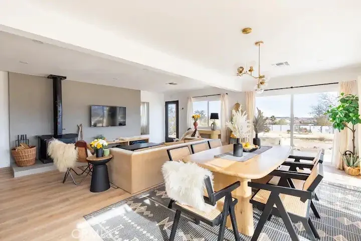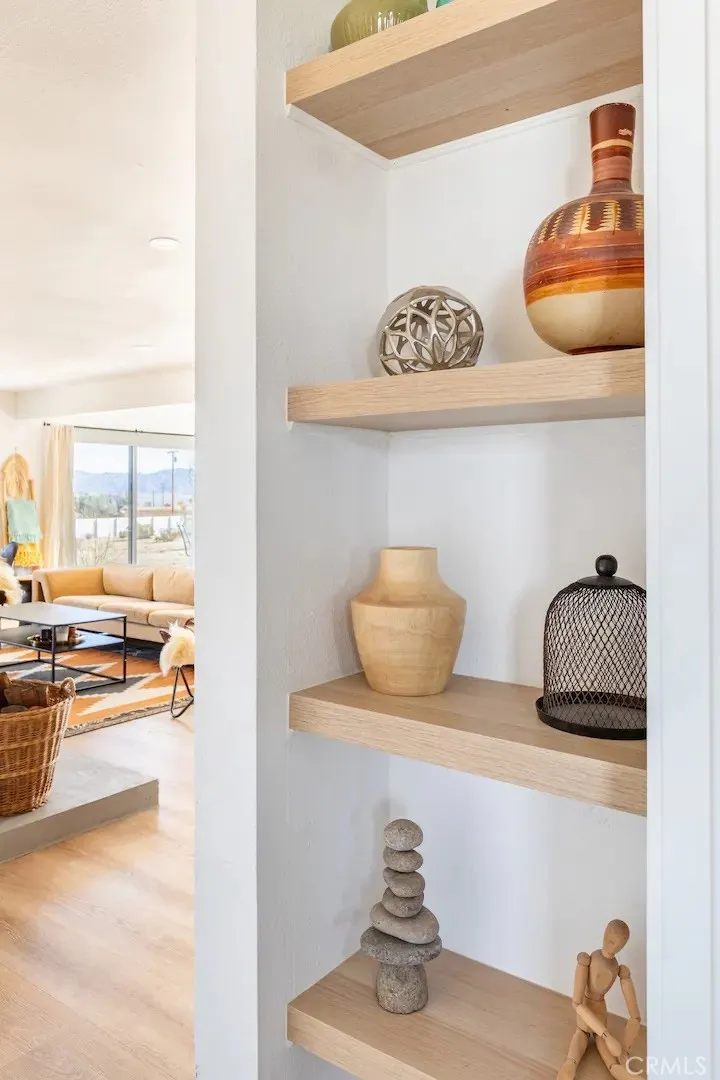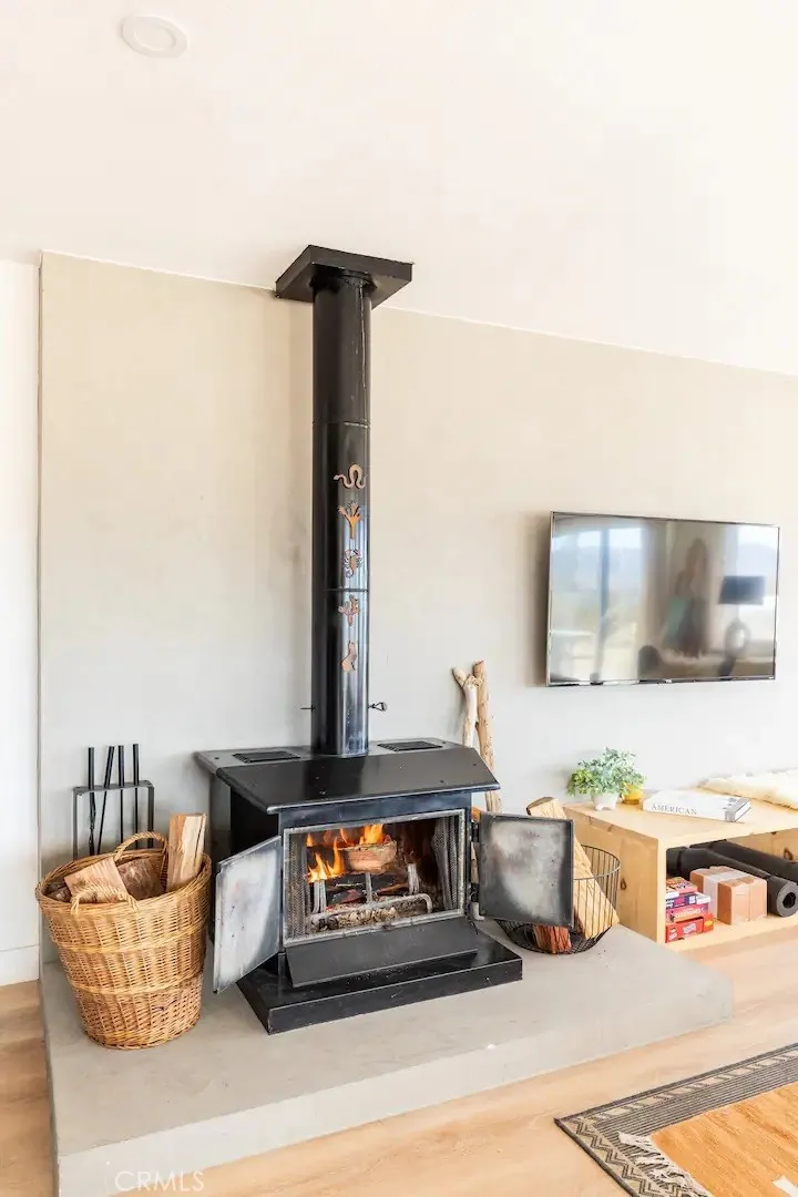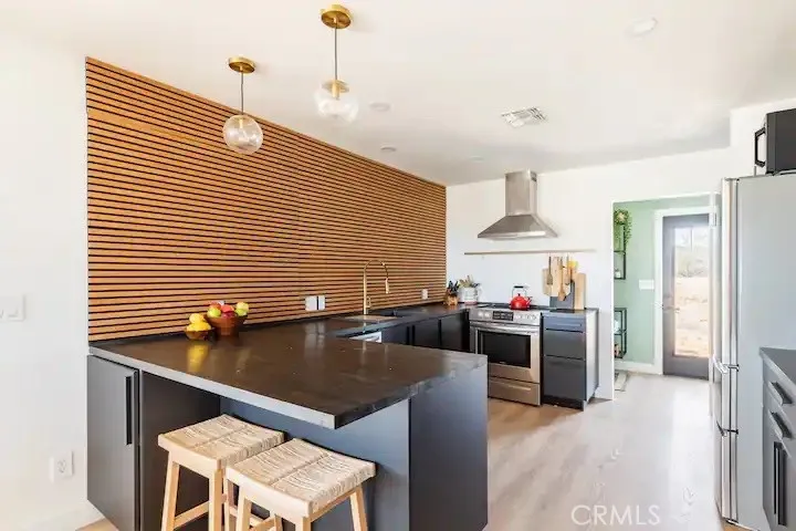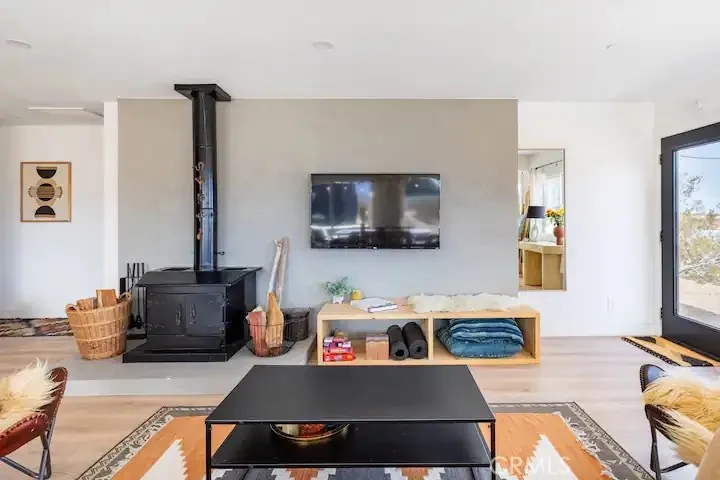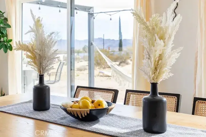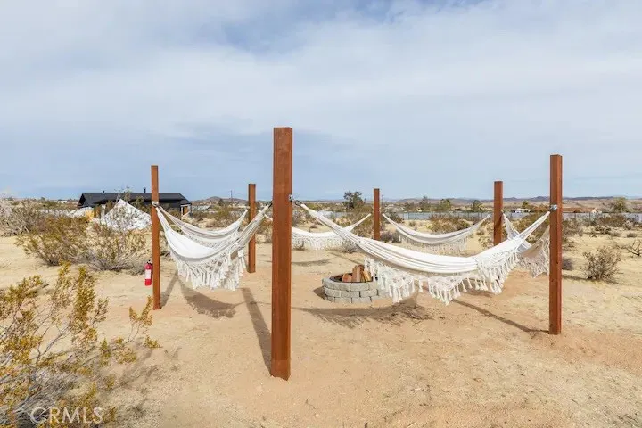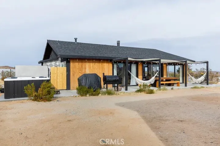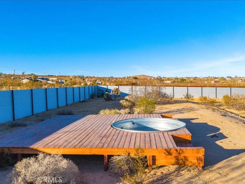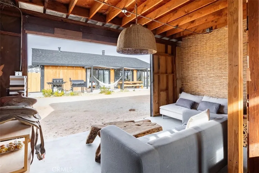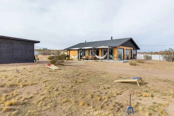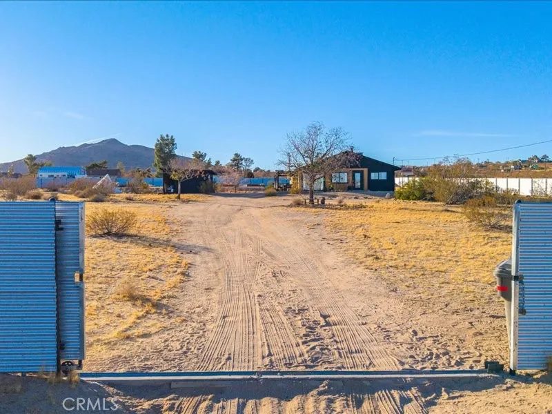 Welcome to Polaris Ranch! A fully gated, beautiful 2.5 acre horse property only 5 minutes from Downtown Joshua Tree, the property is close enough to all that Joshua Tree has to offer and far enough to provide you with the tranquility you seek in the desert. This designer gem offers a wide open floor plan with plenty of natural light, and with a living space that is perfect for entertaining. The living room features a hand troweled TV/entertainment wall upon which sits a wood burning fireplace to cuddle up by during the cool desert nights. The new modern kitchen will make any chef feel right at home and comes with all top rated appliances included. 3 spacious bedrooms, one of which connects to the en-suite bathroom that features double vanity sinks and a luxurious floor-to-ceiling tiled walk in shower. The other opens up to an al fresco secluded shower and soaking tub.a The fully re-designed exterior features a yurt, hammocks, cowboy pool and jetted jacuzzi. Also boasting Brazilian wood clad walls, a reed covered sun shade under which you can relax, and a courtyard that connects the main house to the workshop/shed that can be used for entertaining, an outdoor living space or your very own horse barn. (Note: Property consists of 2 lots that may have the ability to be split.)