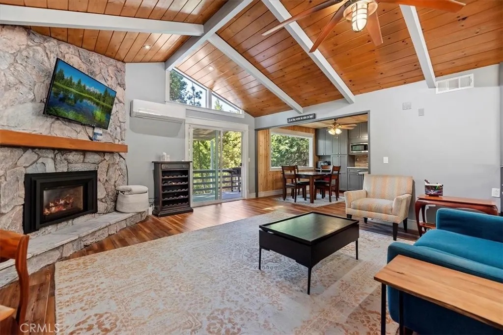 Updated by a professional journeyman carpenter, this smartly remodeled home has investment Possibilities in the Heart of Twin Peaks. This 3-level home features a level entry, a professionally installed whole-house generator, a 4-step water filtration system, solar panels (permitted), air conditioning, three parking spots, and a two-car garage, all located minutes from Lake Arrowhead, Blue Jay, and Crestline. Each level has its own entry, kitchen (or pre-plumbed kitchen), deck - perfect for Airbnb, bed & breakfast, or extended household setups. Step inside the level-entry main floor with its soaring wood-beamed ceilings, stone fireplace, and sleek remodeled kitchen. Enjoy comfort year-round with six mini splits, permitted solar panels, whole-house water filtration, and a professionally installed backup generator to power your large workshop. This home also features two luxurious en-suite bedroomsone with heated bathroom floors, a soaking tub, and serene forest views from every level all brand new 132k decking with Trex on the lower two levels. Play safely on the enormous (permitted) 20 x 60 ft. brand new deck. Live on one level and potentially rent from the other two levels With these smart upgrades, stunning views, and a flexible layout - this is more than a home, it is a launchpad for your future.