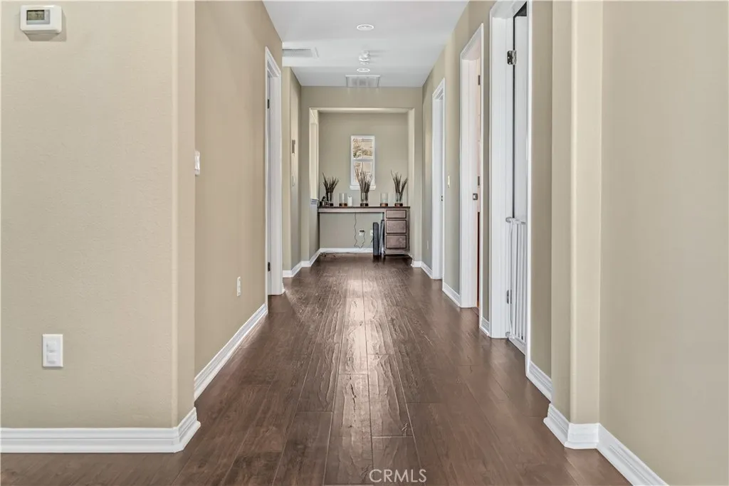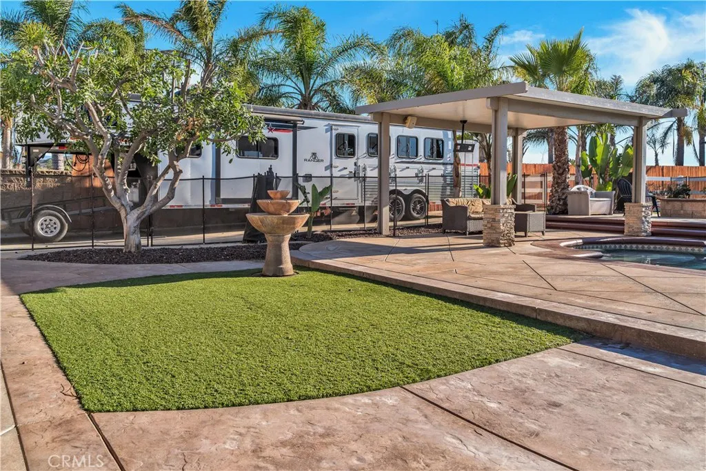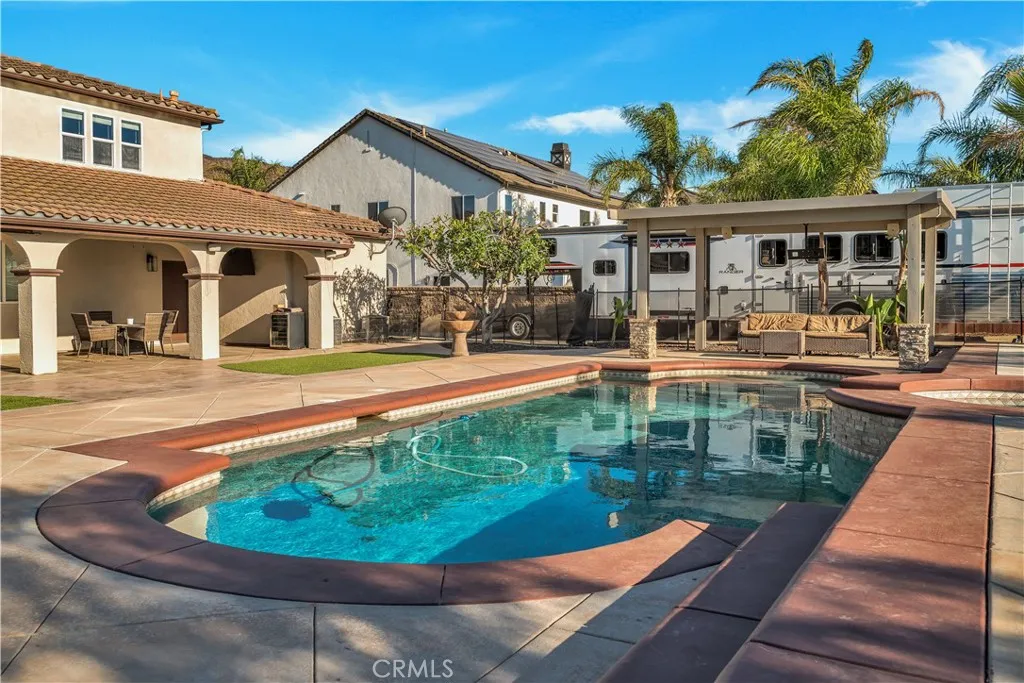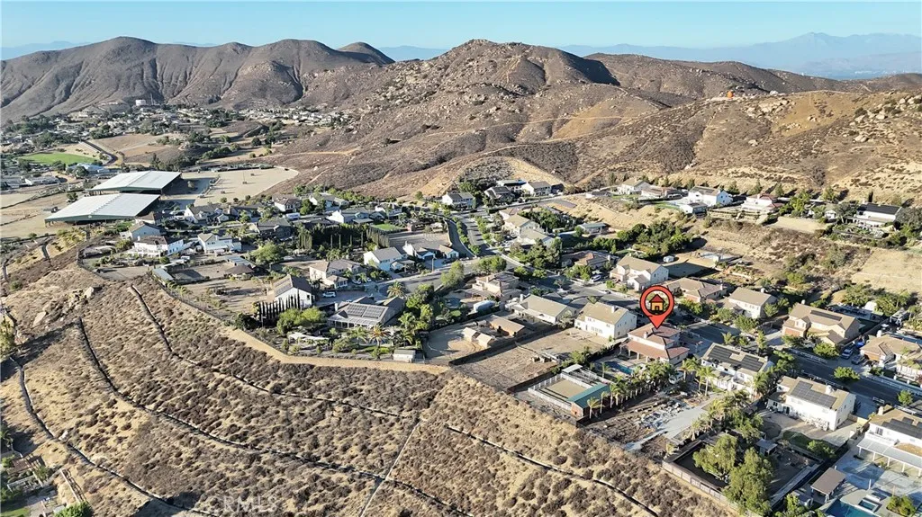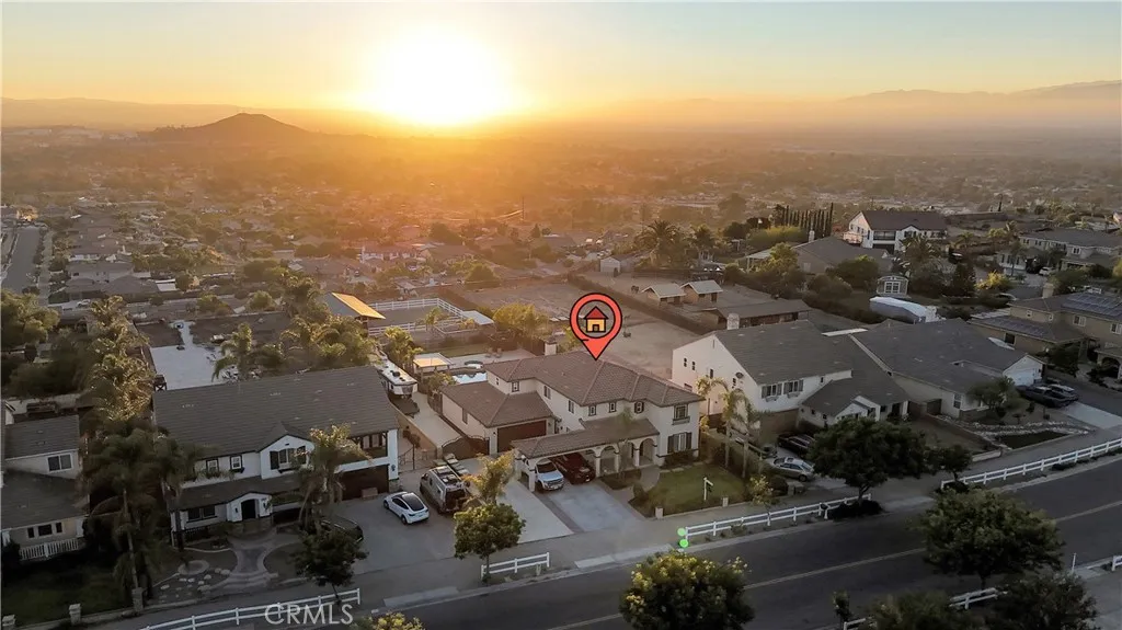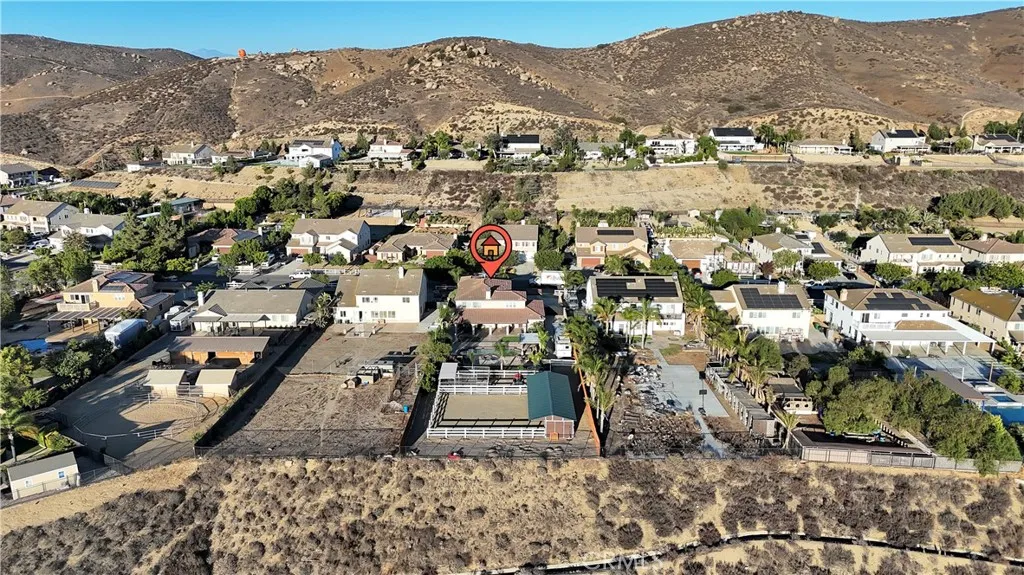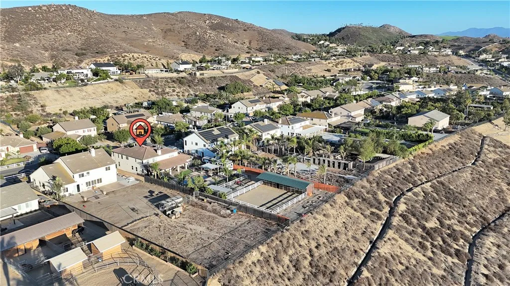Welcome to Norco Ridge Estates Where Luxury Meets Horse Property Living! This beautifully updated 5-bedroom, 3-bathroom home offers over 3,300 sq. ft. of well-designed space with fresh interior paint, hardwood floors, and eye-catching 18 diamond-pattern tile. Soaring cathedral ceilings greet you, leading into a formal dining room with a convenient butlers pantry and a spacious kitchen featuring granite counters and custom backsplash. The home includes a downstairs bedroom and full laundry room with sink and storage, plus an upstairs built-in desk/workstation and a master suite with breathtaking views, dual walk-in closets, and a large jacuzzi tub. Step outside to your private resort: a sparkling pool with waterfall spa, fire pit, artificial turf, a putting green, and retractable child safety gate. The oversized RV driveway (approx. 15 x 90) has 50-amp power and a direct sewer hookup. It is a short golf cart ride to Hidden Valley golf course. Horse lovers will appreciate the custom 4-stall barn with automatic waterers and fans, a 50 x 50 turnout, wash racks, and two additional pipe stallsfully separate from the pool area for peace of mind. Just a 10 minute ride or walk to Ingalls Park Event Center as well as Pumkin Rock. Enjoy covered parking, panoramic views of city lights and mountains, and room to live the lifestyle youve been dreaming of.