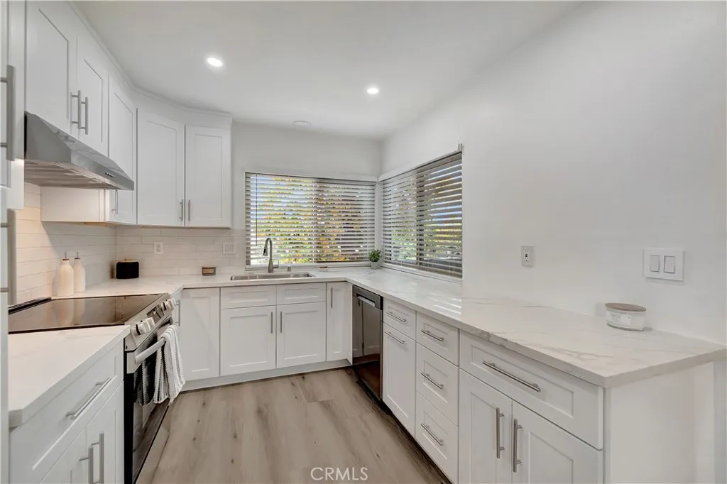 This beautifully remodeled condo is waiting for you! The kitchen has brand new solid wood cabinets with soft close doors along with stainless steel appliances and sink. Beautiful new quartz countertops and tile backsplash. Open floor plan with a spacious living and dining area. Beautiful new Luxury Vinyl Plank flooring throughout. There's a walk in laundry room with cabinets for extra storage. The bathroom has a brand new sink and vanity. The shower and bathtub is also new with beautiful tile. The primary bedroom is spacious and has a walk in closet with built ins for extra storage. The second bedroom is spacious with an attached closet. All the windows and screens are brand new and keep outside noise out. A brand new air conditioner has also been installed and is set up with a Nest system so you can turn it on and off with your phone. This is an upper unit that is by itself so you don't share any walls. There is a cozy patio in the front of the unit that is good for sitting outside or having a BBQ. Directly below the condo is 2 designated parking spaces with 6 large storage cabinets. This is going to go fast!