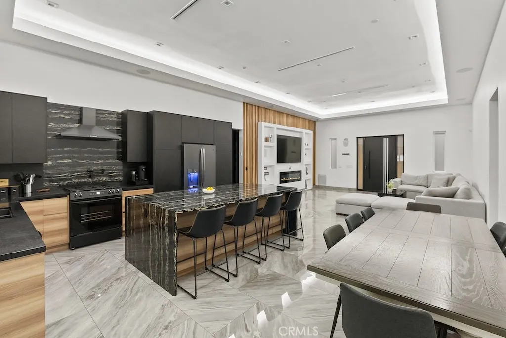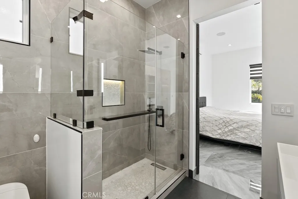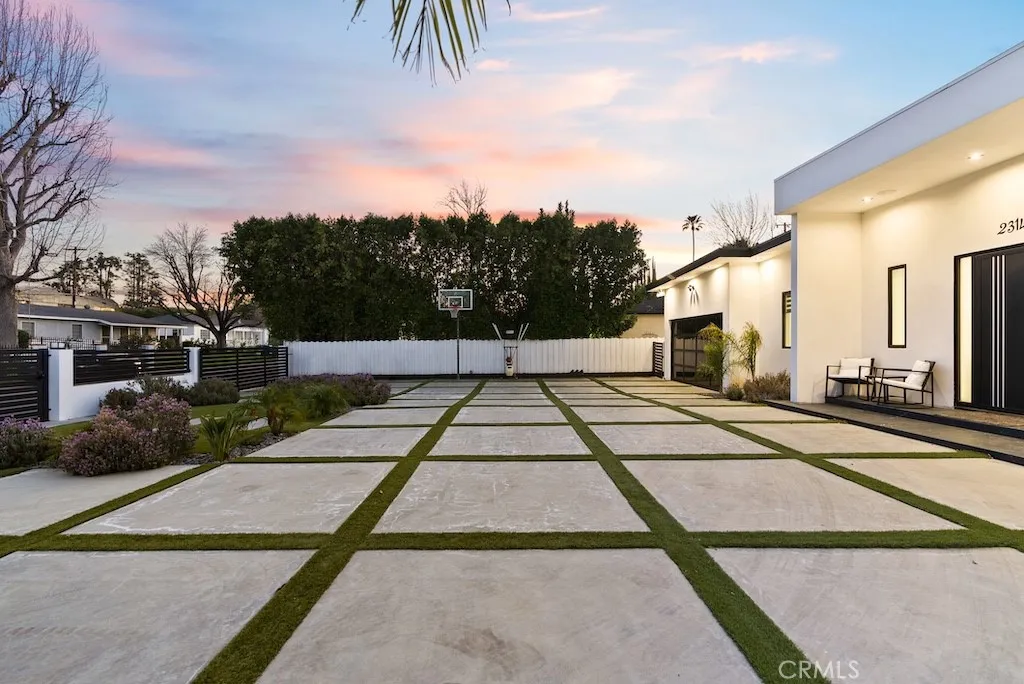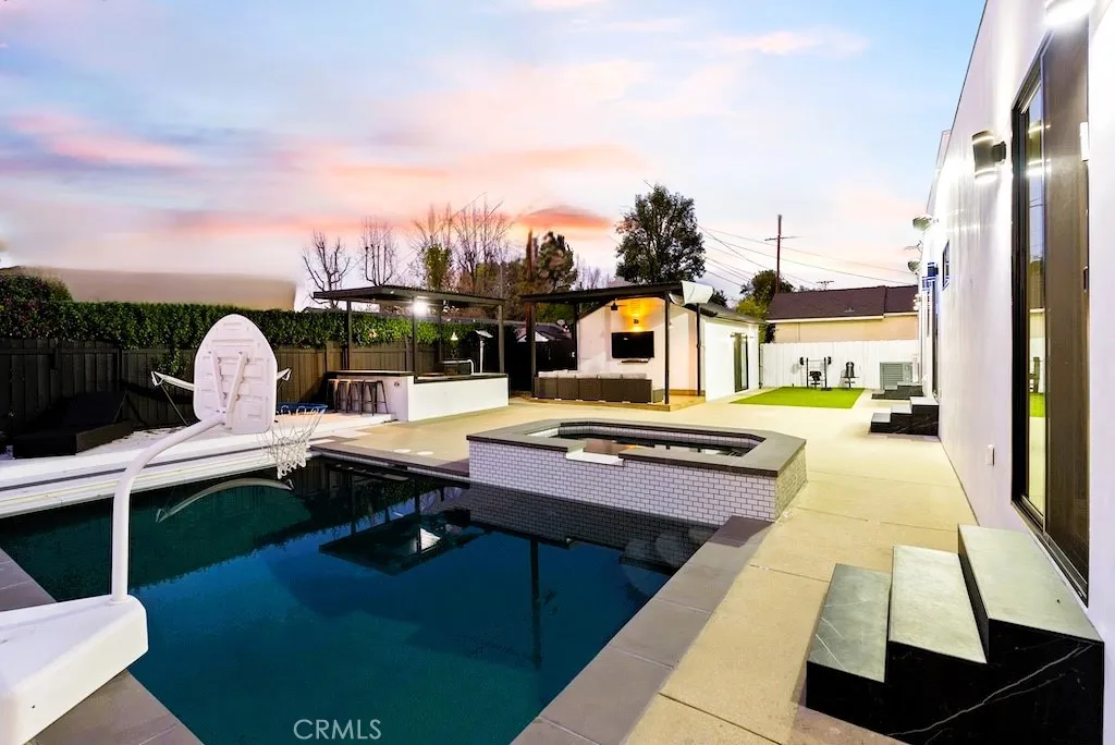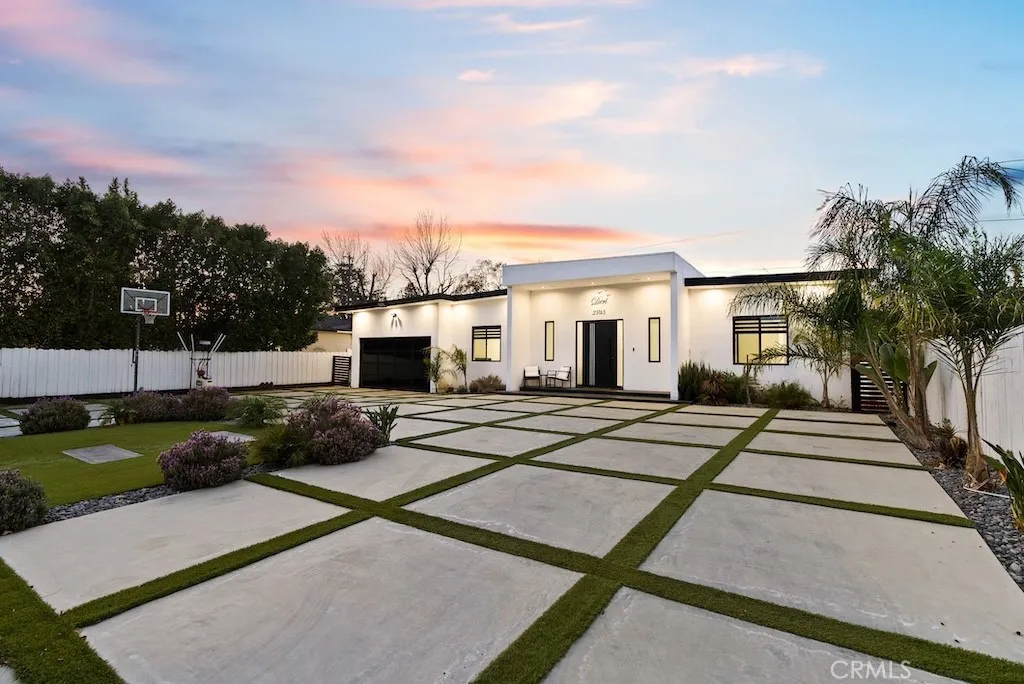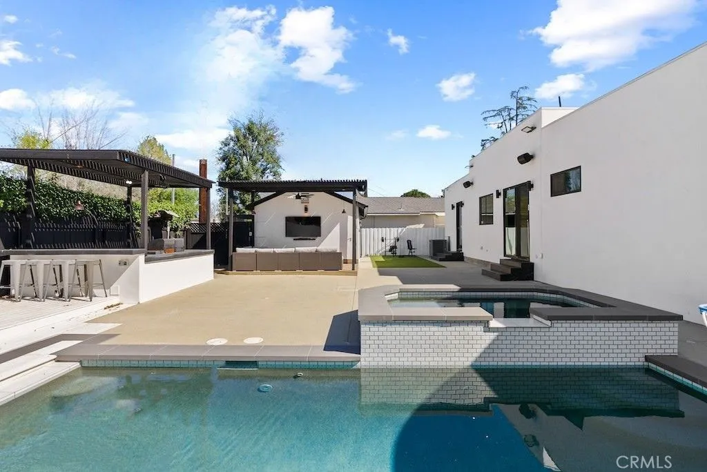 Welcome to this unique one-story modern masterpiece in the highly sought-after Walnut Acres Adjacent neighborhood of Woodland Hills. Fully rebuilt and reimagined, this expansive 3,300 sq. ft. estate offers 5 bedrooms and 4 bathrooms, including a detached guest house with 1 bedroom and 1 bathroom.From the moment you arrive, the electrical double-gated entry and circular driveway set the tone for privacy and elegance, providing parking for multiple vehicles, an RV, or even a boat. Step inside to a light-filled open floor plan with 14' soaring ceilings, bespoke Wisconsin hardwood accent walls, custom built-ins blended with soft LED lighting, and a striking modern fireplace that together create a warm yet sophisticated atmosphere. The chefs kitchen is designed for both beauty and function, complete with soft-close custom cabinetry, quartz countertops, a large island with breakfast bar, double sink, pot filler, high-end appliances, and plenty of workspace. The dining area, overlooking the backyard, creates the perfect setting for intimate dinners or lively gatherings. The primary suite is a serene retreat featuring vaulted ceilings, a massive walk-in closet, and a spa-inspired en-suite with dual faucets and a walk-in shower. Two spacious bedrooms share a modern Jack & Jill bath, while a junior suite offers its own walk-in closet & full bath. The detached guest house is a true bonus with its own fireplace, walk-in closet, and full bath, ideal for guests, a home office, gym, or rental income. Step outside to your private backyard paradise, a resort-style escape with a sparkling sa