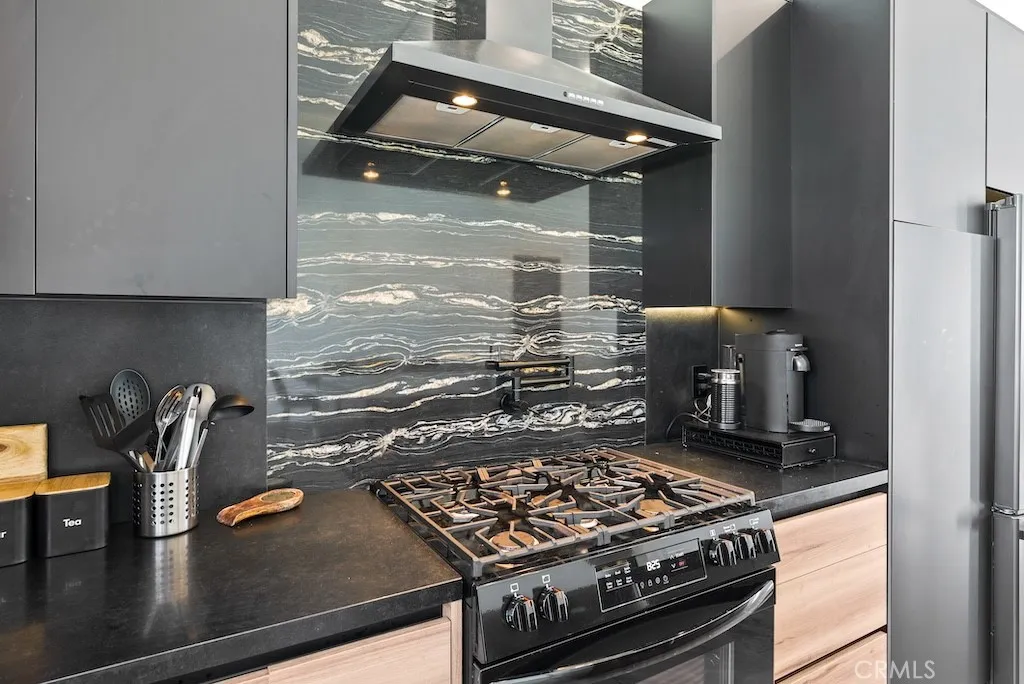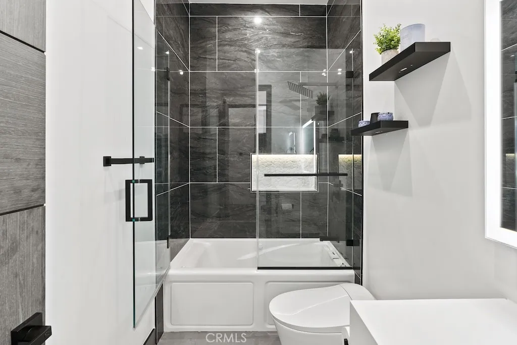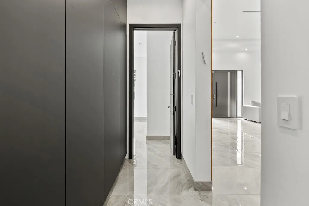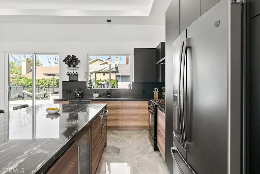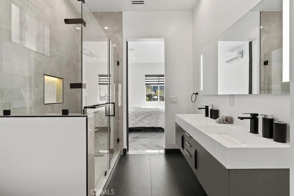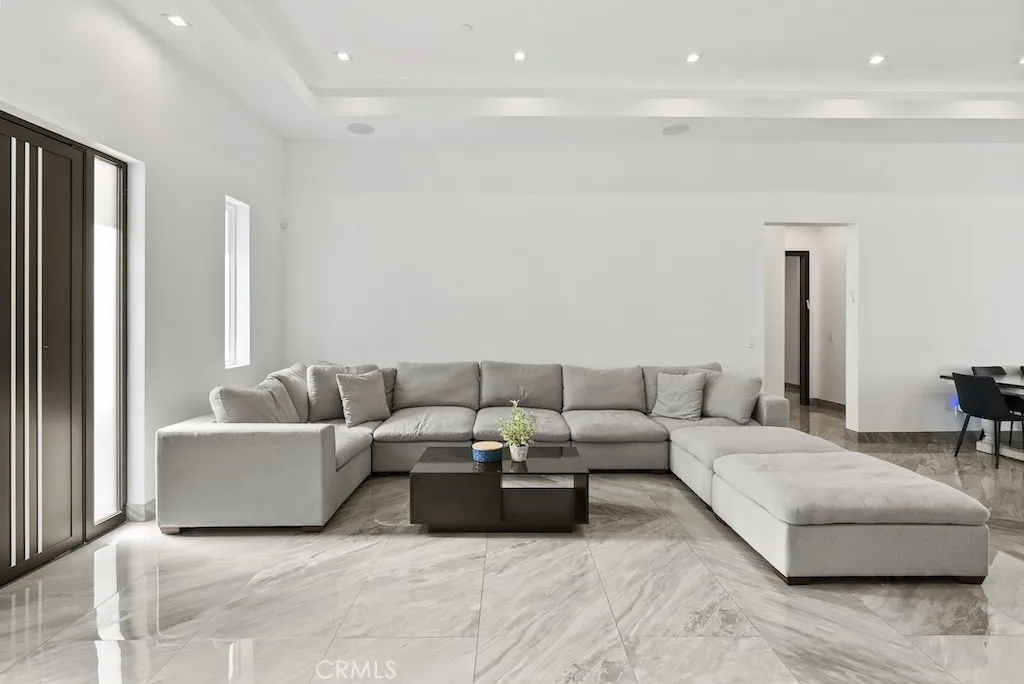 Welcome to this unique one-story modern masterpiece in the highly sought-after Walnut Acres Adjacent neighborhood of Woodland Hills. Fully rebuilt and reimagined, this expansive 3,300 sq. ft. estate offers 5 bedrooms and 4 bathrooms, including a detached guest house with 1 bedroom and 1 bathroom.From the moment you arrive, the electrical double-gated entry and circular driveway set the tone for privacy and elegance, providing parking for multiple vehicles, an RV, or even a boat. Step inside to a light-filled open floor plan with 14' soaring ceilings, bespoke Wisconsin hardwood accent walls, custom built-ins blended with soft LED lighting, and a striking modern fireplace that together create a warm yet sophisticated atmosphere. The chefs kitchen is designed for both beauty and function, complete with soft-close custom cabinetry, quartz countertops, a large island with breakfast bar, double sink, pot filler, high-end appliances, and plenty of workspace. The dining area, overlooking the backyard, creates the perfect setting for intimate dinners or lively gatherings. The primary suite is a serene retreat featuring vaulted ceilings, a massive walk-in closet, and a spa-inspired en-suite with dual faucets and a walk-in shower. Two spacious bedrooms share a modern Jack & Jill bath, while a junior suite offers its own walk-in closet & full bath. The detached guest house is a true bonus with its own fireplace, walk-in closet, and full bath, ideal for guests, a home office, gym, or rental income. Step outside to your private backyard paradise, a resort-style escape with a sparkling sa