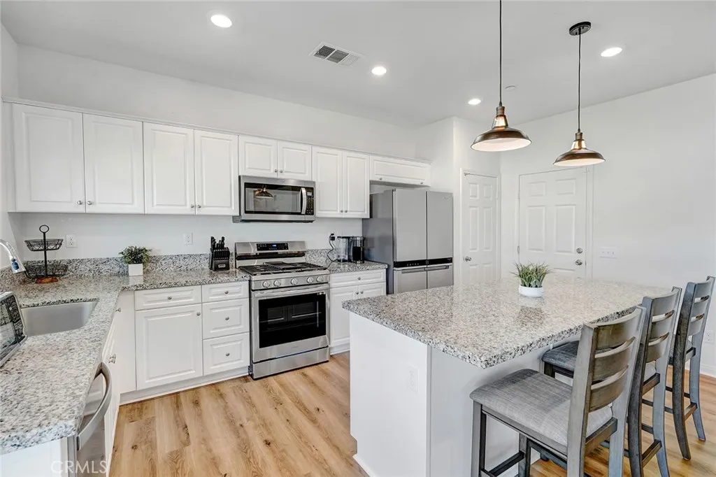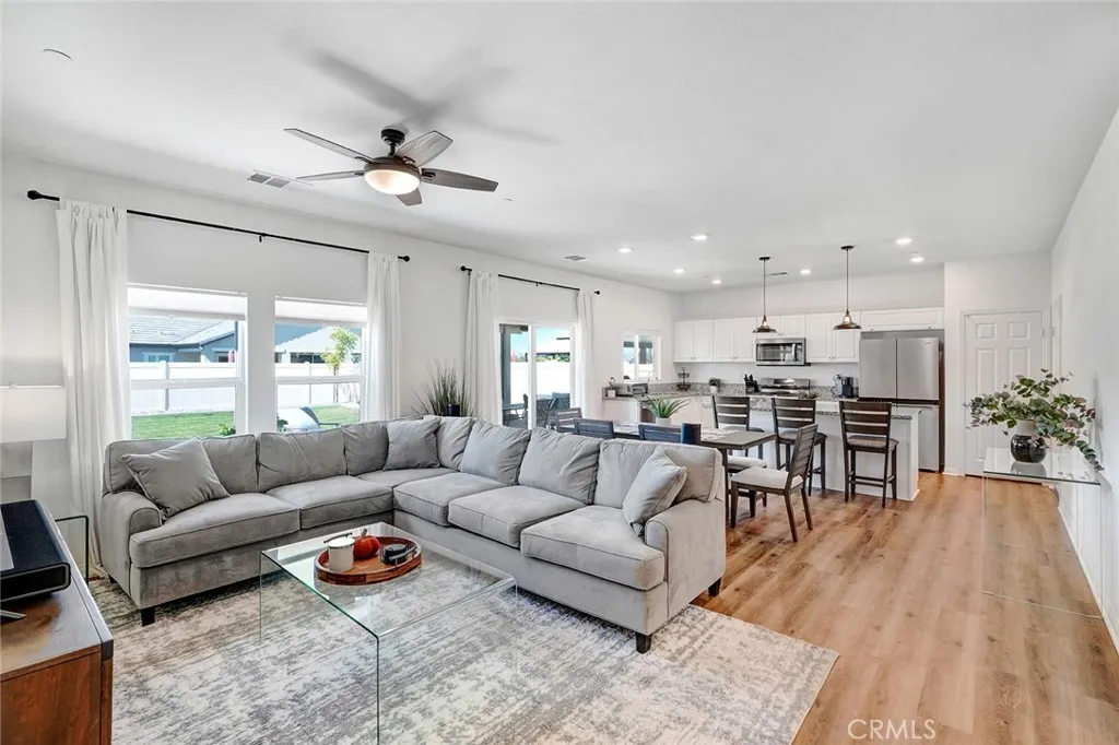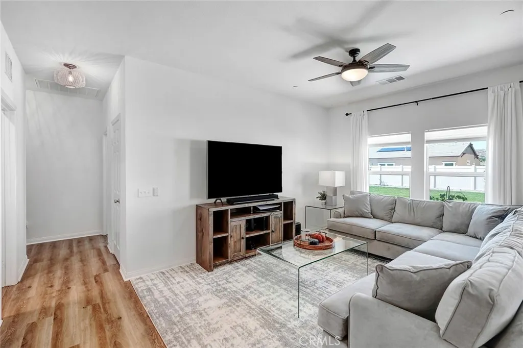 *SELLER PAID ESCROW**ALL UPGRADED APPLIANCES INCLUDED* Dynamic turnkey home with desirable layout and upgrades including irrigated sprinkler system in the front and rear, dusk to dawn automatic sensor lighting, concrete walkways on both sides of property and solar panels. With 3 gorgeous bedrooms, 2 bathrooms and a dedicated laundry room - there's plenty of room for yourself, family and guests. The open-concept living area is perfect for all your entertaining needs, and the kitchen is modern and svelte. An oversized island ties the open concept from living room to kitchen with stunning modern, granite countertops. The vinyl laminate flooring throughout is contemporary for no-fuss cleaning. Don't let the square footage fool you - the floorplan and layout is tasteful without wasting a single square foot. An elegant, open patio permitted for pool construction with electrical outlets (including outlets on the upper frame for string lighting) graces the austere and well kept backyard. Additional features include UV privacy tint windows (you can see out; they can't see in), a tankless water heater and a 50amp power source in the garage for electric vehicles with (4) 1000lbs tolerance hanging, garage storage racks and the icing on this cake is *entire home water filtration* through the dedicated water softening tank AND a *reverse osmosis* tank for potable/drinking water. Everything from the solar panels, sprinkler system to the water filtration is FULLY PAID. The Hidden Hills community has walking trails with trail workout equipment, a park, and a tennis court - you'll have plent