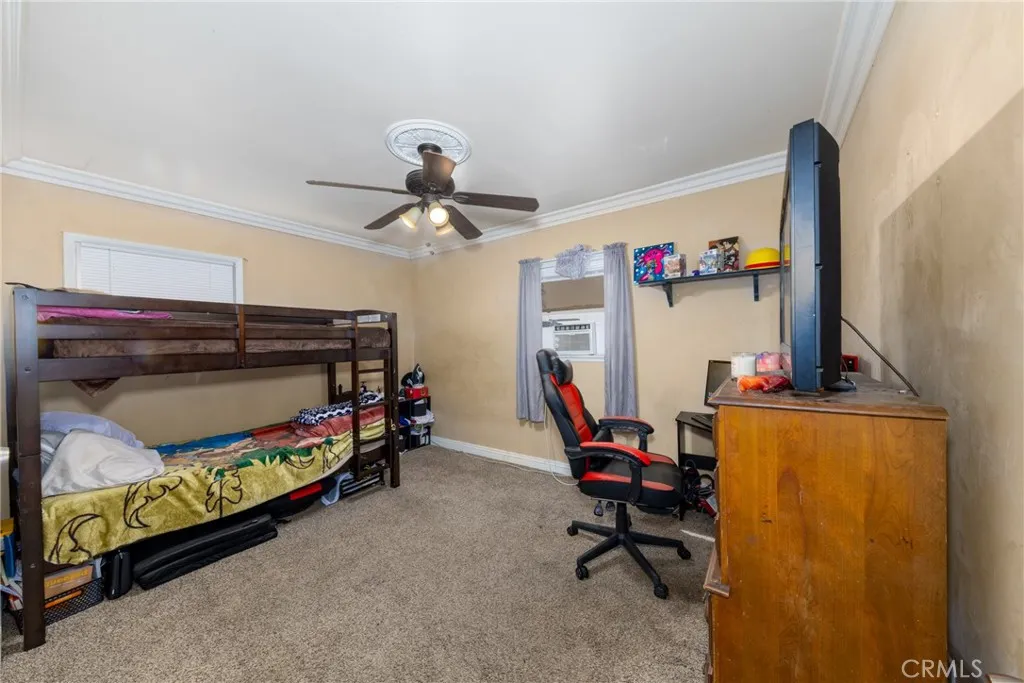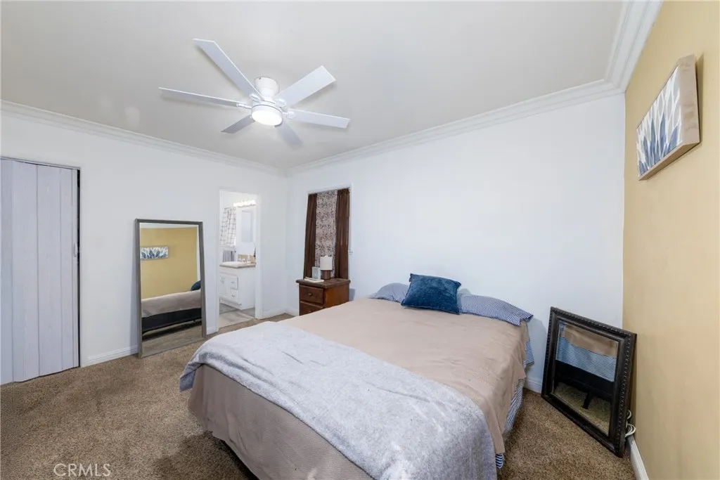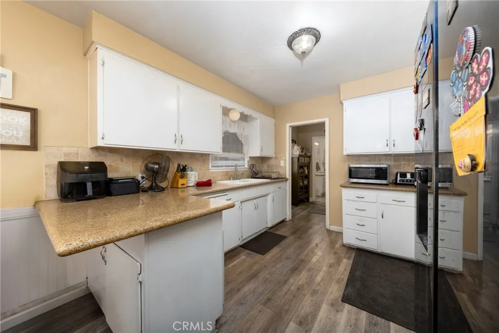 Charming home with stylish light fixtures, eat in kitchen dining area, granite counter tops in the kitchen and both bathrooms, tile flooring in the bathrooms, hardwood flooring in living room and hall, and stylish waterproof wood-laminate in kitchen and laundry room, carpet in all bedrooms. Nice fireplace in the living room, upgraded crown molding throughout, and baseboards/casings. The yard features mountain views, lots of space for gatherings, a fire pit, and requires minimal upkeep. Located near Arrowhead Country Club Golf Course, in a desirable neighborhood. North San Bernardino home situated on an attractive, tree-lined street. This home offers three bedrooms, two bathrooms, a detached two-car garage, and an extended driveway with RV parking.