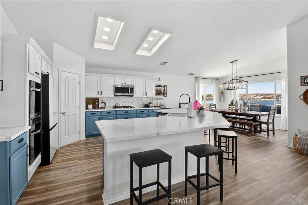 BREATHTAKING PANORAMIC LAKE VIEWS AND SURROUNDING MOUNTAINS! Are you searching for your ideal lakeside retreat? This charming property features 3 bedrooms, 2.5 bathrooms, and a dedicated office space currently used as a bedroom, located in the exclusive Silver Lakes neighborhood of Helendale, California. Homes with direct open water access are rare, and this one stands out with exceptional appeal. Recently updated, the property includes a modern kitchen with new quartz countertops, marble backsplash, a farmhouse sink, recessed lighting, and brand-new appliances such as a Samsung Bespoke fridge, dual ovens, gas stovetop, microwave, and dishwasher. The bathrooms have been improved with updated fixtures and quartz surfaces. Luxury vinyl plank flooring extends through most of the home, with bathrooms excluded. Additional upgrades include a water softener, hot tub, lighting and plumbing improvements, enhanced electrical system, Tesla charging station, fully owned solar panels, pergola with a misting system for warm summer days, and new interior paint. The home is equipped with eight surveillance cameras. Enjoy beautiful views from the rear deck. A private dock is ready for your boat or water equipment. This home is absolutely stunning. Silver Lakes is a private community located between Victorville and Barstow. Monthly association fees provide access to many amenities, including a 27-hole golf course designed by Ted Robinson, tennis courts, bocce ball, pickleball, a clubhouse, library, Olympic-style pool, splash area for children, fitness center, RV parking and storage, horse st