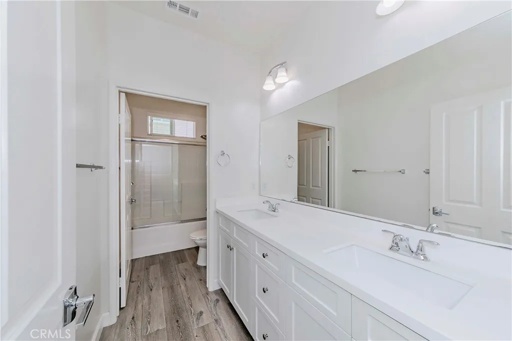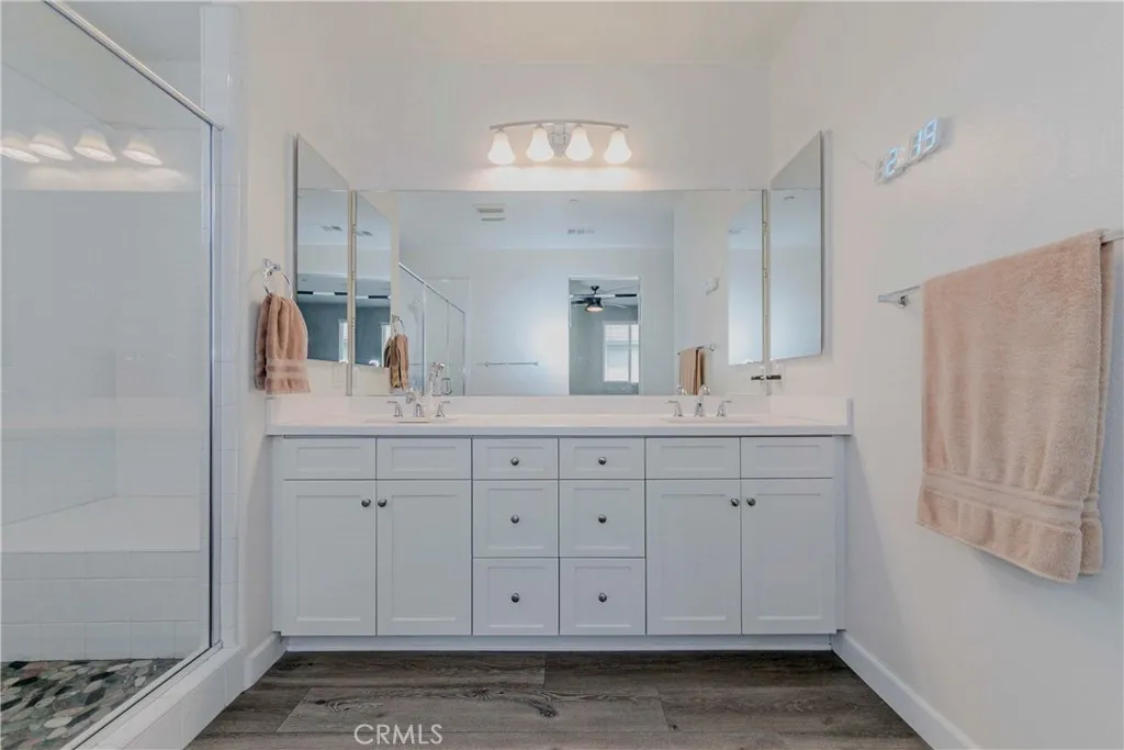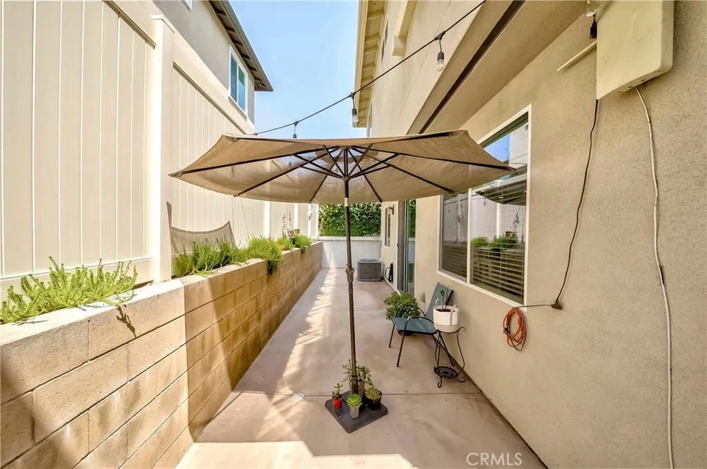 Stylish Modern Home Built in 2018 Move-In Ready This beautifully designed 3-bedroom, 2.5-bath single-family residence (not a detached condo) offers 1,872 sq. ft. of comfortable, contemporary living. Completed in 2019, this two-story home blends sleek modern design, an open-concept layout, and high-quality finishes throughout. Step inside through the extra-wide entry foyer with a coat closet. Be greeted by high ceilings and the easy-care elegance of durable Luxury Vinyl Plank flooring with upgraded flat baseboards throughout. The spacious living/great room flows seamlessly into a gourmet kitchen with an island, white cabinetry, granite counters, stainless steel appliances (range, microwave hood, dishwasher), recessed lighting, and a window over the stainless steel sink overlooking the private, paved patio perfect for outdoor entertaining. A convenient downstairs powder room accommodates guests with ease. An elegant staircase with white risers leads to the upper level, adding a touch of brightness and contrast. The south-facing primary suite is filled with natural light and features a ceiling fan, built-in cabinet nook, walk-in closet, and a spacious bathroom with dual sinks and a glass-enclosed shower with a built-in tile seat. Two additional bedrooms include one with a walk-in closet and one with mirrored closet doors, both with ceiling lights. The hallway bathroom offers dual sinks and a glass-enclosed tub. An upstairs laundry room with built-in overhead cabinets adds everyday convenience. The attached garage with direct access features high ceilings. This home is also o