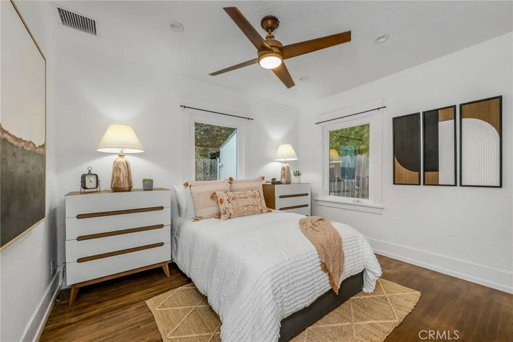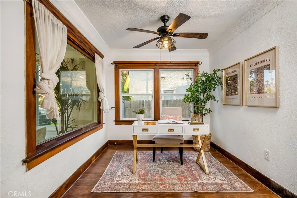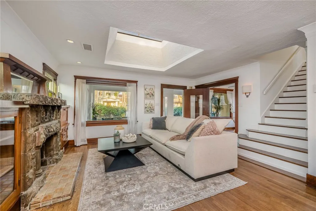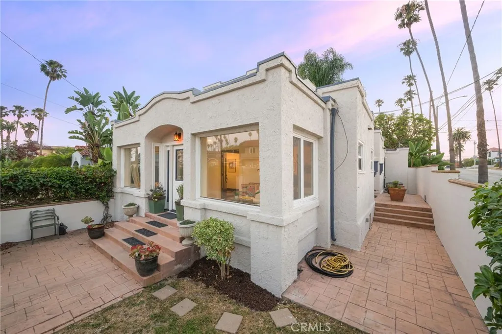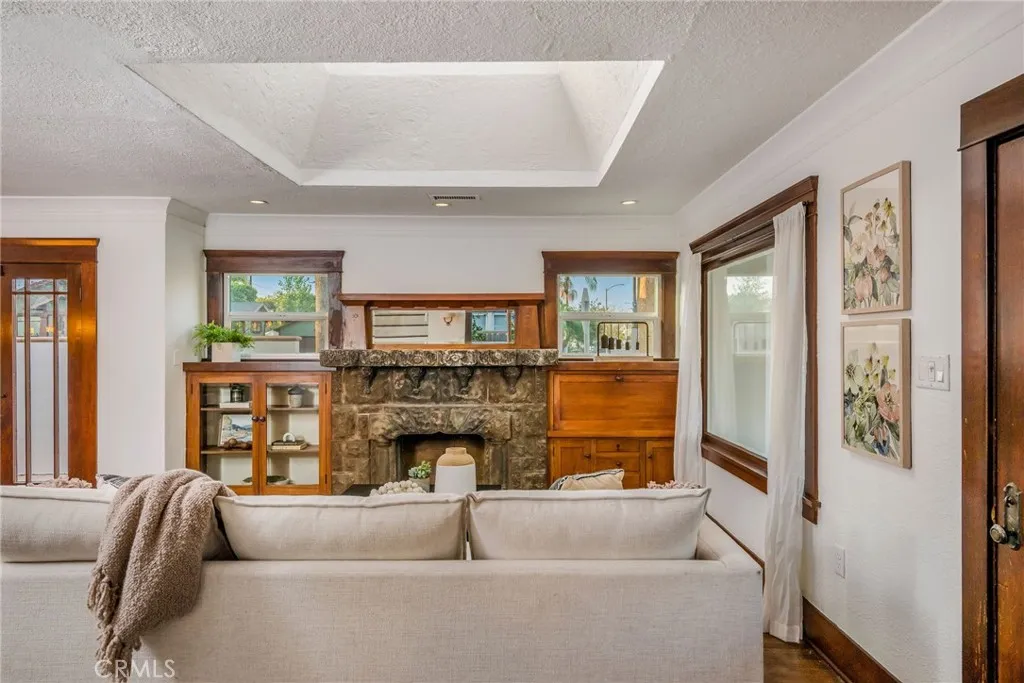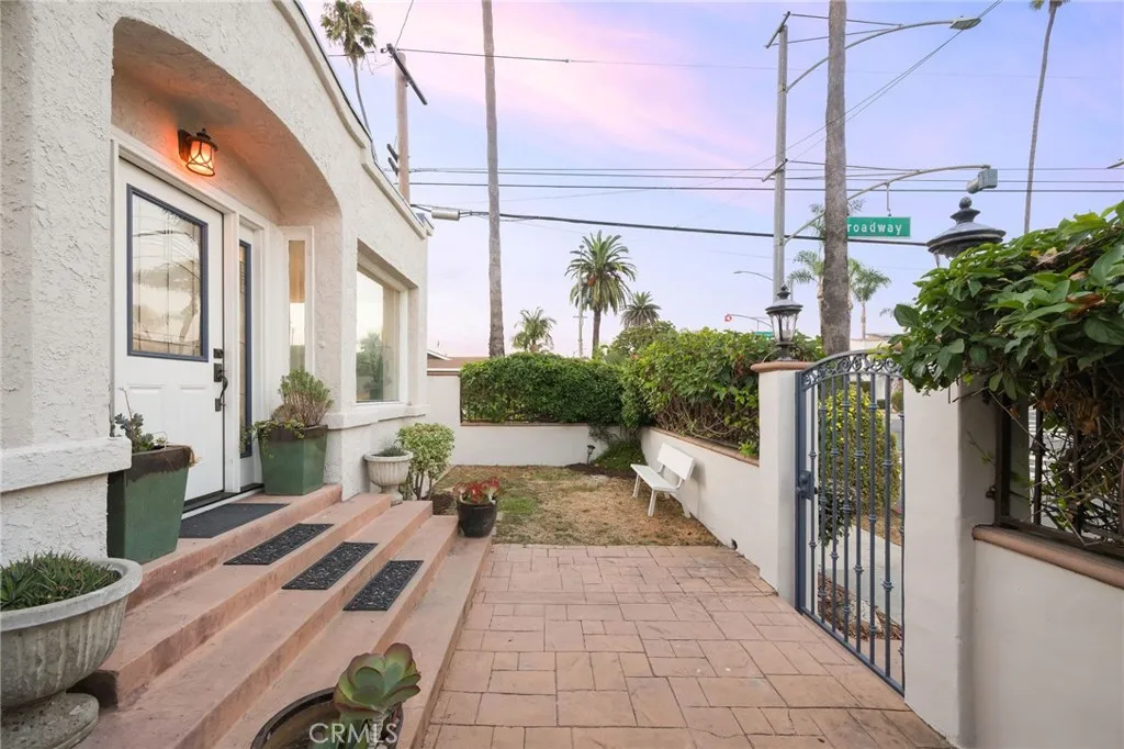Welcome to 227 Ximeno a rare blend of timeless 1920s character and thoughtful updates in the heart of Belmont Heights. From the moment you step through the gated, hedged courtyard, youre greeted by the inviting original sunroom. To the left, a versatile den makes the perfect home office; to the right, an impeccably preserved 1922 concrete fireplace mantle, built-in desk, and cabinetry showcase the homes history. The open floor plan is bathed in natural light from a large skylight above, with the dining area flowing seamlessly into the first of two living rooms and a spacious kitchen offering generous counter space. Down the hall are two comfortable bedrooms, a conveniently placed laundry nook, and a beautifully maintained period bathroom any vintage-home enthusiast will appreciate. A single-car garage with additional laundry and storage opens to Broadway, while three more parking spaces off Ximeno ensure ample parking for residents and guests. Upstairs reveals one of the homes most distinctive features a striking room with beamed ceilings, a fireplace, ductless AC, and a peek-a-boo ocean view. The adjoining half bath and rooftop deck create an ideal entertaining area or a potential en suite retreat. All of this is just moments from award-winning schools, the beach, shops, and everything else that makes Belmont Heights so desirable. This is truly a unique and special home.
