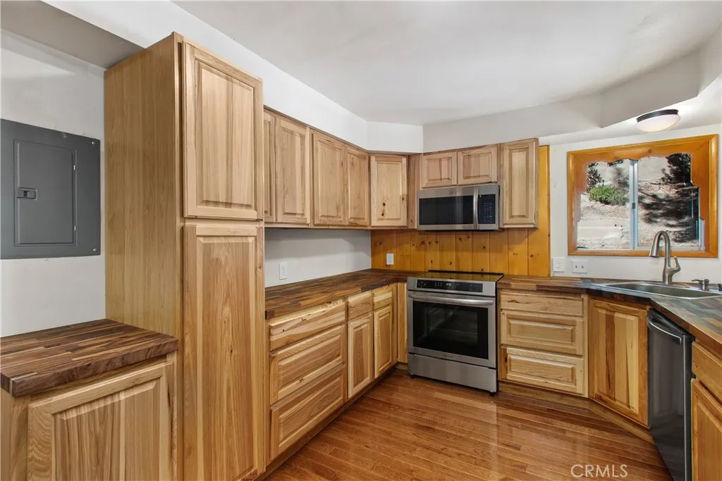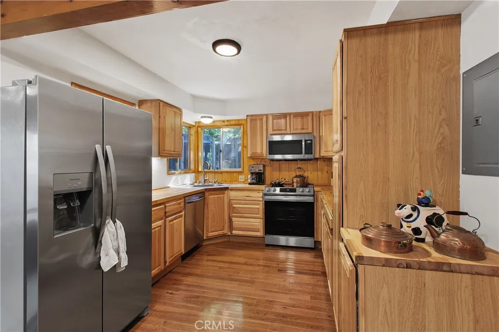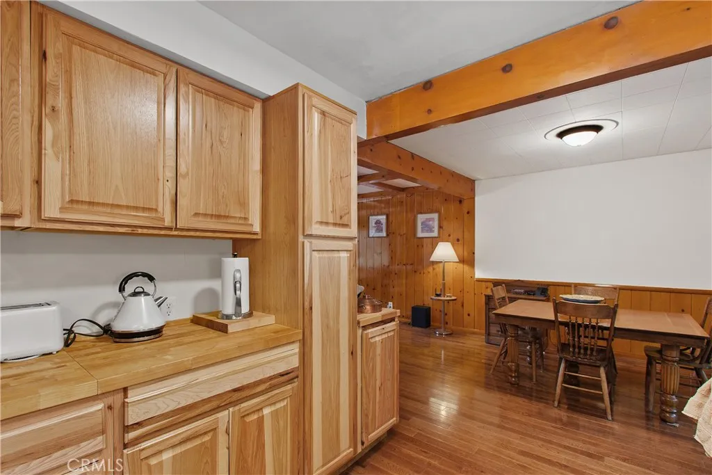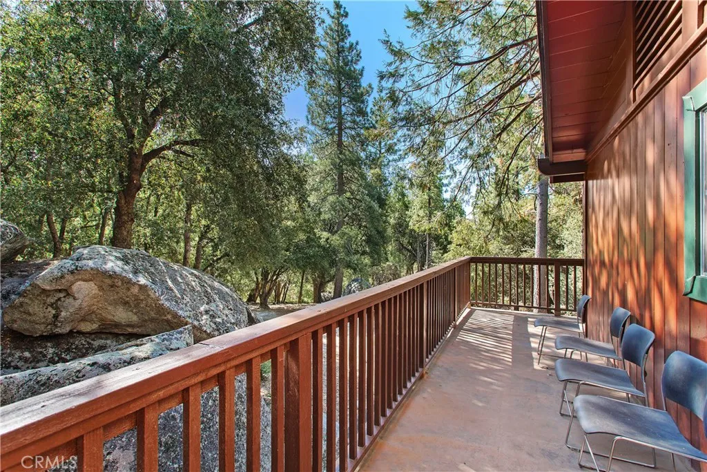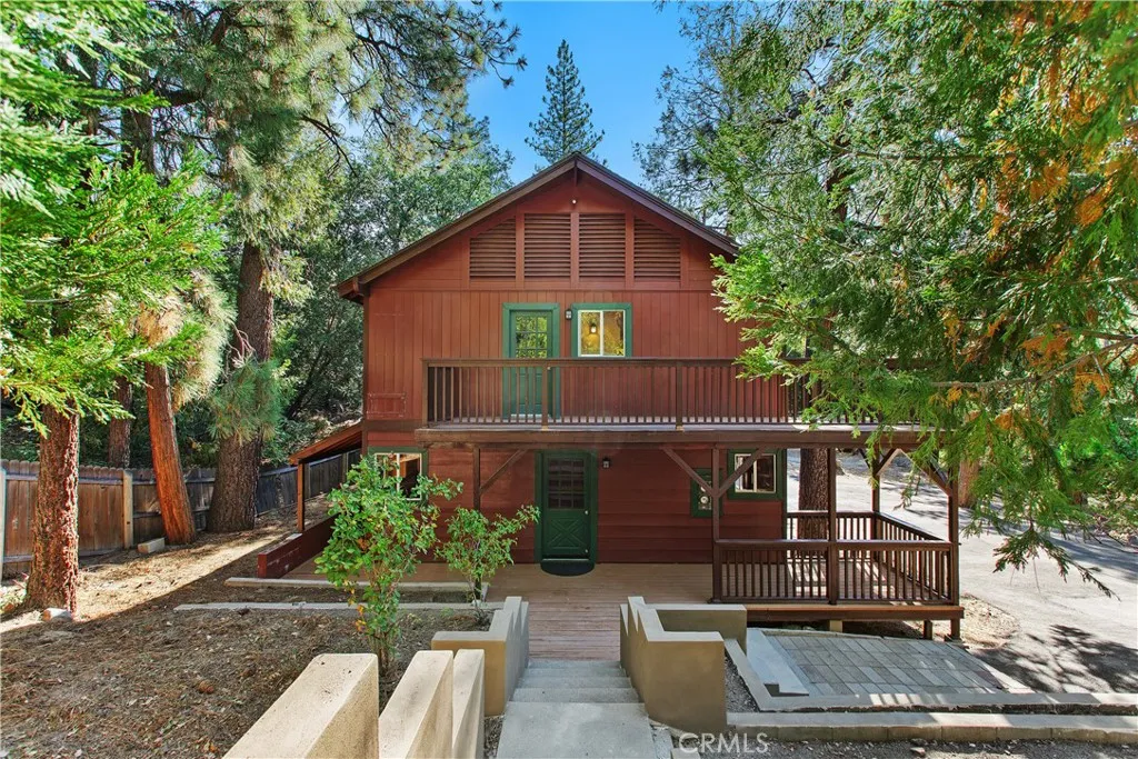 Presenting an attractive Cedar Glen duplex-style retreat with a private driveway bringing you below the main street level. The property features an ample parking pad adjacent to the residence for convenient access. The home is a single-family residence set up as a duplex with two identical units sharing a single wall, each with its own private entrance. Each of the units offers 2 bedrooms, 1 full bath, a fireplace, an updated kitchen, and a spacious second-story balcony. With just over 1,100 square feet of living area in each unit, there is plenty of room to enjoy these fully renovated spaces. You can live in one unit and rent the other, or rent both for maximum income. Custom-installed hickory wood flooring lends a warm, mountain-inspired atmosphere throughout the interiors. The kitchens are enhanced with butcher block countertops, new hickory cabinetry, modern appliances, and updated sinks. The living areas benefit from newly refinished, tongue-and-groove pine walls, a pine coffered ceiling, a wood-burning fireplace, and an open floor plan, creating a bright and welcoming environment. Upstairs, residents will find new stackable washers and dryers on the landing and access to the expansive balconies. The bedrooms feature hickory flooring, mirrored closet doors, and scenic views of the surrounding forest. The rooms are generously sized and receive ample natural light. The bathrooms have also been updated with new vanities and tile in the shower/tub enclosures. The exterior grounds include a patio area and terraced stairs leading from the street level. The sale includes the