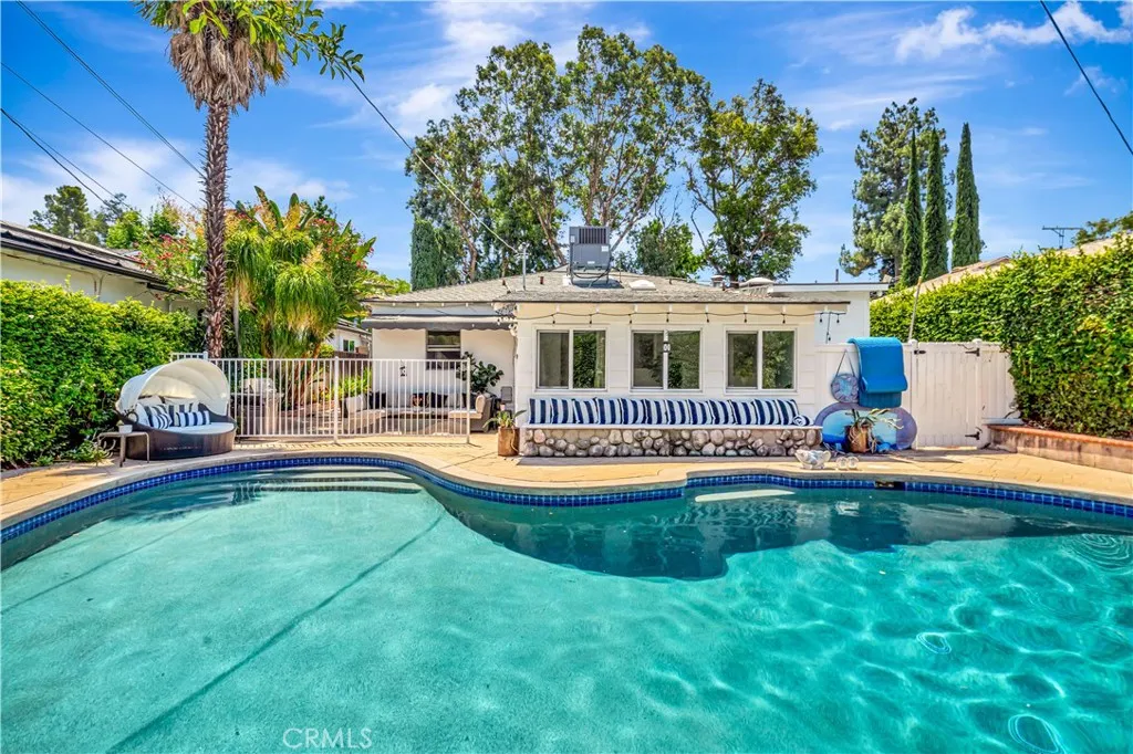 Private Resort-Style BEAUTFUL Pool Home South of the Boulevard in Woodland Hills. Welcome to 21907 De La Osa Street, a charming home with 1,535 sq ft of living space, with an open and flexible modern floor plan! The curb appeal is wonderfully manicured to perfection with the charm of a modern farm house, luscious green grass and adorable white fencing. This lovely home is as prettty as a picture! Inside, youll find a bright, comfortable layout with well-defined living spaces, offering both function and character. The previous owner opened up the third bedroom to create a versatile room that provides the perfect space for a home office, a large dining room or playroom, tailored to fit your lifestyle. Currently this stunning pool home is set up as a 2 bedroom, a home office, a huge family room plus a dining area and living room. A buyer can easily create a third bedrrom again. The home flows to the backyardyour own completely private resort retreat. The Pebble Tec pool sparkles under the sun, surrounded by lush landscaping and tall privacy barriers so you can relax and entertain without a single neighbors view. Smart features include 20 solar panels that are paid off and about 3 years old, an EV charger, security cameras and security doorbell. All of this is tucked away South of the Boulevard, located near award winning schools, upscale shops and well known restaurants as well as being minutes from the beach. This is a rare opportunity to own a warm, inviting pool home with exceptional privacy in one of the Valleys most desirable locations. You will be enchanted and impressed