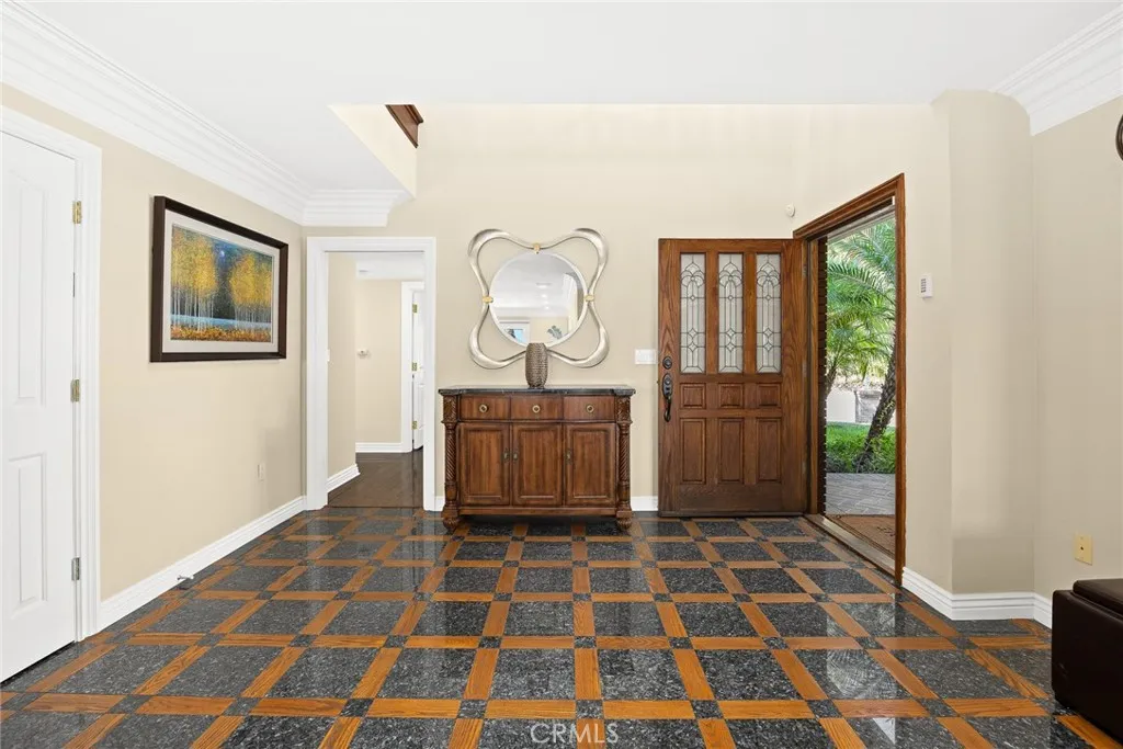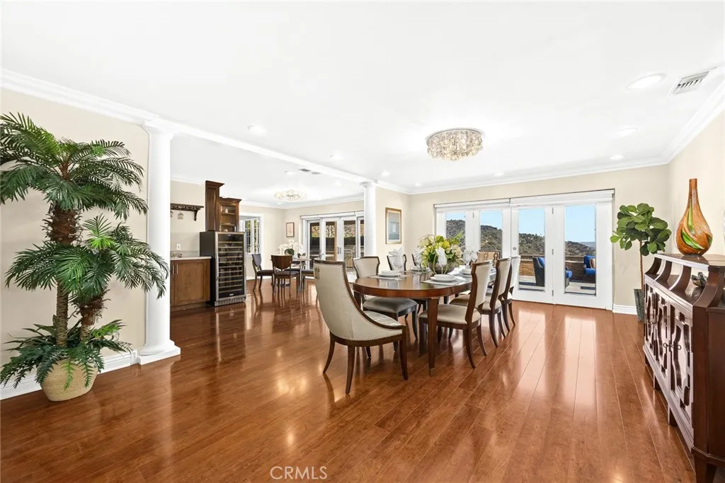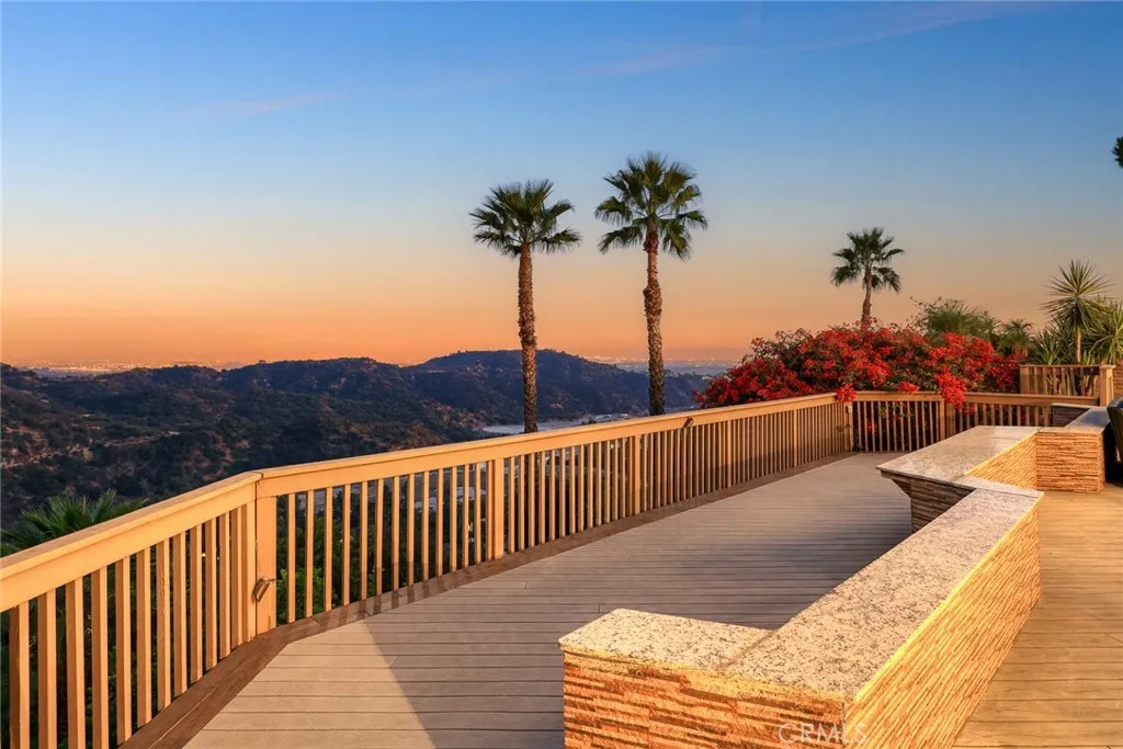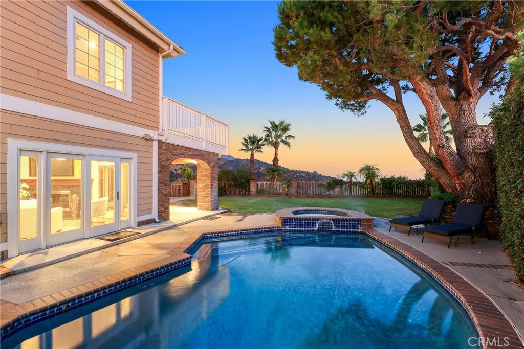 This spectacular view home, nestled in Arcadia's highly desirable Highland Oaks neighborhood, is part of the prestigious Arcadia School District and exemplifies Southern California living with expansive panoramic views of the gardens, mountains and city lights. Situated on a hilltop, this beautifully updated estate offers the perfect combination of serenity, breathtaking views and privacy. As you approach the home you're welcomed by a meticulously landscaped front yard and a paved circular driveway leading to an elegant entry. The artistry of marble inlay flooring graces the entry and living room, which seamlessly integrates indoor and outdoor spaces through walls of glass windows framing the stunning landscapes. The bright family room, with views of the pool and canyon, opens onto a large outdoor patio, perfect for entertaining. Anchored by two gas fireplaces, one in the living room and another in the family room, this home exudes warmth and comfort. The formal dining room and breakfast room, both featuring walls of glass, continue showcasing gorgeous scenic canyon views. Additional features include a large recreation room and beautiful wood floors throughout the living areas, enhancing the home's natural charm. Originally built in 1959 then rebuilt in 1991, this expansive 6,103 sq. ft. estate offers 8 bedrooms, 7.5 bathrooms, with 5 en-suite bedrooms upstairs and 1 en-suite downstairs. The primary suite elevates luxury with a fireplace, direct access to a sun-deck patio, two large walk-in closets, and a spa-like bathroom with a soaking tub offering incredible canyon views