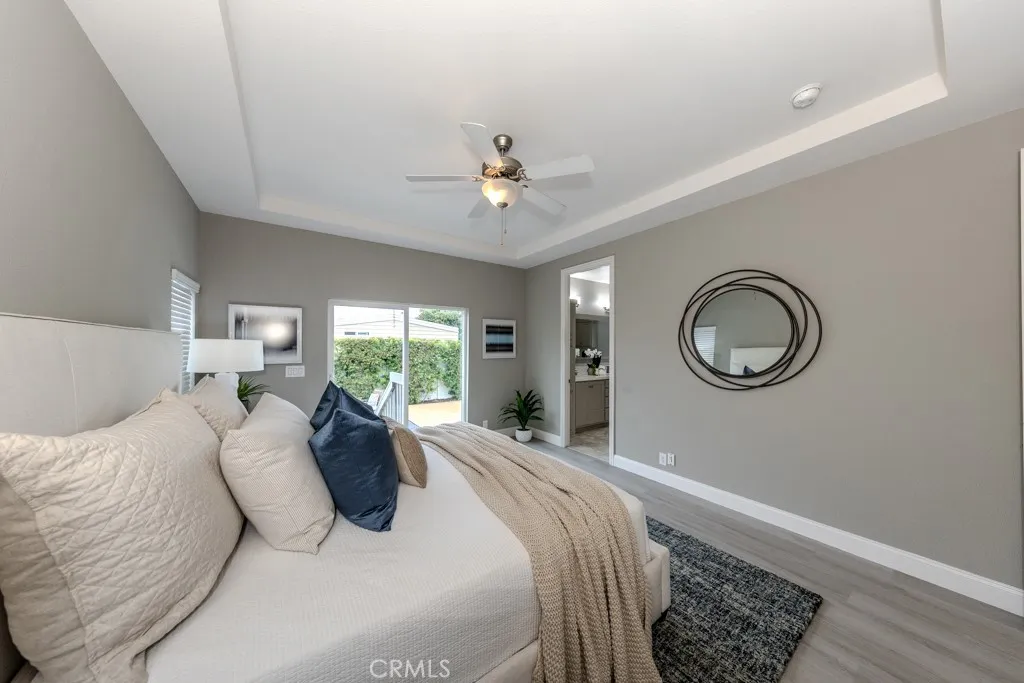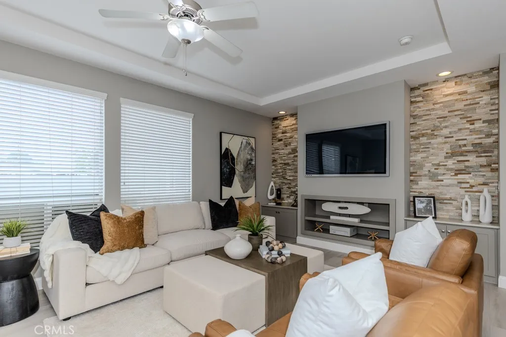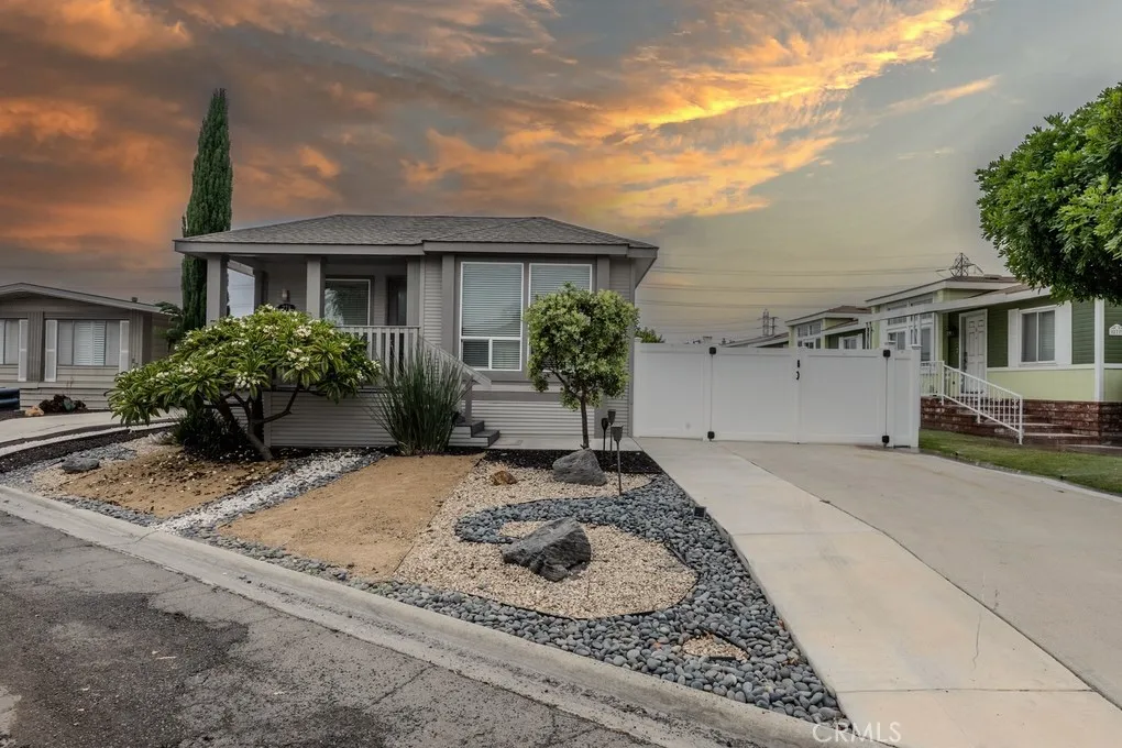3595 Santa Fe Ave #278, Long Beach, located in Windward Village, a community of manufactured homes with land ownership. Built in 2017, this three-bedroom, two-bath home is set on one of the largest lots in the community at 5,719 square feet. Positioned on a corner lot for added privacy, it features a covered front porch and landscaped entry that create strong curb appeal. A wide driveway, plus gated side parking for up to four cars, adds versatility. Inside, the entry opens to a spacious great room where the living room, kitchen, and dining area connect under 9-foot ceilings with recessed lights, skylights, and laminate wood flooring. The kitchen features a waterfall quartz island with seating, a built-in microwave drawer, pull-out storage drawers, a stainless steel range with double oven, a pot filler faucet, a range vent, under-cabinet lighting, a farm sink, a walk-in pantry, and ample cabinetry. The dining area sits in a cove off the kitchen, while the living room offers a ceiling fan, built-in lower cabinets, and a stacked stone accent wall. The primary bedroom includes a ceiling fan, a walk-in closet with a solar tube, and a sliding glass door to the backyard. The en suite bath has dual sinks, stone counters, linen cabinets, a deep soaking tub, and a walk-in tiled shower with a seating bench. Two additional bedrooms offer carpet, ceiling fans, and wall outlets ready for mounted televisions. The guest bath includes a walk-in tiled shower with a seating bench and stone counters. The laundry room is inside, with cabinets for storage. The backyard is larger than typical fo