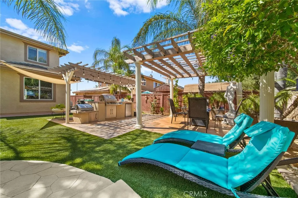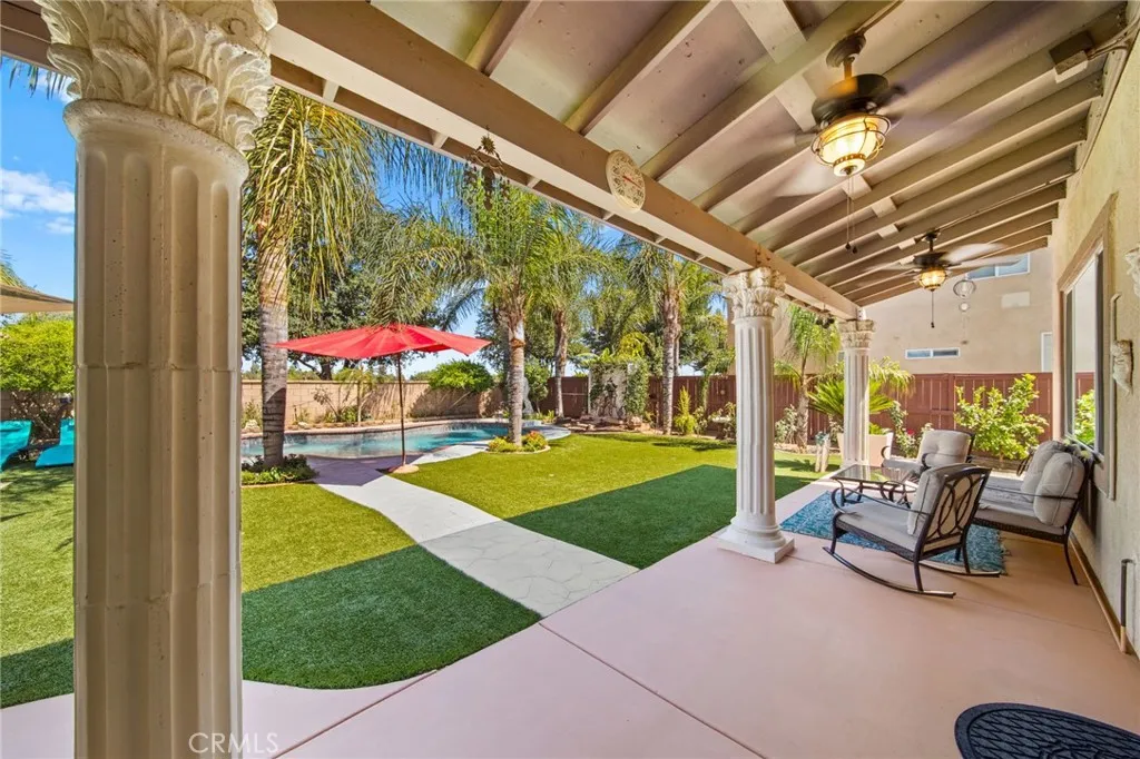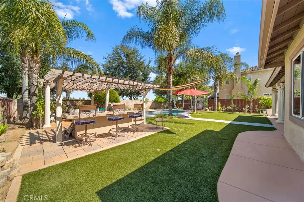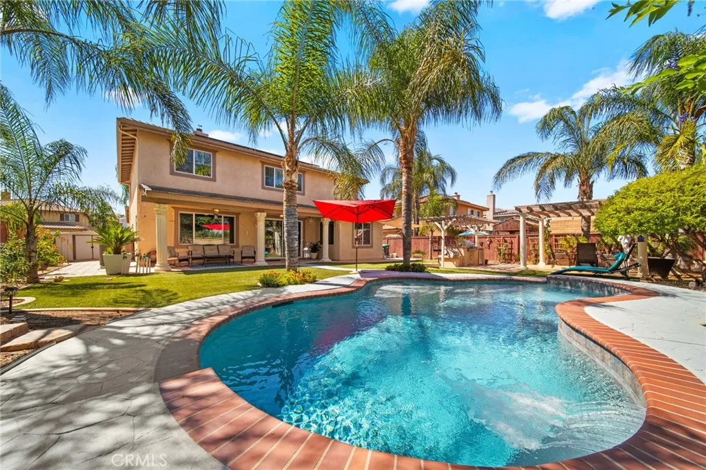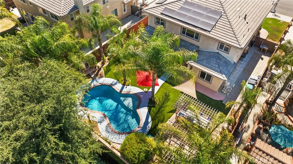 Welcome to this meticulously maintained home, purchased directly from the builder and built in 2005. This spacious two-story residence offers 4 bedrooms, 3 bathrooms, and 2,743 sq. ft. of living space on a 7,405 sq. ft. lot. The home features a bedroom and bathroom on the first floor, ideal for guests or multi-generational living. The dining area is currently set up as an office, and all windows are polarized for comfort and privacy. Step outside to a resort-style backyard with a built-in pool resurfaced approximately two years ago, turf, two patio covers, two built-in propane BBQs, and two ceiling fans, perfect for entertaining. Potential space on both sides of the home offers RV or vehicle storage (buyer to verify suitability and compliance). Inside, enjoy ample natural light throughout the home. The primary bedroom upstairs is expansive with flexible space, ideal for an additional bedroom, nursery, or office. Two of the upstairs bedrooms share a balcony, each with their own access doors, and there is a spacious den upstairs as well. A built-in desk is conveniently located in the hallway. The living room features a cozy fireplace, and the kitchen boasts a custom island with seating, built-in oven, dishwasher, and opens to the living room. The laundry room is located downstairs with built-in shelving. The primary bathroom includes a huge walk-in closet, soaking tub with a custom privacy window, double sinks, and a vanity area. The interior was freshly painted last month, and the home includes 18-panel leased solar for energy efficiency. With a tandem 3-car garage and abund