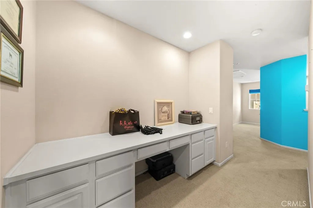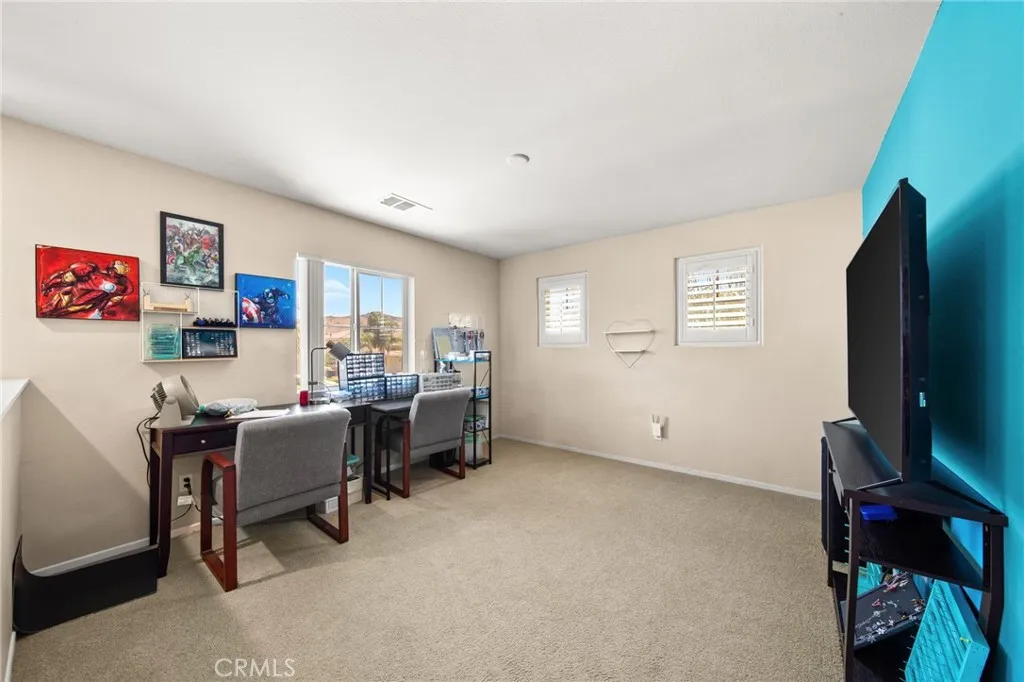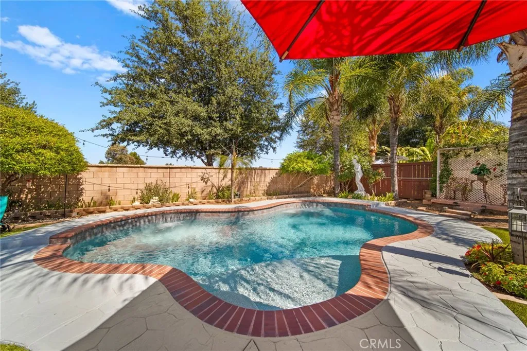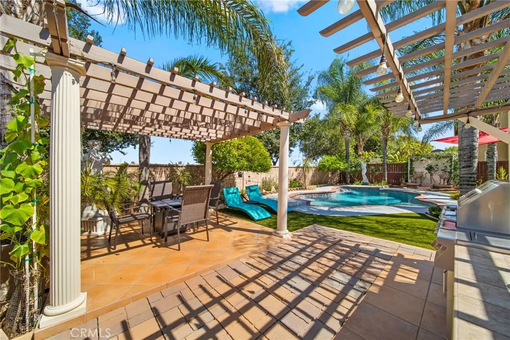 Welcome to this meticulously maintained home, purchased directly from the builder and built in 2005. This spacious two-story residence offers 4 bedrooms, 3 bathrooms, and 2,743 sq. ft. of living space on a 7,405 sq. ft. lot. The home features a bedroom and bathroom on the first floor, ideal for guests or multi-generational living. The dining area is currently set up as an office, and all windows are polarized for comfort and privacy. Step outside to a resort-style backyard with a built-in pool resurfaced approximately two years ago, turf, two patio covers, two built-in propane BBQs, and two ceiling fans, perfect for entertaining. Potential space on both sides of the home offers RV or vehicle storage (buyer to verify suitability and compliance). Inside, enjoy ample natural light throughout the home. The primary bedroom upstairs is expansive with flexible space, ideal for an additional bedroom, nursery, or office. Two of the upstairs bedrooms share a balcony, each with their own access doors, and there is a spacious den upstairs as well. A built-in desk is conveniently located in the hallway. The living room features a cozy fireplace, and the kitchen boasts a custom island with seating, built-in oven, dishwasher, and opens to the living room. The laundry room is located downstairs with built-in shelving. The primary bathroom includes a huge walk-in closet, soaking tub with a custom privacy window, double sinks, and a vanity area. The interior was freshly painted last month, and the home includes 18-panel leased solar for energy efficiency. With a tandem 3-car garage and abund