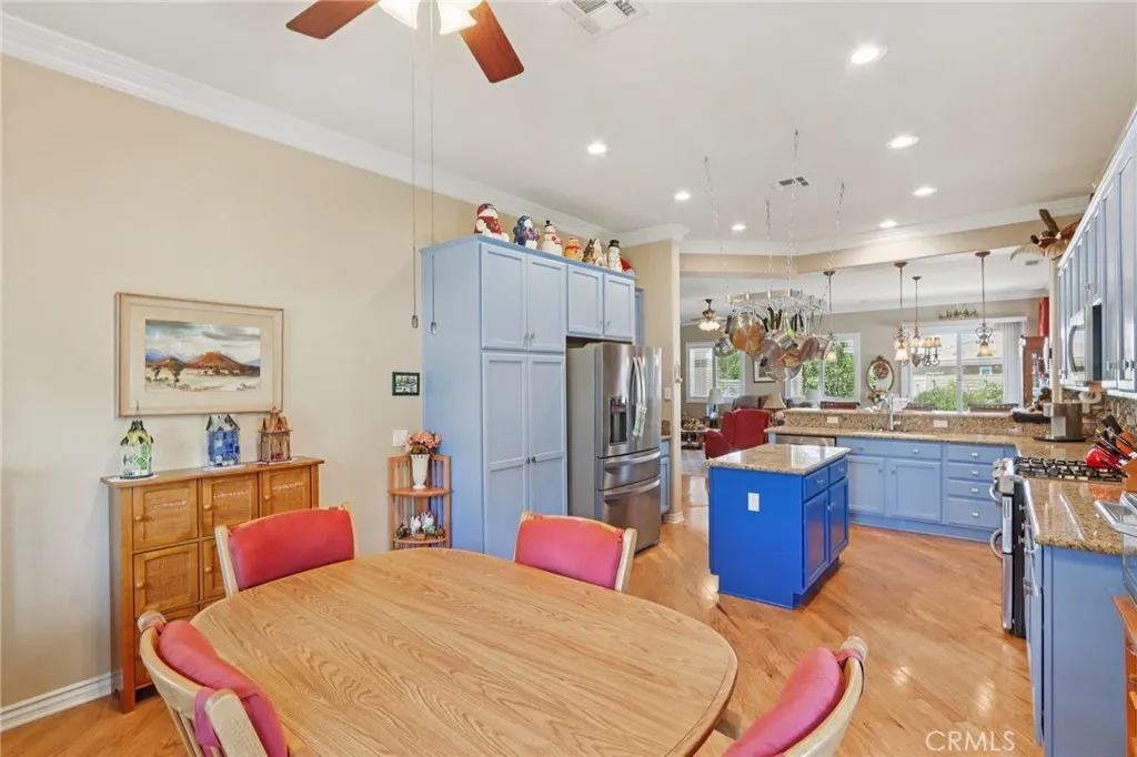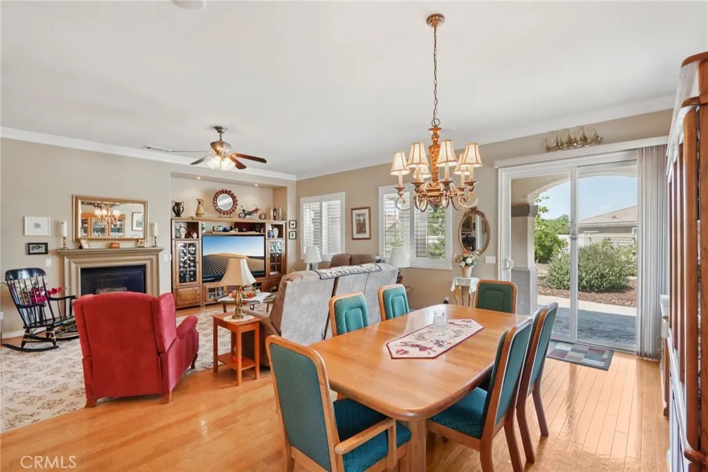 Location, location, location! Tucked away on a quiet cul-de-sac lot, this stunning home in the highly sought-after Solera Diamond Valley by Del Webb offers comfort, style, and community living at its finest. From the moment you arrive, youll love the drought-tolerant artificial turf front landscaping and the beautiful iron gate framing a welcoming front porchperfect for your morning coffee or sunset chats. Step inside to a bright and inviting open-concept floor plan, where the kitchen flows seamlessly into the dining with cozy fireplace and living areas. The kitchen is a chefs delight with granite countertops, a center island with breakfast nook, tile backsplash, stainless steel appliances (refrigerator conveys!), pots and pans rack, and loads of cabinet storage. The living room is complete with plantation shutters, while crown molding, upgraded fixtures, and ceiling fans add a touch of elegance throughout. This home features 2 bedrooms, 2 full baths, plus a den/officeideal for hobbies, work, or guests. The primary suite is exceptionally large, with a spa-like bath boasting both a bathtub and step-in shower. Guests will appreciate the upgraded bathroom with its step-in shower as well. The laundry room is thoughtfully designed with a sink, cabinets, washer, and dryer all included. Out back, discover your premium retreata true entertainers dream! The yard showcases a California-style patio cover, stamped concrete, professional landscaping, a tranquil fountain, small pergola, and a handy shed. With wood floors and all the right upgrades, this home is ready to impress.