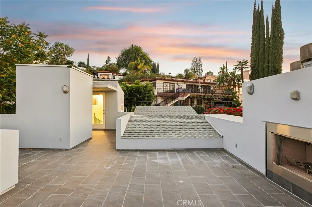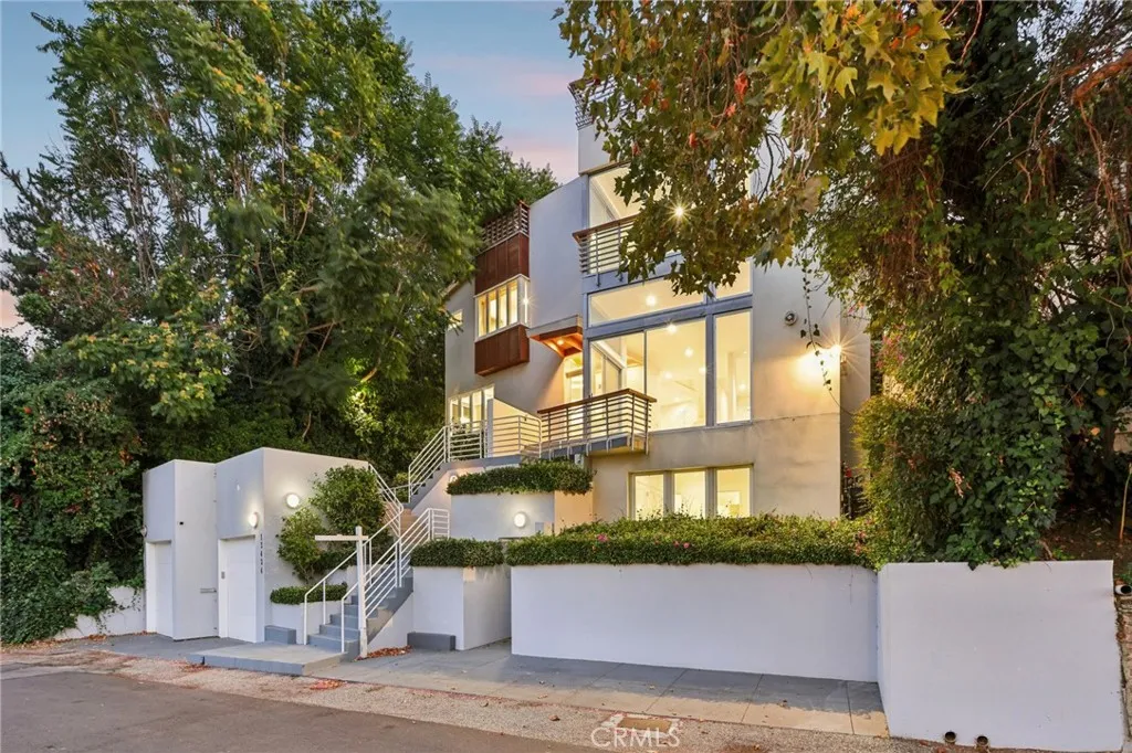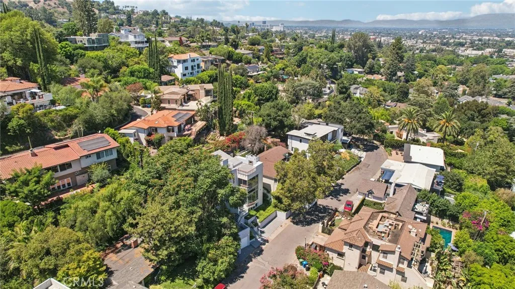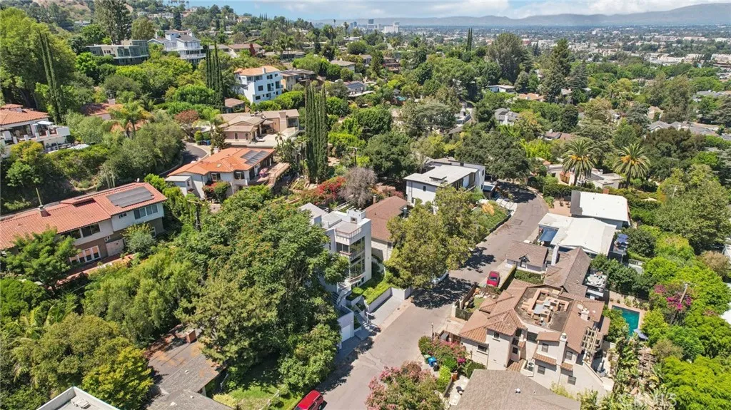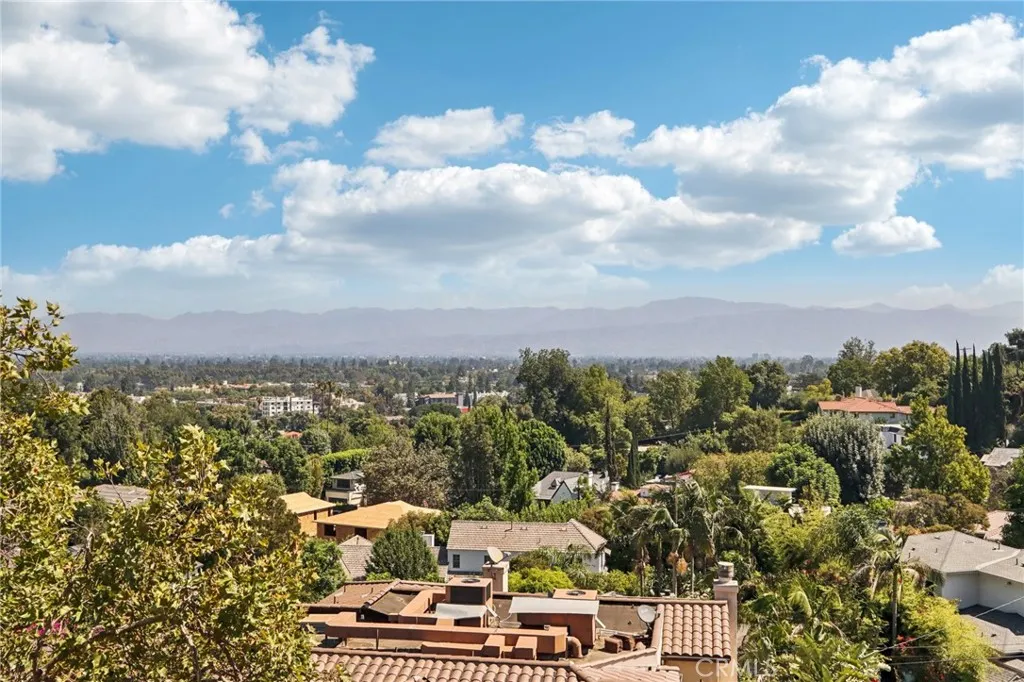 Welcome to this contemporary hideaway nestled south of Ventura Boulevard on a picturesque, tree-lined street in coveted Sherman Oaks. A striking architectural facade with geometric glass panels sets the stage for the light-filled interior, where floor-to-ceiling windows bathe the formal living and dining areas in California light, highlighted by an onyx fireplace and custom built-ins. The open-plan kitchen features stainless-steel appliances, abundant cabinetry, and a central island with a cooktop, flowing effortlessly into the family room, which opens via French doors to outdoor entertaining spaces. A private elevator connects all levels, leading to a generous rooftop deck with sweeping 360-degree views of the Valley, city lights, mountains, and treetops. The voluminous primary suite includes its own fireplace, Juliet balcony, spa-inspired bath, and walk-in closet. Secondary bedrooms are bright and spacious, and one has been thoughtfully appointed as a gym with mirrored walls and rubber flooring. Moments from Ventura Boulevards shops and dining, and located within the top-rated Dixie Canyon Community Charter district, this home embodies sophisticated hillside living with convenience and style.