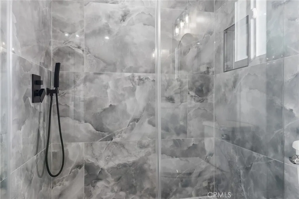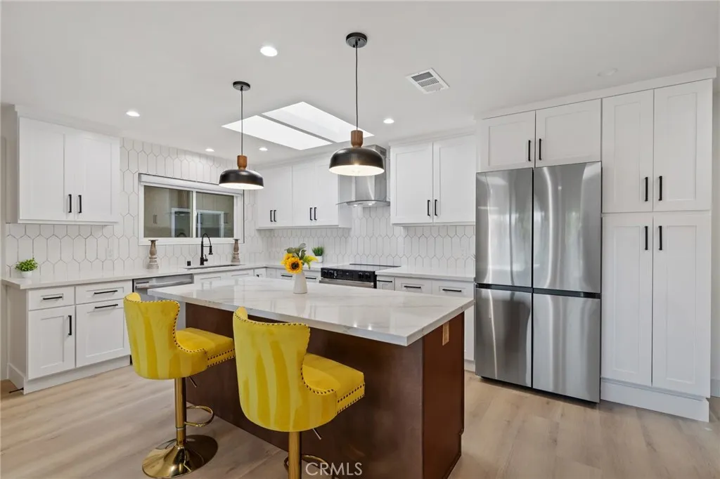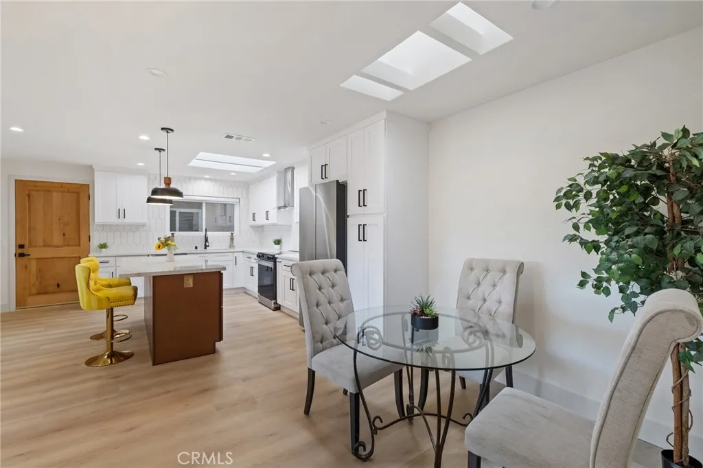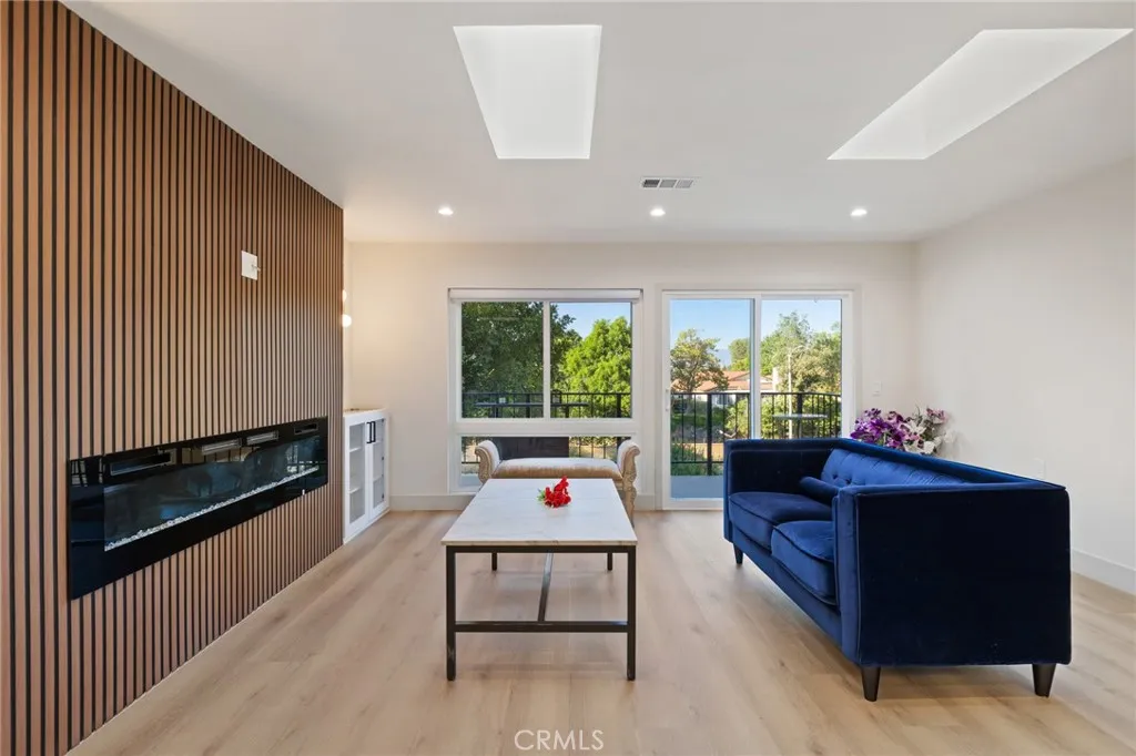 This Casa Vista Stunner has been tastefully remodeled to modern expectations with an open floor plan featuring multiple skylights in kitchen, dining and living room with fantastic privacy in the rear balcony. Enjoy warm summer evenings and cool ocean breezes from your balcony which offers some views of the surrounding hills and treetops. This home is also equipped with an HVAC system to keep you cool in the summertime and warm during chilly winter months. No expense has been spared with new windows, sliders, LVP flooring, recessed lighting, remodeled kitchen and bathrooms as well as custom blinds for the bedrooms. A spacious walk-in-pantry closet has been added for convenience. Living room features a unique Slat styled wall with cable hookups ready to go, along with custom end cabinets and lighting on both sides with a new electric fireplace below. Master Bedroom is spacious and features direct access to the beautiful master bathroom suite and walk in closet. Both bathrooms have been completely remodeled into modern styled bathrooms featuring frameless glass shower doors, porcelain tiles, shaker cabinets, new sinks, faucets, quartz countertops, vanity lights, and mirrors. NO STAIRS OR STEPS from assigned carport nearby to front door. New solid wood front door with window for additional lighting and conveniently located walking distance to clubhouse 6 and just down the street from Gate 10 entrance. Come enjoy the incredible amenities Laguna Woods has to offer those seeking an Active living style or retirement with the security of a Gated Community. This street has really bea
