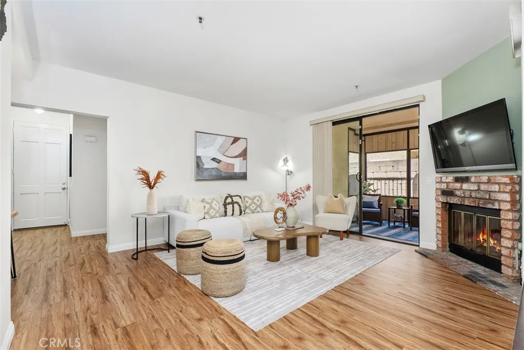 Welcome to this beautifully updated 2 Bedroom 2 Bathroom single level condo. Featuring 2 Master Suites, each with its own full bathroom and walk-in closet. One bathroom includes a tub with shower, while the other has a walk-in shower for added versatility. Enjoy the open living space with high ceilings, a fireplace in the living room, and laminate wood-like flooring that brings warmth throughout. The upgraded kitchen offers plenty of storage, modern finishes, and is paired with the convenience of an in-unit stackable washer and dryer located in the kitchen closet. Parking is convenient with a 1-car detached garage, an additional assigned space, plus ample guest parking. This home is move-in ready and offers the perfect blend of style and function in a desirable location, near the beach, trendy restaurants, and local grocery stores, youll have everything you need just minutes away.