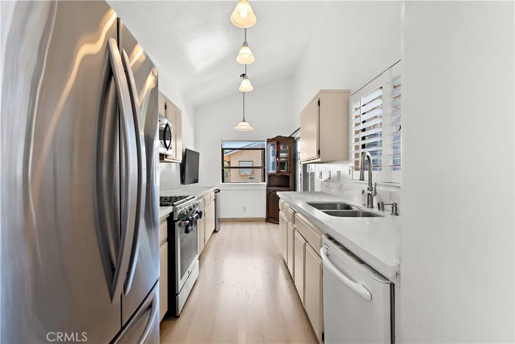 Welcome to your peaceful, updated 1-bedroom, 1-bath end unit condo nestled in a gated community. This end unit, with stairs leading exclusively to your door, shares only one common wall, providing added privacy. The upper-level home features soaring vaulted ceilings and bright rooms filled with natural light, complemented by plantation shutters throughout. Recently refreshed with new paint and flooring, the open kitchen has quartz countertops and additional cabinetry. The cozy living room with a fireplace overlooks a spacious patio, perfect for entertaining or relaxing, with a convenient washer and dryer area. The bedroom is illuminated by a skylight and includes a newly renovated vanity area along with a spacious walk-in closet. Residents enjoy access to two pools, two hot tubs, tennis courts, and beautifully maintained grounds. With easy access to shopping, dining, and freeways, this location offers exceptional convenience. Lakewood Shores provides a vibrant community lifestyle and is the perfect place to call home!