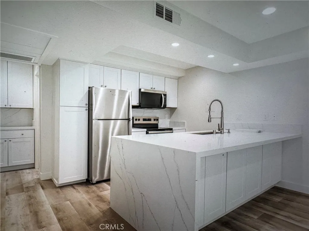 Location Location Location!!! Excellent walkability to restaurants and shopping! Completely Redone!!! New Kitchen and Bathroom remodel! Kitchen boasts new Shaker style cabinets with Quartz Carrera Marble Countertops with a large waterfall side. Cabinets on both sides of the peninsula give an abundance of extra storage, with an incorporated breakfast bar. Brand New Name Brand Stainless Steel Appliances. The bathroom was completely redone as well. New bathtub, shower enclosure, 1x2 Carrera style tile, vanity and mirrors. Fresh paint and new vinyl flooring throughout. The patio is enclosed and offers additional interior flexible space that could be used as a home office or a seating area. Formal Large Living Room offers a lot of natural light from the windows, and has a gas fireplace. Recessed Lighting in Kitchen, Dinning area and bathroom. The Primary Bedroom is large in size and offers a walk-in closet as well as a wall closet. The complex offers a Spa, Bonus Room, Workout Gym, Rooftop Deck and more. Gated garage with 2 tandem covered spaces come with the unit.