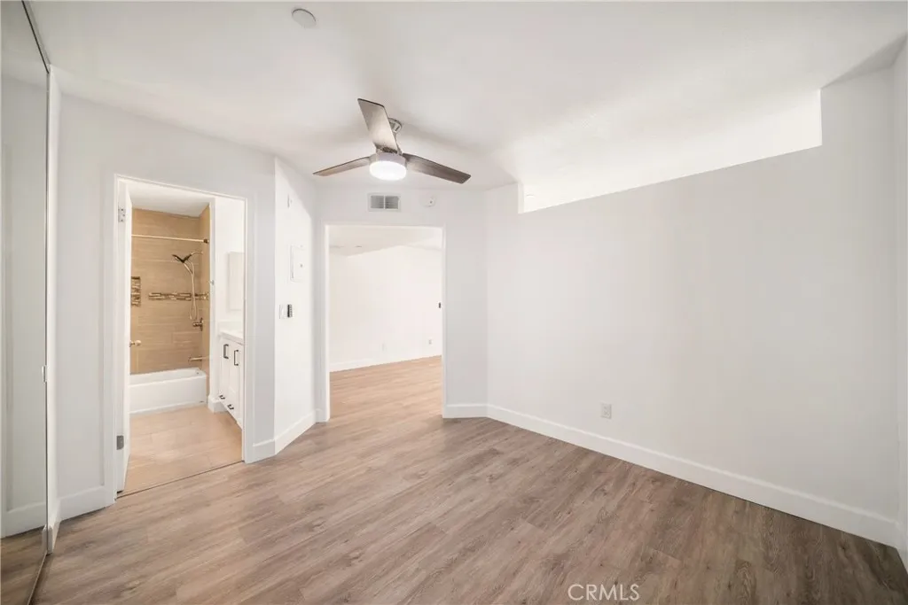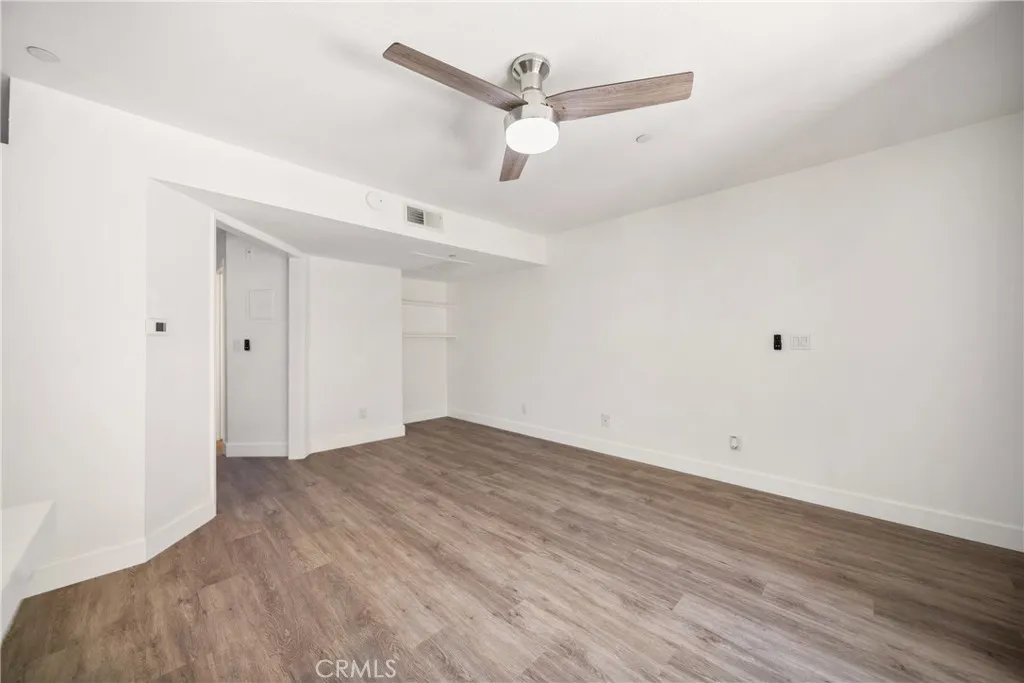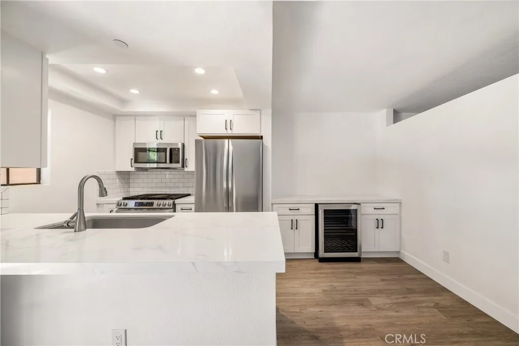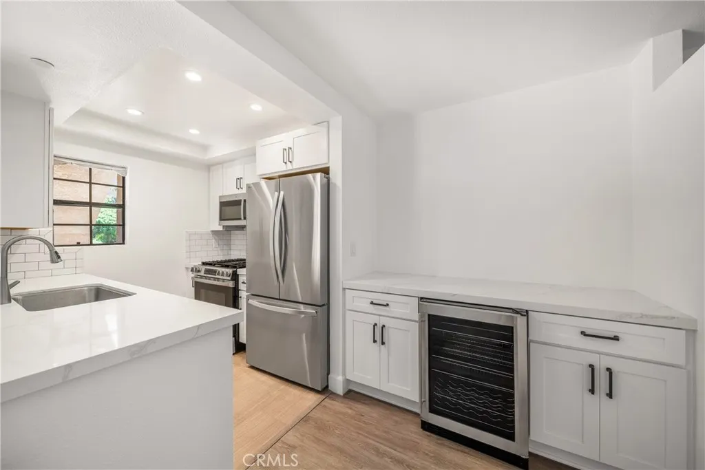 Wake up to ocean breezes and coastal charm in this ground-level, fully renovated 1-bedroom, 1-bathroom condo located in the sought-after Vista Pacifica community. Modern upgrades, resort-style surroundings, and a prime location near the beach create an ideal retreat. The open-concept interior is filled with natural light, featuring new flooring, fresh paint, and remote-controlled ceiling fans for year-round comfort. The living area extends to a private ground-level patio through expansive sliding glass doors, perfect for savoring morning coffee or evening sunsets in a tranquil setting. The kitchen blends style and functionality with quartz countertops, white shaker cabinets, a subway tile backsplash, and stainless steel appliances including a refrigerator, microwave, stove, dishwasher, and freestanding wine cooler. A breakfast bar with additional storage cabinetry adds convenience and extra space, perfectly integrating the wine cooler. The bedroom includes mirrored closet doors and access to a fully updated bathroom with a modern quartz-topped vanity and a fully tiled shower/tub combination. A stackable washer and dryer are included inside the unit. Additional features include a 1-car detached garage with code access, providing secure parking and extra storage. Vista Pacifica offers a true coastal escape with two sparkling pools, two spas, meandering streams, and peaceful waterfalls surrounded by lush landscaping. Assigned parking and ample guest parking enhance everyday convenience. Located just minutes from sandy beaches, scenic hiking trails, dining, boutique shopping, a