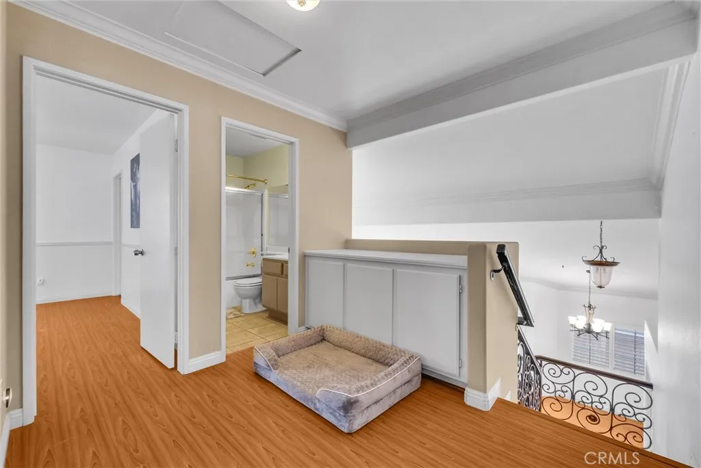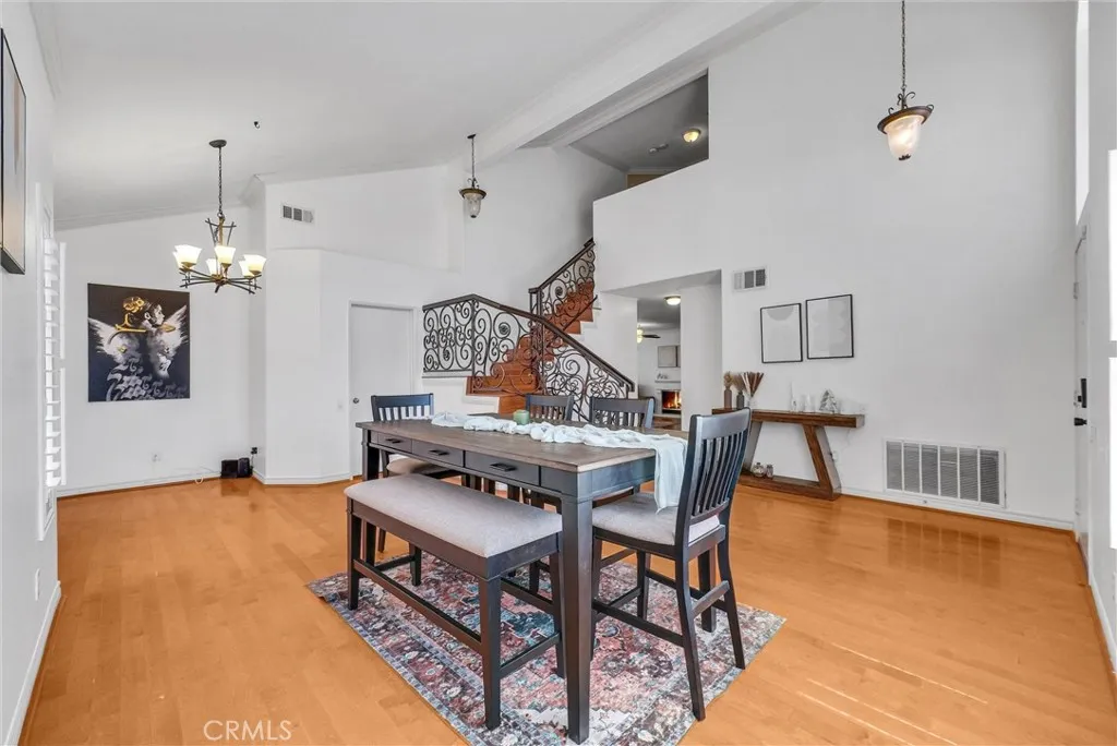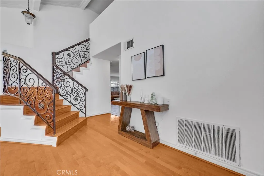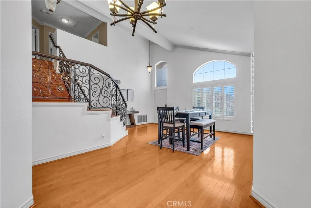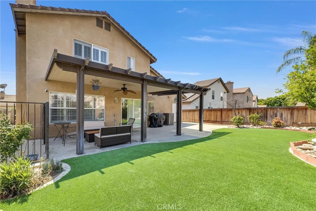 Well maintained 4 bedroom, 3 bathroom home located across the street from The Loring Ranch Community park! Built in 2002 with 1,931 sqft living space, upgrades in the bathrooms, front patio and so much more! This spacious home has recessed lighting, gorgeous crown molding, plantation shutters, and NEW paint throughout. Enter into the formal living room with stunning 2-story ceilings and a beautiful wrought iron banister to the 2nd floor. The kitchen sits just off of the living room and has wood cabinetry with lots of storage space, tile counters, and a stainless steel gas stove, a microwave, and dishwasher and refrigerator. The kitchen opens to the family room with fireplace, ceiling fan, and a slider to the backyard. All of the bedrooms are generously sized and the primary bedroom offers a full-size private bathroom. One bedroom downstairs with bath .There is also a half bathroom for guests, and a full-size hall bathroom for the secondary bedrooms to share. Enjoy the large, private backyard with New grass area, and patio to relax under. There is also an attached 2-car garage. This home is not only across the street from Loring Ranch community park but also conveniently located near Rancho Jurupa Regional Park with Fishing and Camping, minutes away from Downtown Riverside with great restaurants, and close to multiple freeways 215/91/60/10 making this a key Location home!
