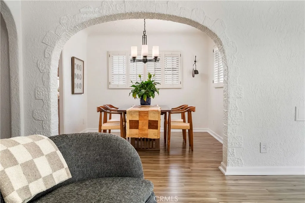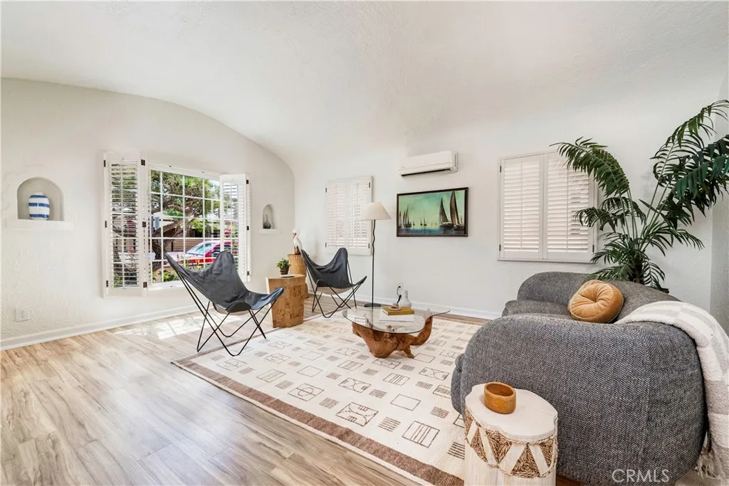 Enjoy the best of Belmont Shore living in this charming Spanish Bungalow, just one block from the boutiques and restaurants of Belmont Shore/2nd St, and two blocks to the beach. Behind the entry gate, a lushly landscaped courtyard welcomes you with generous space for outdoor dining and lounging. Step inside the house and classic details like coved ceilings and arched passageways highlight the homes classic Spanish design, while modern upgrades such as zoned heating and cooling ensure everyday comfort. The 1,332 square foot interior offers a thoughtful layout; living room, dining room, kitchen, and family room are distinct yet flow effortlessly with continuous luxury vinyl plank flooring. The bright, expansive kitchen features abundant cabinetry, a wine fridge, countertop seating for four, and a seamless connection to the cozy family room with its brick fireplace. Two bedrooms provide flexibility, with one customized as a home office with built-in desk, shelving, Murphy-style bed, and dual closets, and the primary bedroom featuring a spacious mirrored wardrobe. The updated bathroom features dual sinks and a spacious shower accented with glass tile accent. Accessible from the family room, the back yard includes a covered lounge with ceiling fan, an open patio area with a built-in gas grill, and an electronic rolling gate for optional off-street parking. Adjacent to the patio at the back of the property, a separate bonus structure houses laundry, built-in storage, and work benches; ideal as a workshop, studio, or home gym. This is Belmont Shore at its best, with classic charm,