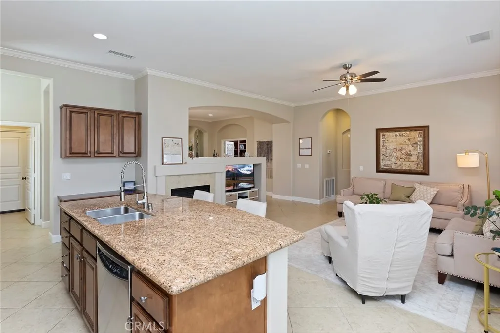 Amazing Trilogy home in pristine condition. Homes like this rarely come on the maket, original owners immaculate care and an absolutely perfect location just a short walk to clubhouse, pool, spa, tennis and golf. The most sought-after model, "LAGUNA", Located in Mojeska Canyon, 1888 Sq/Ft, very open floor plan with volume ceilings and numerous windows bringing in an abundance of natural light. There are 2 bedrooms plus a gorgeous office with built in desk and cabinetry, 2 baths, large master suite with access to rear yard, and walk-in closet with custom built-ins. The island kitchen is a great gathering place, granite counters, stained maple cabinets, under cabinet accent lighting, all stainless-steel appliances, built-in desk,and breakfast nook. The kitchen flow into the spacious family room, with fireplace and ceiling fan. Additional upgrades include 20"tile throughout, mirrored wardrobe closet doors, plantation shutters, beautiful glass/wood front door, mirrored closet doors, and crown molding. Rear yard is a nice place to unwind with a stucco patio cover and mountain views. Trilogy at Glen Ivy has its own Ted Robinson design 18-hole golf course, complete gym, exercise rooms, indoor, outdoor pools, BBQ's, walking/jogging tracks, bocce ball, billards,BBQ's, cabana's, amphitheater, lighted tennis courts, restaurant and club house. Close to Shopping, Tom Farms, World famous Glen Ivy Hot Springs and Orange County. Trilogy is a 55+ Active Adult Gated Community which prides itself on Resort Style Living!!! Truely an Amazing Home!!!