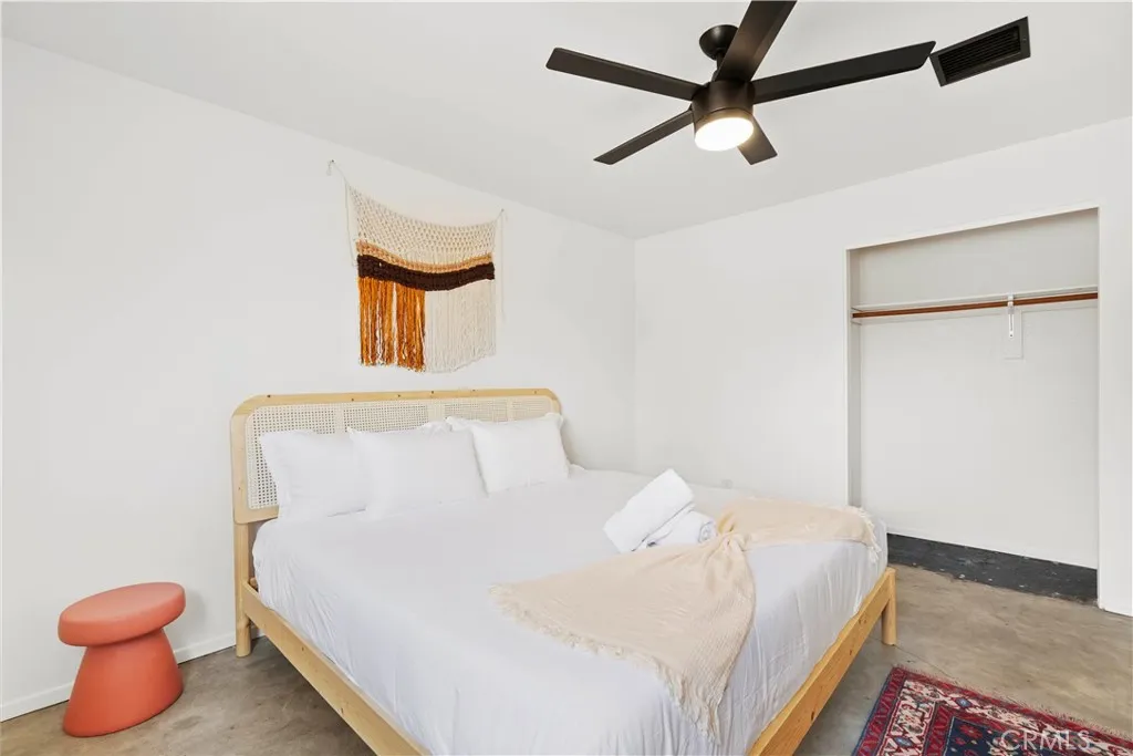 Step into this fully furnished 2 bedroom, 1 bathroom artistic retreat where modern design meets creative flair. With an open concept floorplan, this home flows effortlessly from the sleek kitchen to the airy living and dining areas, creating a spacious and welcoming environment perfect for relaxing or entertaining. Thoughtfully curated furnishings and bold, contemporary decor and unique personality with the interior decor, accompanied by a lot of natural light and concrete floors. Out back, the real magic happens! Designed for entertaining and unwinding, the expansive backyard features two private outdoor showers, a stylish cowboy tub for cooling off, and multiple chaise loungers for soaking up the sun. Whether hosting friends for a day in the sun or BBQ, or enjoying a quiet evening under the stars, this vibrant outdoor haven is the perfect extension of the homes creative soul, and is ideal for those who appreciate style, comfort, and a touch of the unexpected. ***There is a power purchase agreement with Sunrun for approximately $120 per month, and current homeowner has a negative electricity bill.