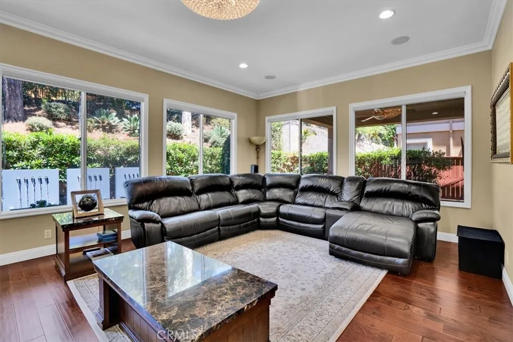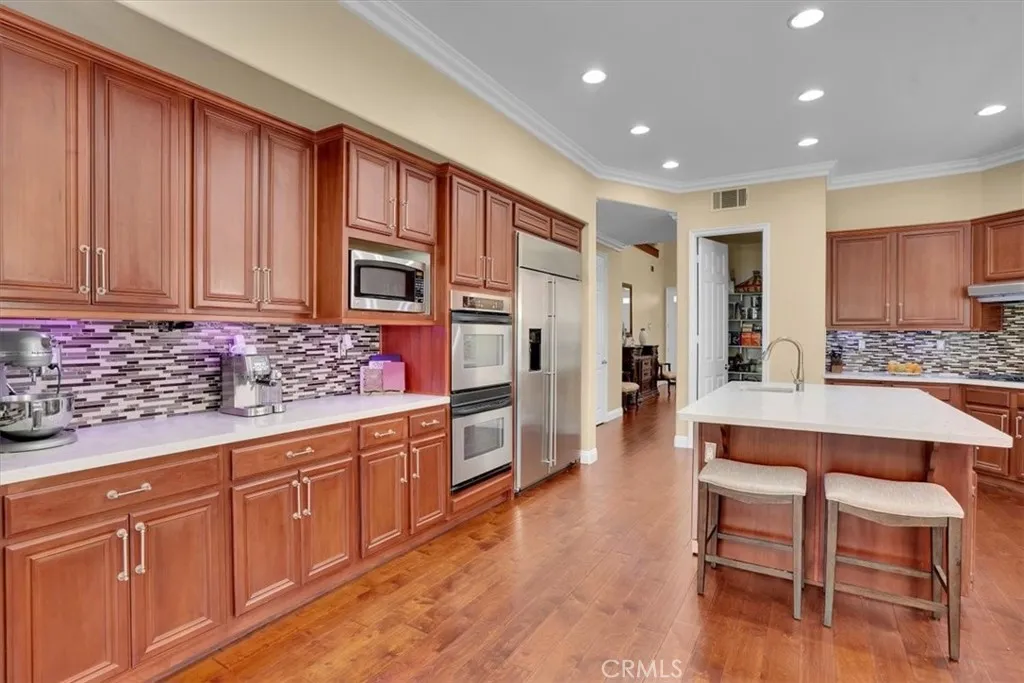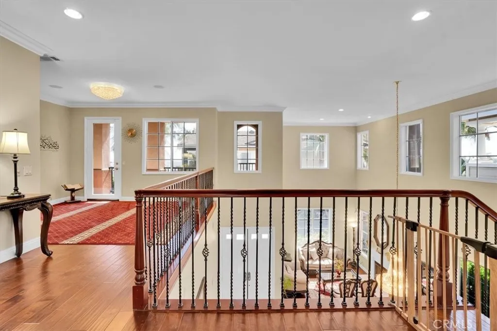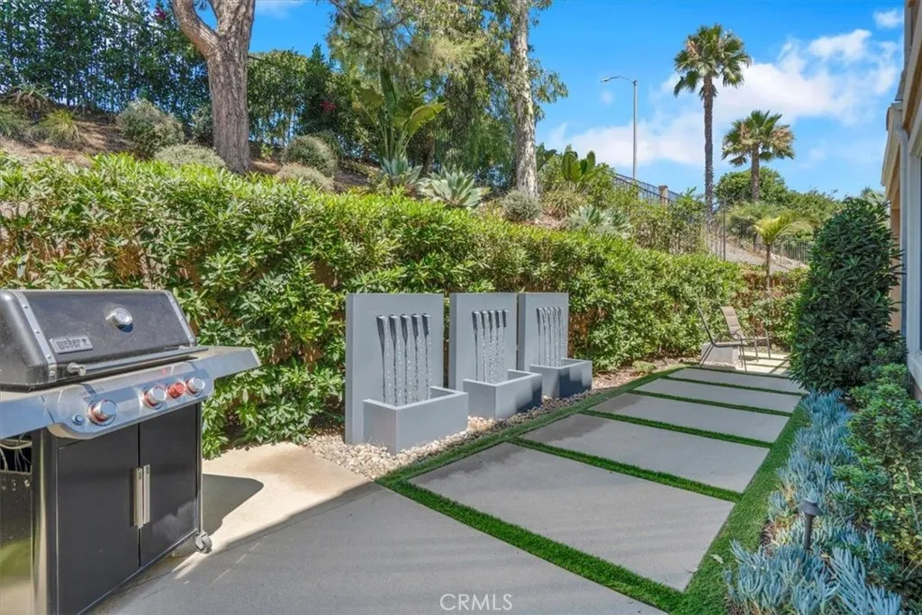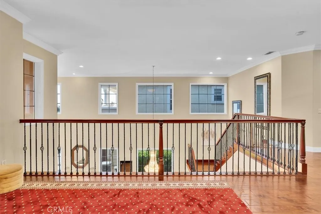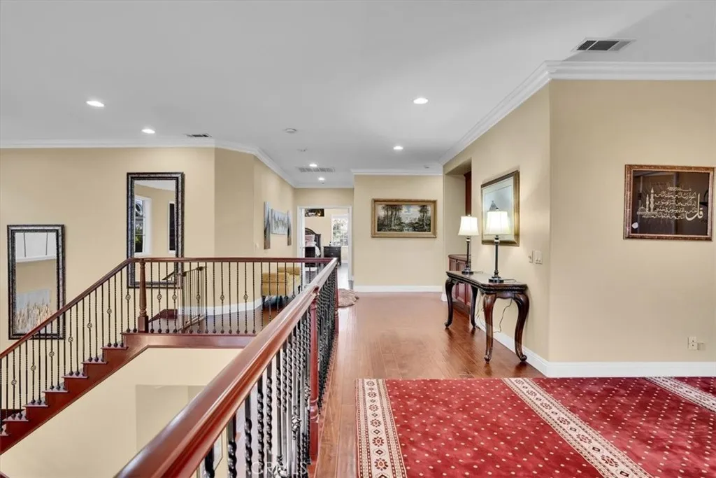 Introducing a fantastic well-maintained high end luxury home located within the exclusive gated community of The Terraces at Bixby Ridge in Signal hill. The beautiful home is meticulously designed to cater to executive living, featuring 4 bedrooms, each with its own full bathroom, including a downstairs bedroom and bathroom. The residence boasts a spacious formal living room and dining room, a family room, a large kitchen with a granite island, wine fridge, in-built speakers throughout the house, tinted front widows & partial primary bedroom windows and stainless-steel appliances, crown molding and wood flooring throughout the home and a three-car garage. Additional amenities include three fireplaces, a loft with a balcony, a covered patio, a high-end outdoor water fountain, and beautifully thought-out landscaped private, secluded backyard and surroundings. Upon entering, you are greeted by cathedral ceilings in the formal living room, complemented by hardwood floors throughout the downstairs area. The kitchen is equipped with granite countertops, stainless steel appliances, maple cabinets, and ample counter space, opening to a large family room with a fireplace. The downstairs bedroom is generously sized and situated across from a full bathroom. The covered back patio is surrounded by trees and fantastic landscaping, providing a serene resort-like outdoor space. The second-level features 3 bedrooms, each with its own bathroom, including a massive master/primary suite with a private balcony, an elegant fireplace, a large bathroom with a separate tub and glass shower, dual s