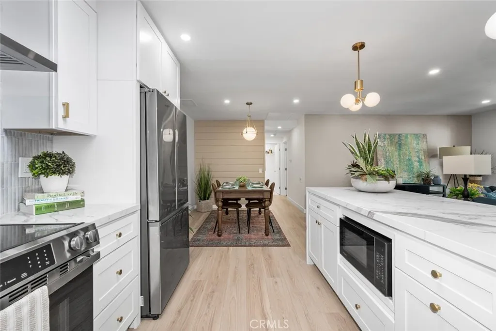 Seller motivated and willing to contribute towards closing costs! Welcome to this beautifully reimagined top-floor Casa Contenta model home, located in the desirable Third Mutual of Laguna Woods! Step inside to discover a stunning open-concept living space featuring recessed lighting and a custom floor-to-ceiling stone electric fireplace that serves as a striking focal point. Expansive dual-pane sliding doors bring the outdoors in, creating a serene, treehouse-like ambiance with an exceptional sense of privacyno neighbors in sight. Natural light floods the home through a dramatic skylight that spans the width of the kitchen. The kitchen itself is a true showstopper, thoughtfully updated with sleek quartz countertops, stainless steel appliances, Shaker-style cabinetry, pendant lighting, and an oversized island with a breakfast barperfect for entertaining. Adjacent to the kitchen is a dedicated dining area accented by stylish custom lighting fixtures, ideal for hosting dinner parties or casual meals. Down the hallway, you'll find a beautifully updated guest bathroom featuring a new vanity, a fully tiled roll-in shower, and a glass enclosure. The unique floor plan includes a private primary suite, complete with a luminous white bathroom boasting quartz counters, a tiled floor, and a low-threshold glass-enclosed shower. Additional highlights include high-quality laminate flooring throughout, central air conditioning, and an in-unit washer and dryer for your convenience.This home is ideally situated within Laguna Woods, allowing residents to take full advantage of its amenities.