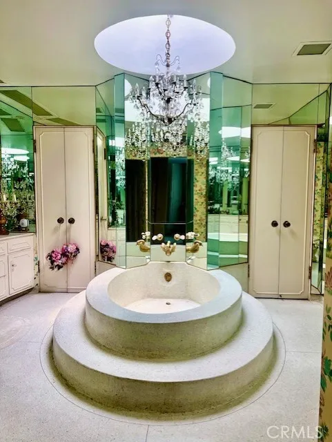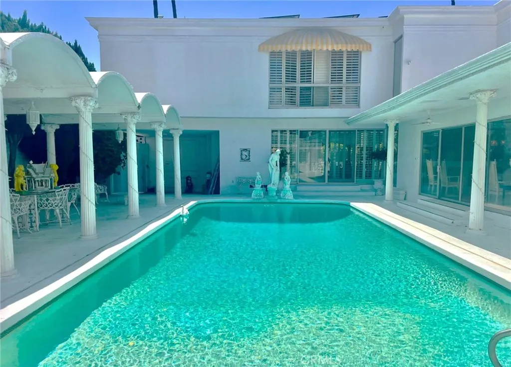 WELCOME HOME to this spectacular one of kind custom built property located overlooking Recreation Park golf course. This very unique home is a well designed combination of Mid Century Modern and traditional elegance and very upgraded finishes including terrazo flooring, marble countertops, numerous finished white columns, two marble fireplaces, gold plated door knobs, stainless appliances in kitchen, custom wall finishes pluse solar panels. Over 5000 s.f. of spacious living and entertainment areas including an expansive living room with marble fireplace, large great room with marble fireplace & bar area, formal dining room, separate office, well appointed kitchen with center island and numerous cabinets plus built in desk and a first level bedroom suite. All built around access and views to the large patio area with pool and entertainment room with wine storage, built brick barbeque and dining area. Up the grand curved staircase are 3 bedrooms including a very spacious primary suite with attached large balconey that looks out to the golf course, a primary suite bathroom finished in terrazo and marble with large sunken tub and two separate vanities. Lots of closets including a large walk in cedar lined closet. Down the hall is another bedroom suite with golf course views. closets and bathroom with an oversized round terrazo shower. The middle bedroom has a wall of windows with golf course views and balcony. A third bathroom boasts walk-in closets and a round terrazo sunken bathtub plus a large vanity sink area all finished in white marble. There is a 5th bedroom/bathroom stu