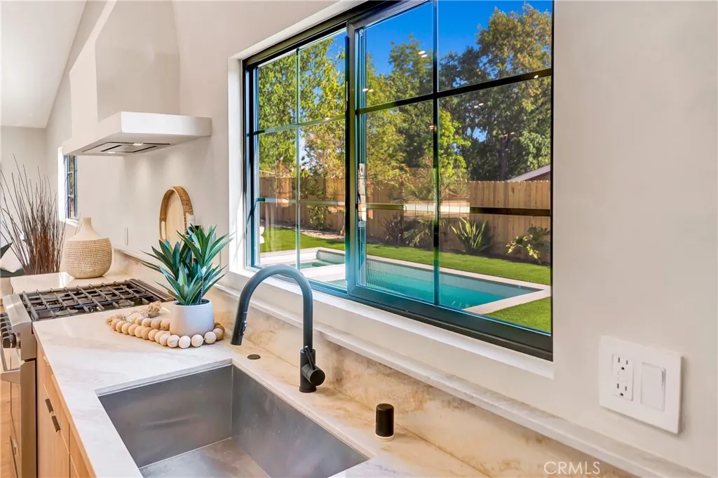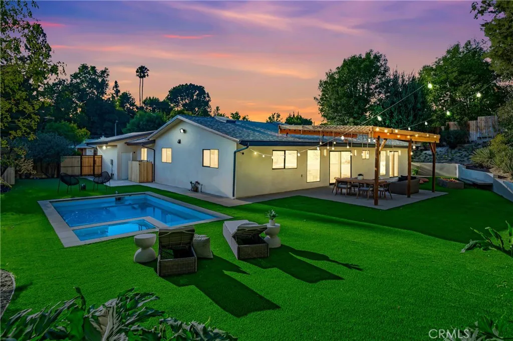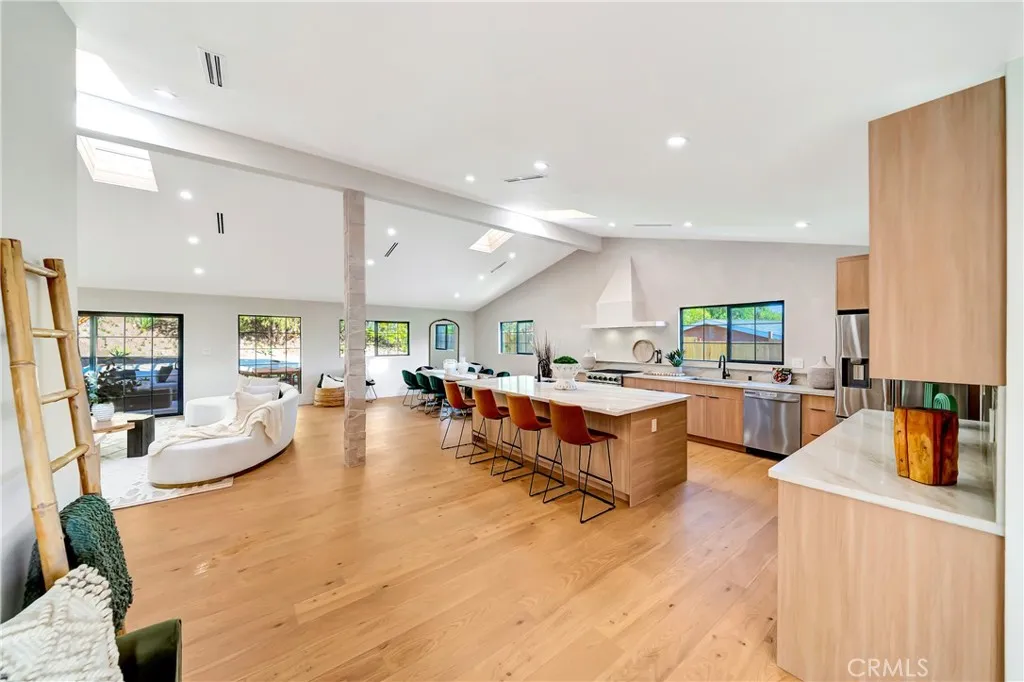Set on a 14,165 sq. ft. flat and private lot in prime Woodland Hills, this stunning modern farmhouse offers the ultimate blend of luxury, space, and seclusion This fully remodeled and expanded modern farmhouse sits on a spacious, private flat lot and has been reimagined from top to bottom with luxury finishes and modern upgrades. Virtually everything is new, including pool, backyard, patio, electrical, plumbing, roofing, HVAC, and moremaking this home completely turnkey. The open-concept floor plan boasts vaulted ceilings, wide-plank water proof wood floors, skylights, and expansive black-framed windows that flood the home with natural light. The chefs kitchen features custom cabinetry, a stone waterfall island, high-end appliances, and a walk-in pantryopening to a spacious dining area and great room, ideal for entertaining. Retreat to the luxurious primary suite with vaulted ceilings, direct yard access, and a spa-like bath with dual vanities and a large walk-in shower. Three additional bedrooms, including a private mini suite, provide flexibility for family, guests, or office use. Step outside to a brand-new resort-style pool and spa, surrounded by a fully private backyard with smooth stucco Venetian-plaster walls. The redesigned outdoor space includes a turf play area and a covered patio/pergola lounge with string lighting and a built-in fire pitperfect for year-round entertaining. Additional highlights include two brand-new HVAC systems, smart-home upgrades, a dedicated laundry room, RV parking with full hookups being installed, and a finished two-car garage equipped wi