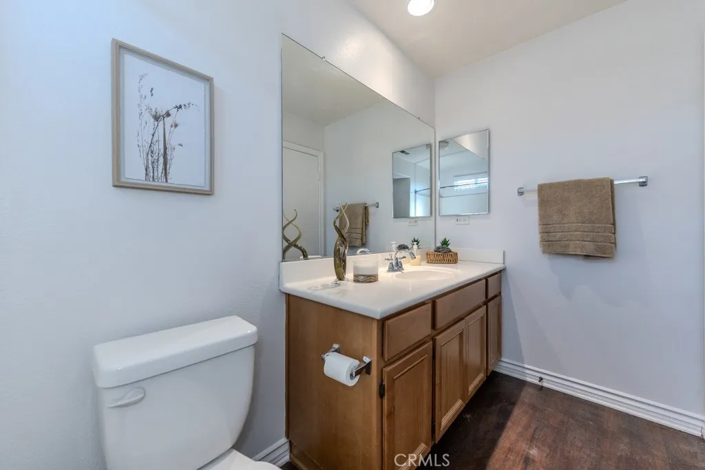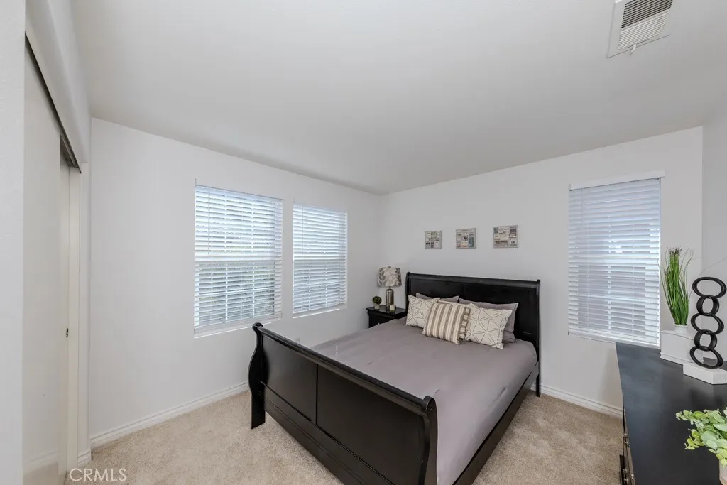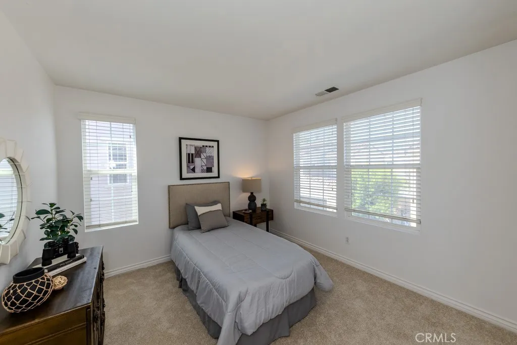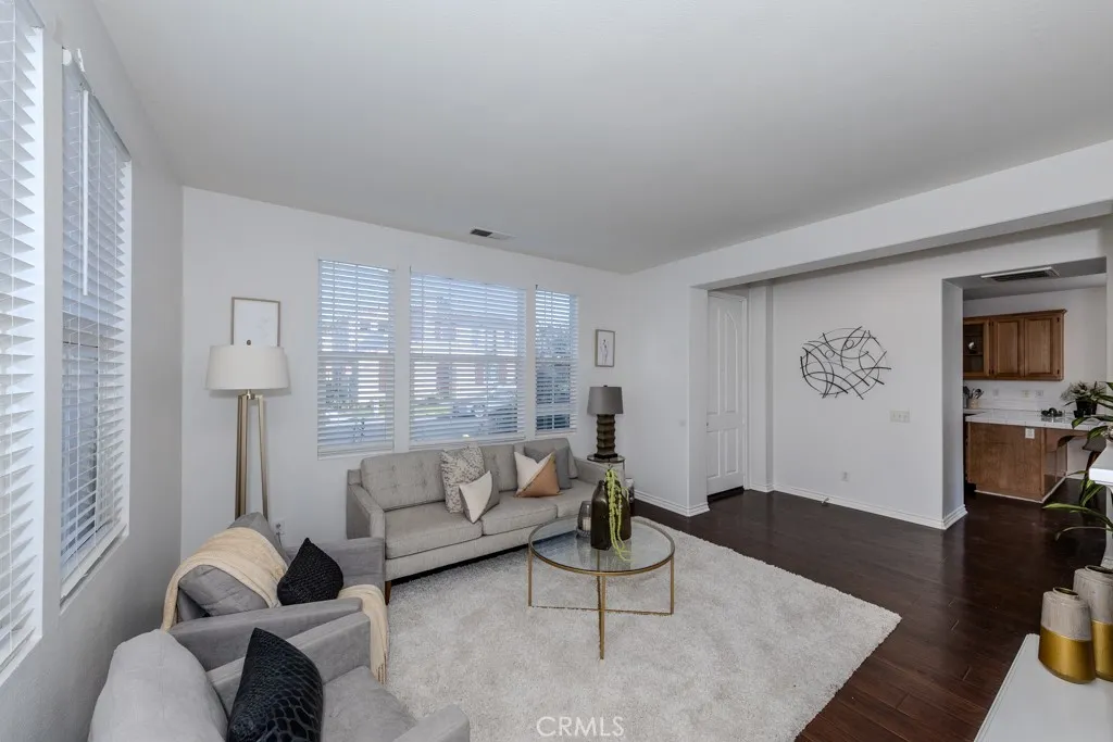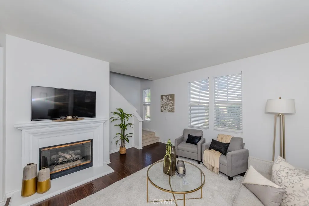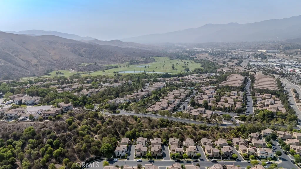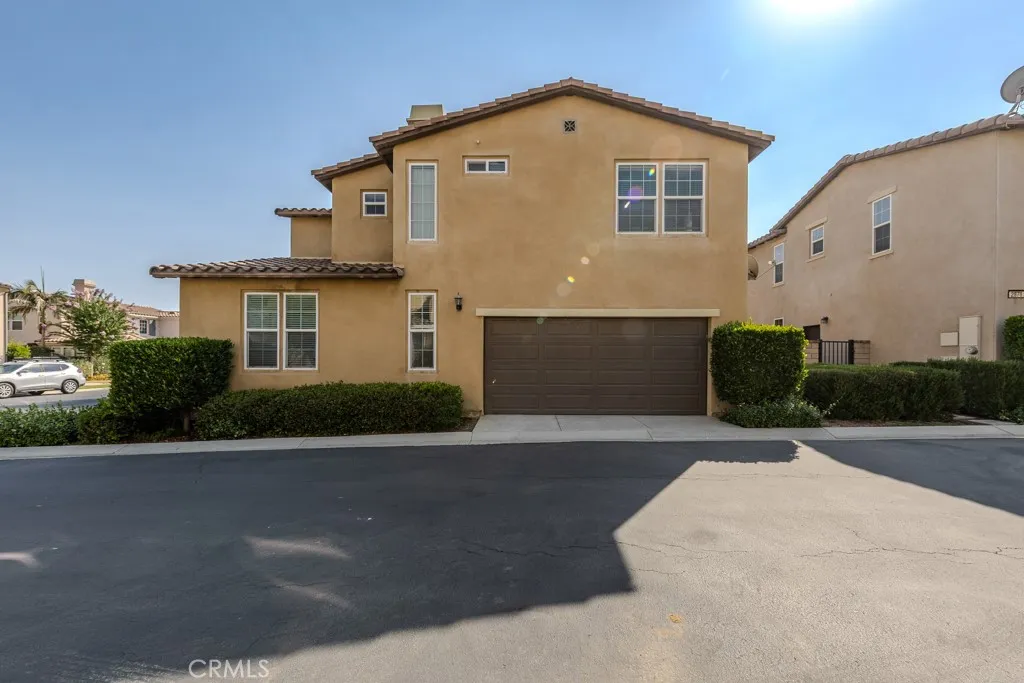 Detached single-family home in Dos Lagos within the Citrus Springs neighborhood. Located at 2874 Echo Springs Dr, Corona, this two-story property offers 3 bedrooms, 2.5 bathrooms, and 1,682 square feet. A major advantage is its proximity to The Shops at Dos Lagos, where shopping, dining, golf, and parks are all within walking distance. The entry opens to laminate wood flooring across the first level. To the right, the living room features high ceilings, abundant natural light, and a fireplace. To the left, the kitchen includes upper and lower cabinetry, stone counters, a breakfast bar, recessed lighting, stainless steel appliances, and a walk-in pantry. The adjacent dining nook offers double doors that open directly to the backyard. A half bath and under-stair storage sit just off the kitchen, and interior access leads to the two-car garage. Upstairs, new carpet runs throughout. The primary bedroom features high ceilings, a Juliet-style balcony, and a large walk-in closet. The en suite bath includes laminate wood flooring, dual sinks, a soaking tub, a walk-in shower, recessed lighting, and a separate toilet room. A loft-style landing between bedrooms offers a flexible space for work or reading. Two additional bedrooms with mirrored layouts share a full bath with laminate flooring, a single sink, and recessed lighting. A separate laundry room upstairs provides built-in upper cabinets, a utility sink, and a folding counter. Outdoors, the backyard includes a concrete patio, a block wall for privacy, a garden bed, and a turf area for low-maintenance use. Citrus Springs offers c