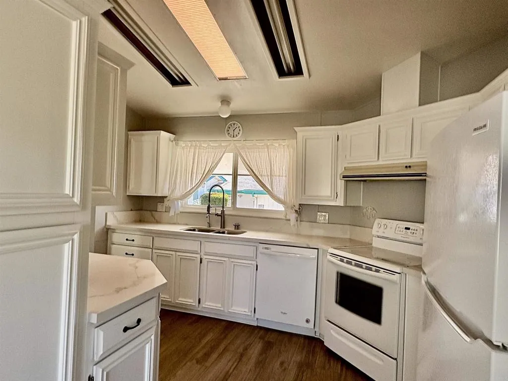UPDATED 2 bed/2 bath Home with open floorplan, TROPICAL Yard and 2 Car Garage! Primary suite includes spa like bath with abundant storage, dual sinks, tub/shower combo, and massive walk-in closet! 2nd bath designed for accessibility with walk-in shower, built-in chair, handrail grips, and bidet! Updated kitchen with QUARTZ countertops and crisp white cabinetry! Large dining area with built-in buffet. large living room flows seamlessly into a sunlit bay window area, perfect for relaxing or entertaining. You will love the huge laundry room with front loading LG washer and dryer! Step outside to enjoy lush tropical landscaping and a private outdoor living space, ideal for morning coffee or evening gatherings. Active adult community! Move-in ready! Call now! CAL353616