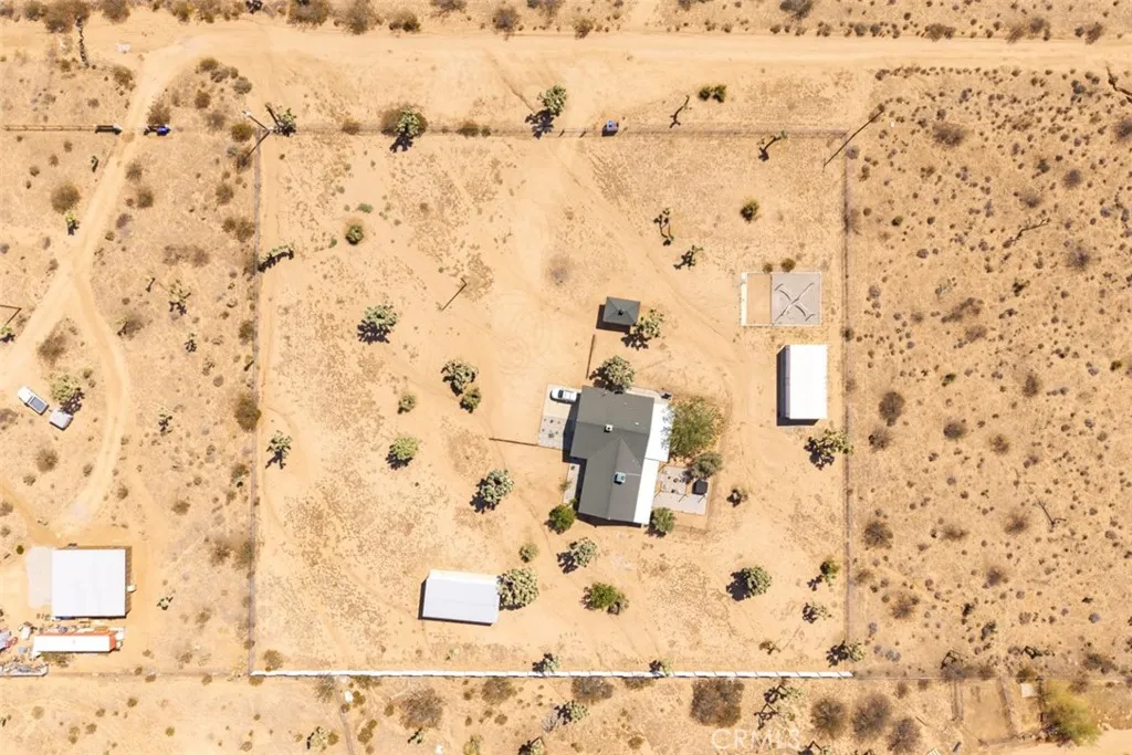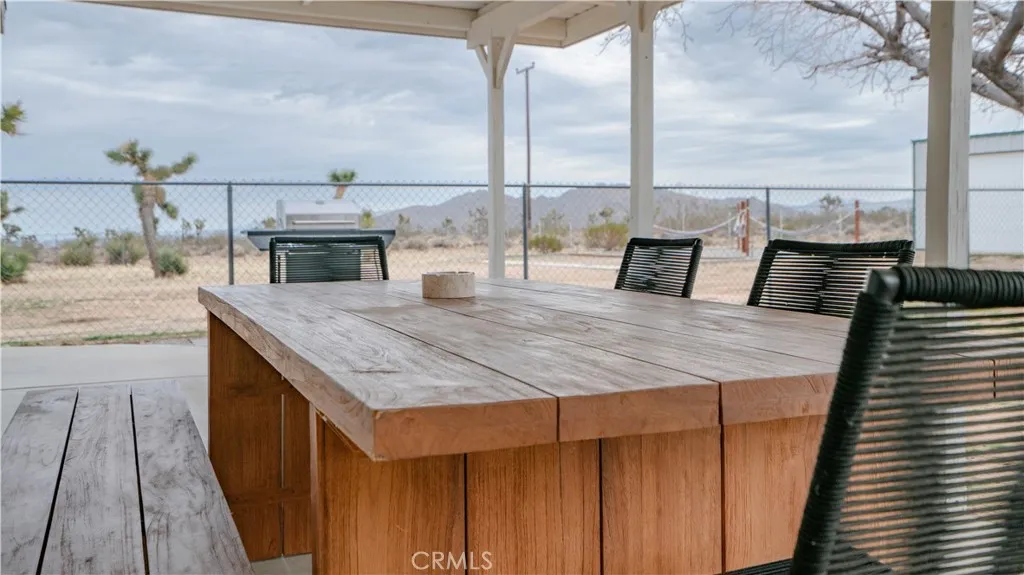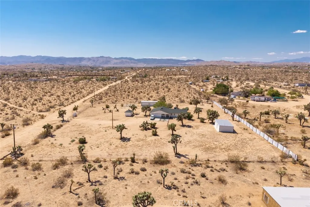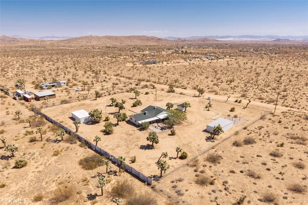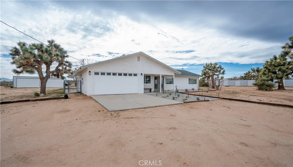 Sitting at the gateway where Yucca Valley meets Joshua Tree, this stunning fully furnished desert ranch home offers the perfect blend of rustic charm and modern upgrades. This 3 bedroom, 2 bath home spans 1,520 sq. ft. on over 2 acres of land, providing both privacy and plenty of space to enjoy the desert lifestyle. Step inside to a welcoming formal living room with new laminate flooring, crown molding, and a cozy wood-burning fireplace. The open-concept kitchen and family room showcase brand-new white shaker cabinets, stone countertops, upgraded stainless steel appliances, and a sliding door leading to a full-length covered back patioideal for indoor-outdoor living. Additional highlights include updated dual-pane windows, industrial farmhouse-style fixtures, and modern LED lighting throughout. Bedrooms feature plush new carpet with mirrored wardrobe doors, while the hallway offers a rustic barnwood farmhouse pantry and linen area. The primary suite boasts direct patio access along with an en suite bathroom featuring an updated vanity, fixtures, and tub/shower combo. Comfort is ensured with central HVAC and an evaporative cooler. Along with a 2-car attached garage, the property features two 4-car detached metal garages, offering a total of 10 covered parking spaces. These versatile spaces are perfect for car enthusiasts, off-road vehicle owners, workshops, studios, or creative retreats. Nearly the entire property is fenced with ample space for recreation and additional parking. A custom-built storage shed/playhouse and an abundance of Joshua Trees, Yucca Trees, and native d