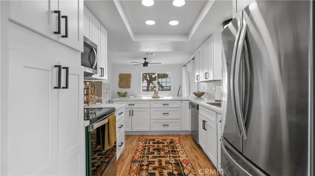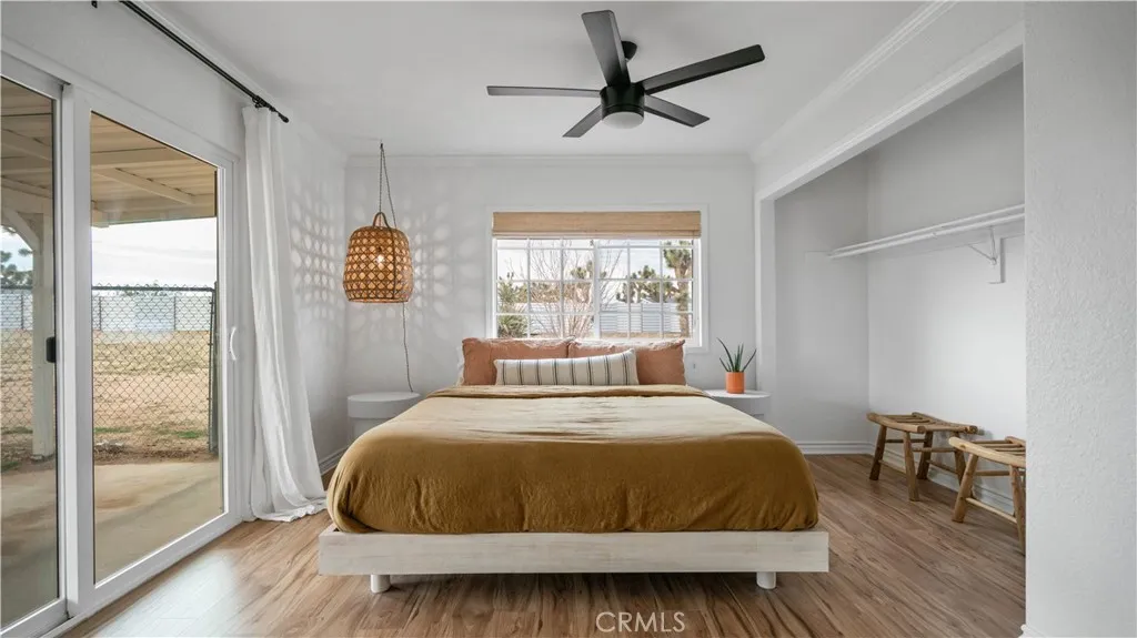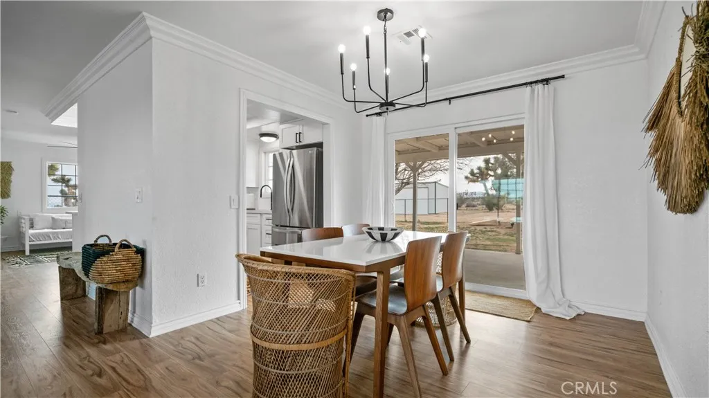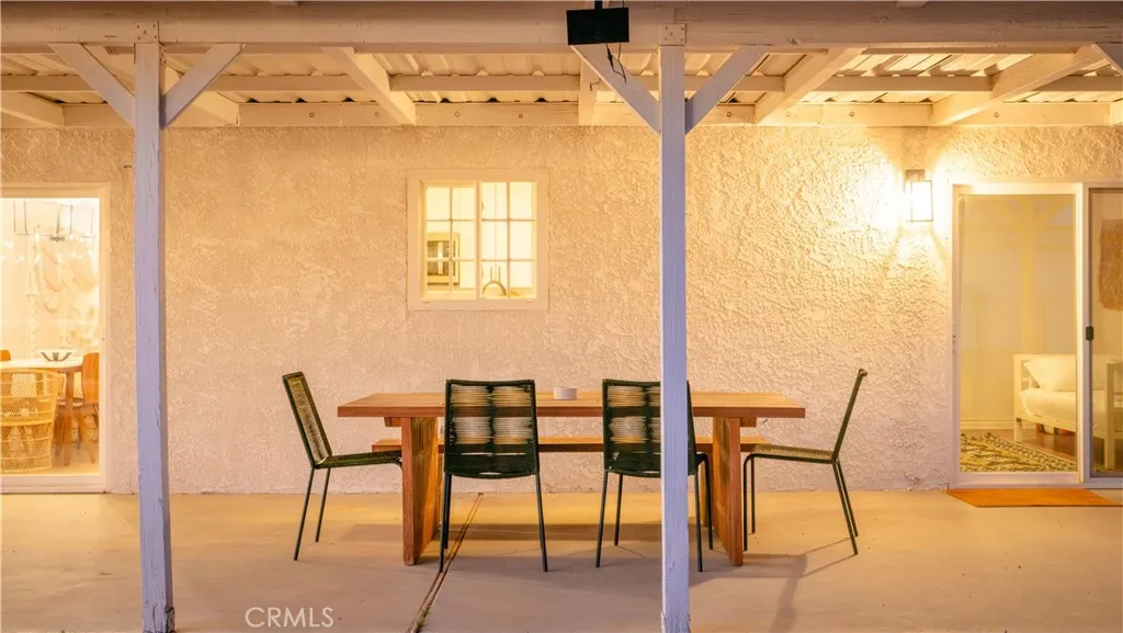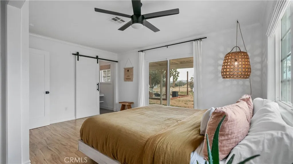 Sitting at the gateway where Yucca Valley meets Joshua Tree, this stunning fully furnished desert ranch home offers the perfect blend of rustic charm and modern upgrades. This 3 bedroom, 2 bath home spans 1,520 sq. ft. on over 2 acres of land, providing both privacy and plenty of space to enjoy the desert lifestyle. Step inside to a welcoming formal living room with new laminate flooring, crown molding, and a cozy wood-burning fireplace. The open-concept kitchen and family room showcase brand-new white shaker cabinets, stone countertops, upgraded stainless steel appliances, and a sliding door leading to a full-length covered back patioideal for indoor-outdoor living. Additional highlights include updated dual-pane windows, industrial farmhouse-style fixtures, and modern LED lighting throughout. Bedrooms feature plush new carpet with mirrored wardrobe doors, while the hallway offers a rustic barnwood farmhouse pantry and linen area. The primary suite boasts direct patio access along with an en suite bathroom featuring an updated vanity, fixtures, and tub/shower combo. Comfort is ensured with central HVAC and an evaporative cooler. Along with a 2-car attached garage, the property features two 4-car detached metal garages, offering a total of 10 covered parking spaces. These versatile spaces are perfect for car enthusiasts, off-road vehicle owners, workshops, studios, or creative retreats. Nearly the entire property is fenced with ample space for recreation and additional parking. A custom-built storage shed/playhouse and an abundance of Joshua Trees, Yucca Trees, and native d