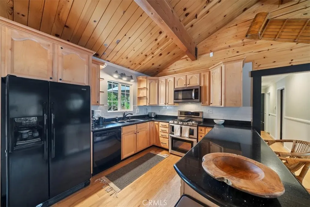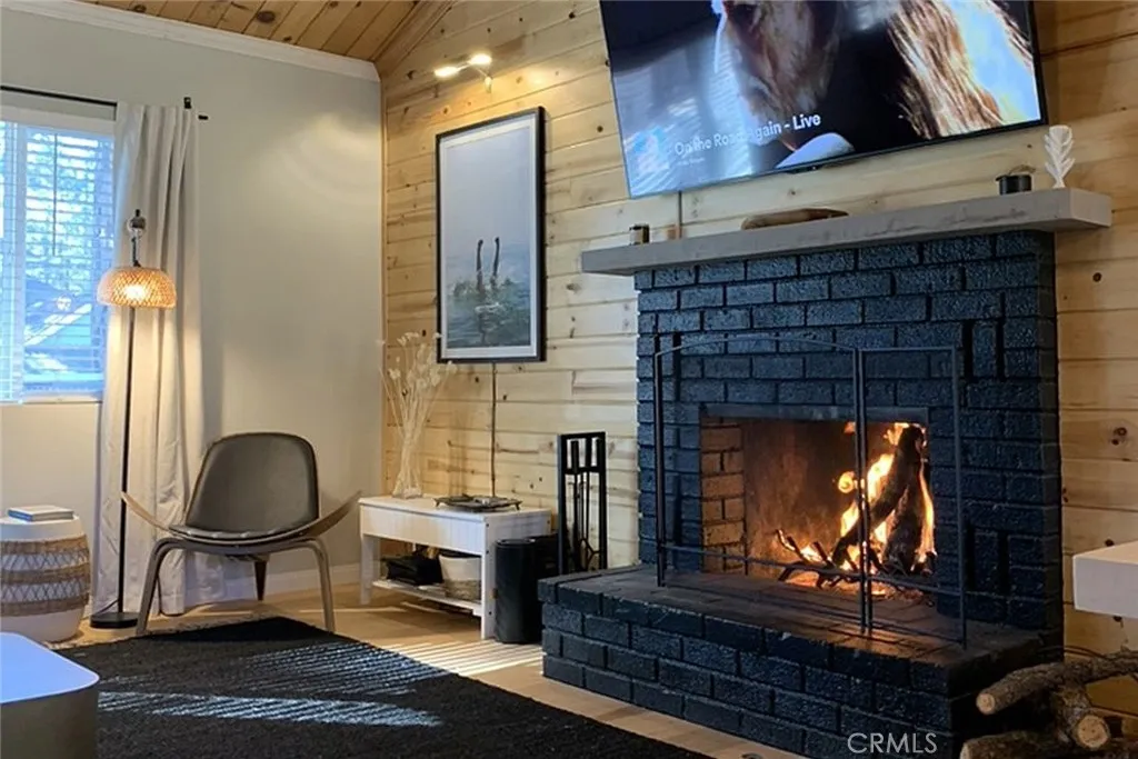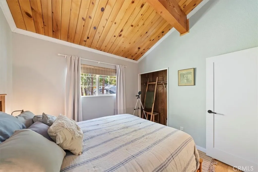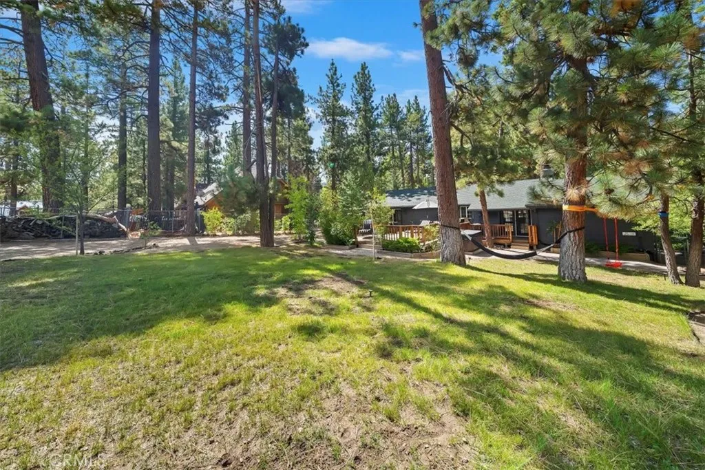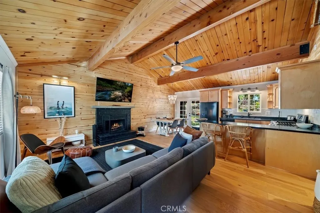 Price improved on this winter ready, professional interior design with a modern European/Cabin chic look. This designer upgraded retreat offers a rare opportunity to own a Big Bear gem w/ massive yard, high-end furniture, and serene surroundings! Imagine fireside mornings, spa nights, and snowy evenings w/ a shuttle nearby to the village and ski resort. The upgrades were done with meticulous care. Features include solid hardwood flooring, and high end, barely used furniture. Home is move-in ready or all set for vacation renting this winter. The light and bright interior is so spacious with cathedral ceilings, fresh paint inside and out. While the inside is amazing, the unique setting is awesome. A huge backyard backs to Camp Tanda-a rare find in Big Bear Lake with an outdoor spa, lovely decking and even views of a Great Blue Heron's nest. Because of the layout of this home, it feels larger than the square footage. The level sunny setting and one car garage make this the perfect retreat or full time home. It is definitely one of the most unique and desirable pride of ownership homes on the market! Don't miss this opportunity.