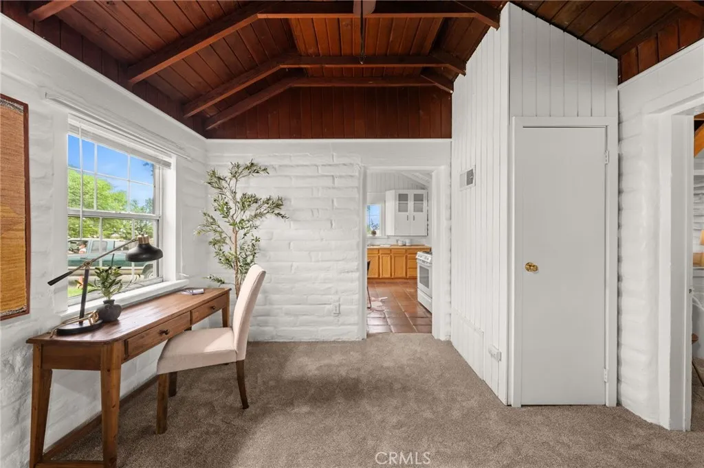 Price improvement! Single story home with a detached garage on a .25 acre flat lot with alley access! Located less than .5 miles from Uptown Yucaipa classics like White Rabbit Coffee and Brewcaipa, this home is an excellent example of classic Yucaipa charm in a great location. Enter through the front screened porch into the living room, where you'll find plenty of natural light and vaulted ceilings with exposed beams. A sizable bedroom has direct access to the full bathroom. The large kitchen features eat in dining. A smaller bedroom off to the side would also make a great home office. Heading out back, you'll find access to a sizable cellar - perfect for long term storage. There is a detached one car garage as well. The sizable, flat lot has great alley access. Great potential to build a large garage or shop, or even an ADU with it's own access! The home has new carpets throughout and fresh interior paint.