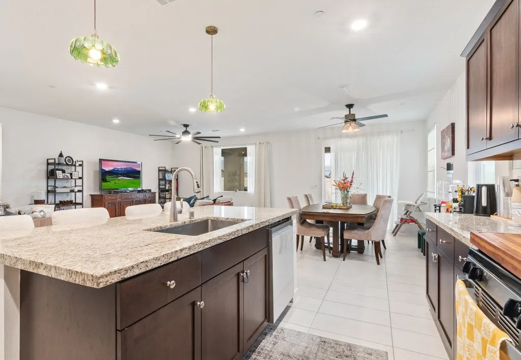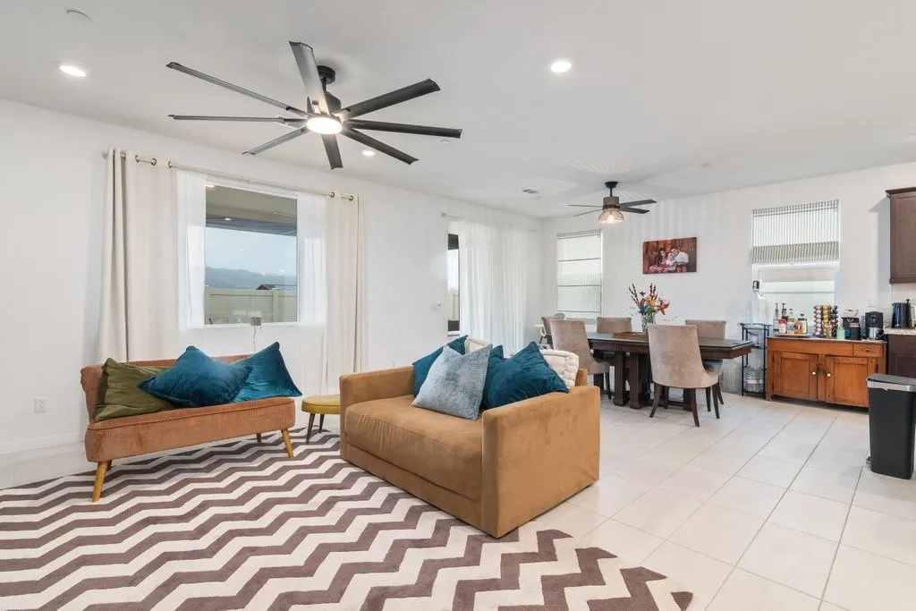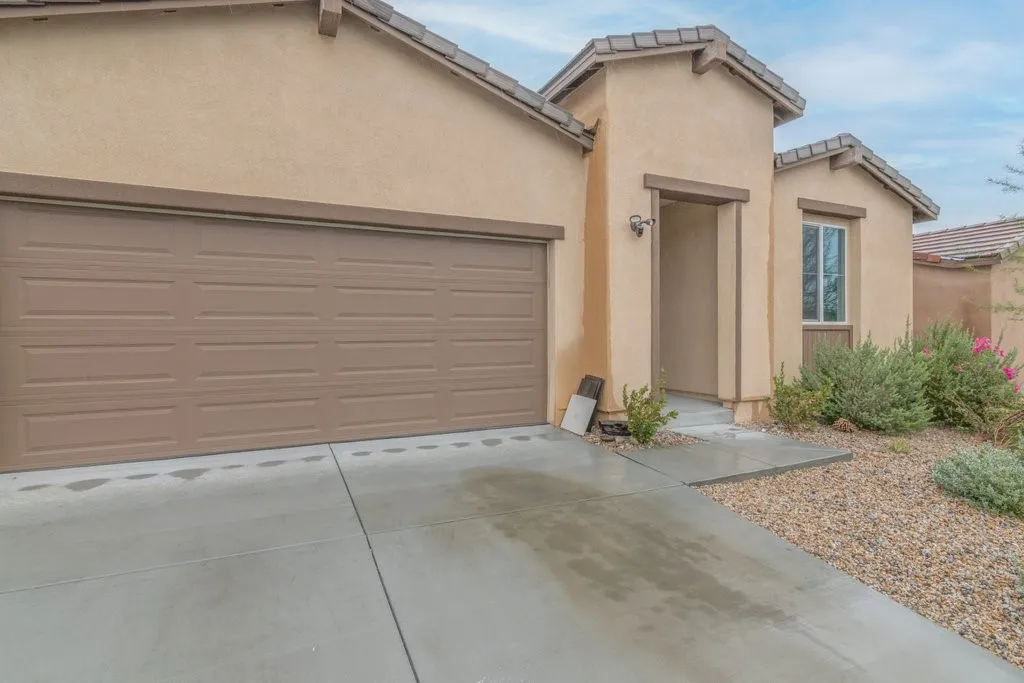 Welcome to this beautifully designed, newer construction home in the highly desirable Skyborne master-planned community. This thoughtfully laid-out single-story residence combines comfort, convenience, and style. Solar panels provide energy savings, while the landscaped front and back yards enhance curb appeal and outdoor enjoyment. Inside, three spacious secondary bedrooms are located off the entryperfect for family, guests, or a home office. At the heart of the home, the open-concept living area seamlessly connects the kitchen, dining, and great room, creating an ideal space for everyday living and entertaining. The kitchen is equipped with an upgraded dishwasher and microwave, making meal prep and cleanup a breeze. Sliding doors open to a private covered patio and a large backyard, extending your living space and inviting you to embrace the desert lifestyle. The owners suite is tucked away in the rear corner of the home, giving ultimate privacy. It features a walk-in closet and en-suite bathroom for your comfort. Additional highlights include a large laundry room, upgraded tile flooring for easy maintenance, and large ceiling fans throughout the home for year-round comfort. Community Highlights: Residents of Skyborne enjoy access to a community park, swimming pools, a spa, and a dog parkall with low HOA fees. The prime location is just 10 minutes from vibrant Palm Springs, with shopping, dining, mineral springs, and Joshua Tree National Park all nearby. This home is an excellent opportunity for first-time buyers, families, or anyone seeking a stylish, low-maintenance hom
