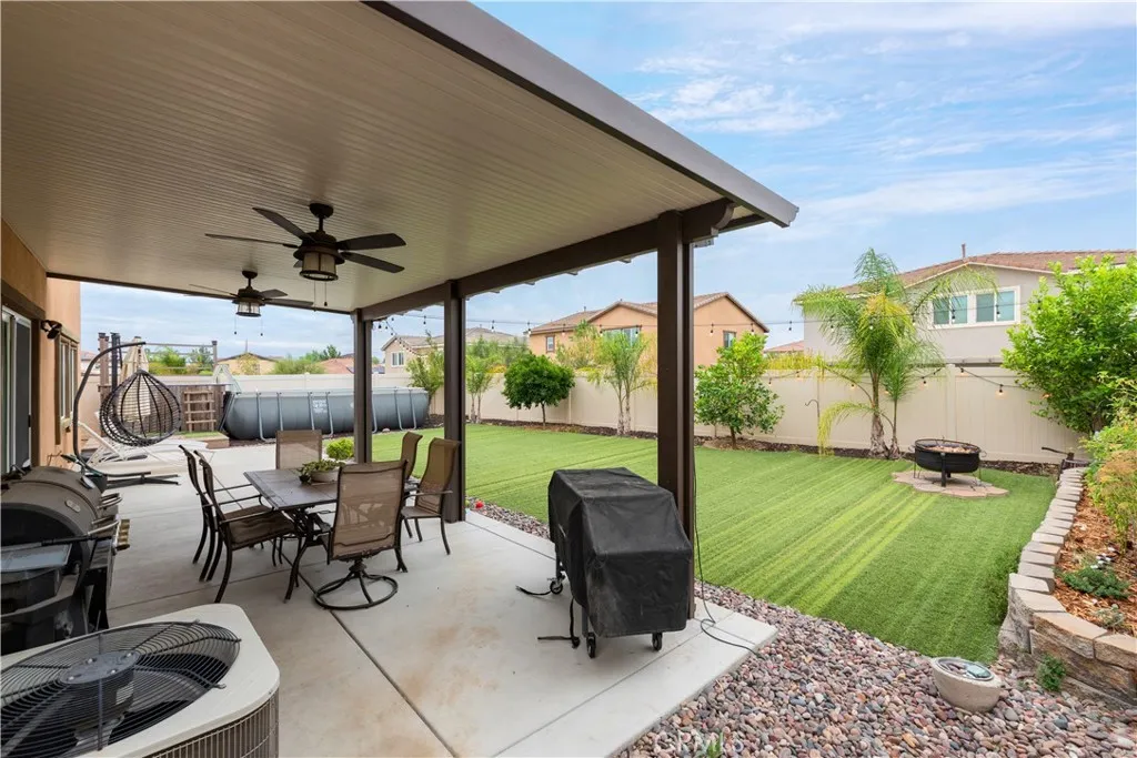 Location + premium cul-de-sac lot with easy access to freeway. Freedom of NO HOA!!! Welcome home to where your monthly expenses will be reduced with the drought tolerant landscaping and a solar system + electric car charger! This home is situated at the end of the cul-de-sac creating extra privacy. The front porch is where you will gather with neighbors and enjoy a private street. As you enter the home you will instantly appreciate the natural lighting and bright finishes. The floor plan offers an open concept great for entertaining. The kitchen is bright with white cabinetry + durable granite countertops..... ready to host your next gathering! Downstairs offers a bedroom + full bathroom (perfect for extended family.....if you want them to stay awhile). Upstairs offers 4 spacious bedrooms + loft. Two car garage is extra deep + there is side parking with a concrete pad ready to store your toys, boat , or RV. We can't forget to mention the water softener with alkaline system. The backyard is designed with artificial turf, vinyl fencing, garden area, producing fruit trees (lemon, orange "cutie", fruit cocktail - peach, plum, nectarine), low maintenance Alumawood patio cover with ceiling fans, extended concrete patio + above ground pool to cool off! The community offers two playgrounds, a basketball court, pickle ball coutes and a rec room for events, & remember.......NO HOA!!! :) Don't miss out on this home, schedule your private tour TODAY! ***ASSUMABLE VA LOAN (for veterans only) with a rate @ 2.25%, balance at $415K***