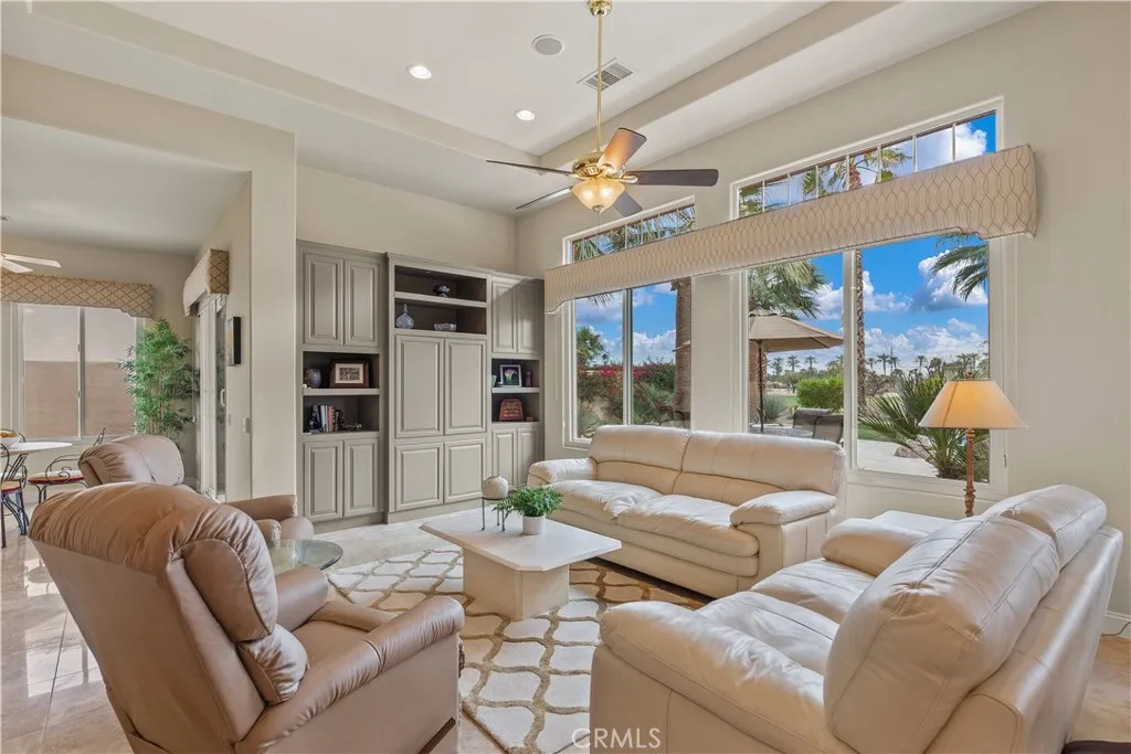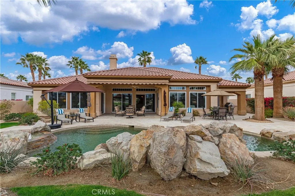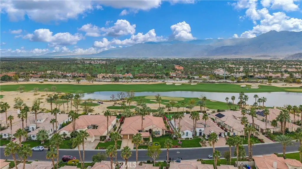 This specially cared for PGA West home sits on a SECLUDED, LARGE LOT that measures over a third of an acre, and is situated ABOVE the 14th tee box with sweeping SOUTHERN double fairway VIEWS of the Greg Norman Golf Course and Santa Rosa Mountains. The backyard has been completely REMODELED with COOL travertine stone DECKING, mature palms, native plants, pebble tech pool with waterfall, spa and two heaters, fire chat area, built-in barbecue, California room with recessed overhead, infra red heaters, automated awning and misters for YEAR-ROUND, OUTDOOR ENJOYMENT. The Toll Brothers Mendocino plan is a spectacular home that begins with a welcoming porch and calming fountain leading into a GRAND FOYER of polished travertine. Its unique floor plan feels open and spacious with its 12' high ceilings, offering VIEWS out to the yard and pool, and flows easily from one space to the next: A formal dining area with a dramatic 20' high skylight, an inviting living room anchored by an elegant fireplace, an entertainer's wet bar with ample seating, a casual lounge area with built in book case and TV, and of course, a gourmet kitchen with island, walk-in pantry, and breakfast area. The primary suite also overlooks the pool and views of the golf course and has its own backyard access. It includes an en suite bath featuring a luxurious Roman therapeutic whirlpool tub, separate shower and dual vanities, plus walk in closet with high end built-ins. There is a 2-car garage plus adjacent full size golf cart garage so you can easily commute to all 6 world-renowned golf courses within the community