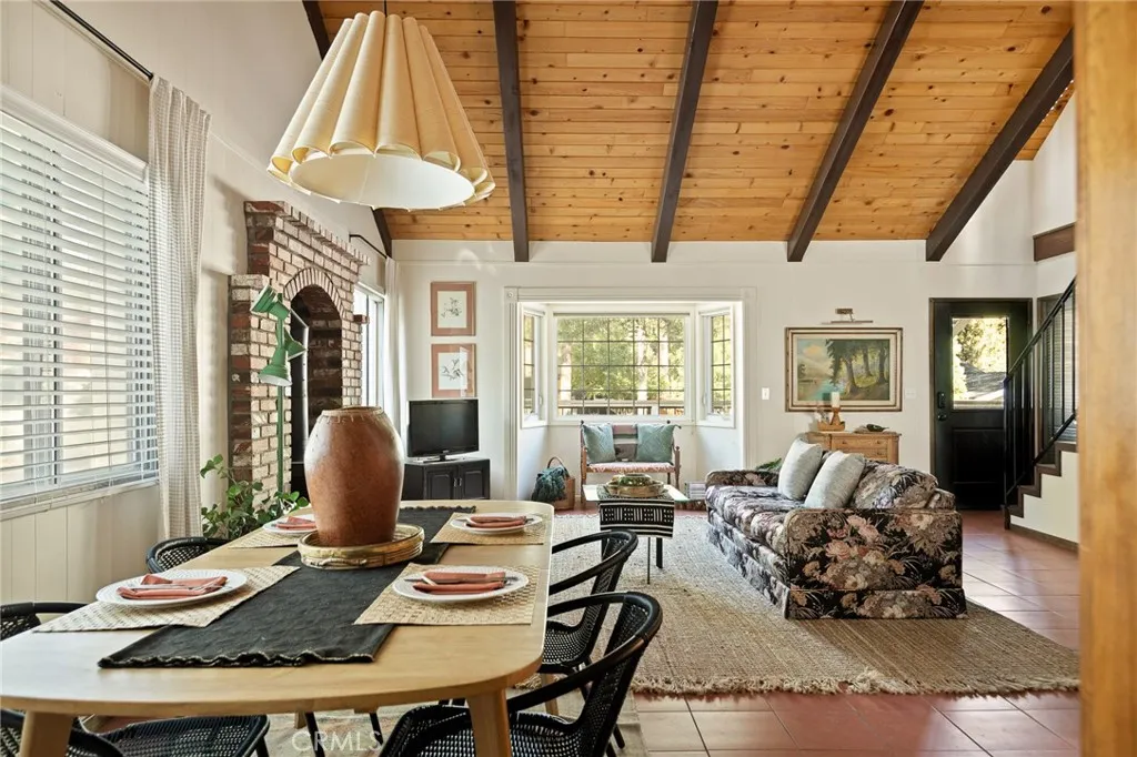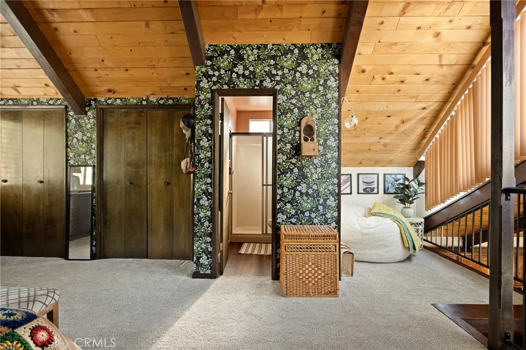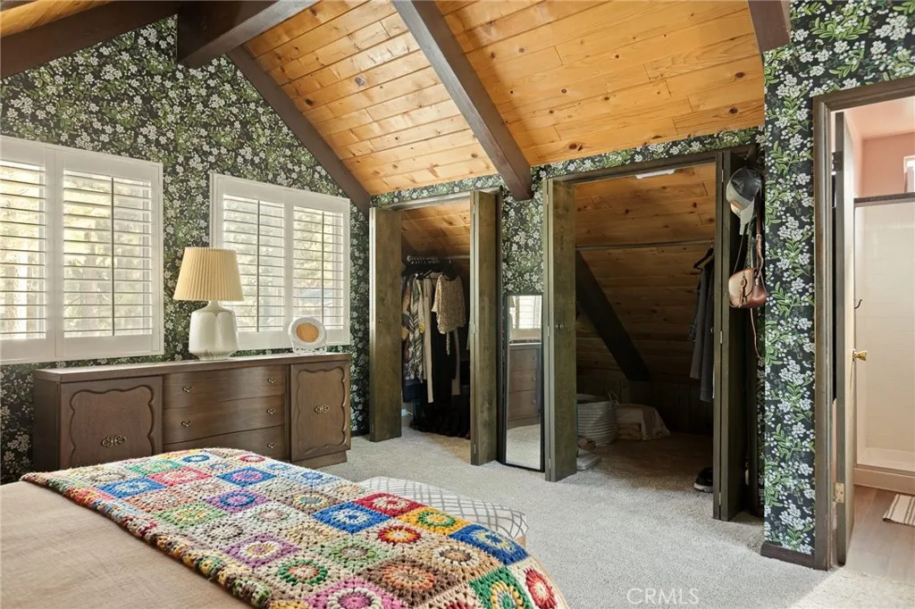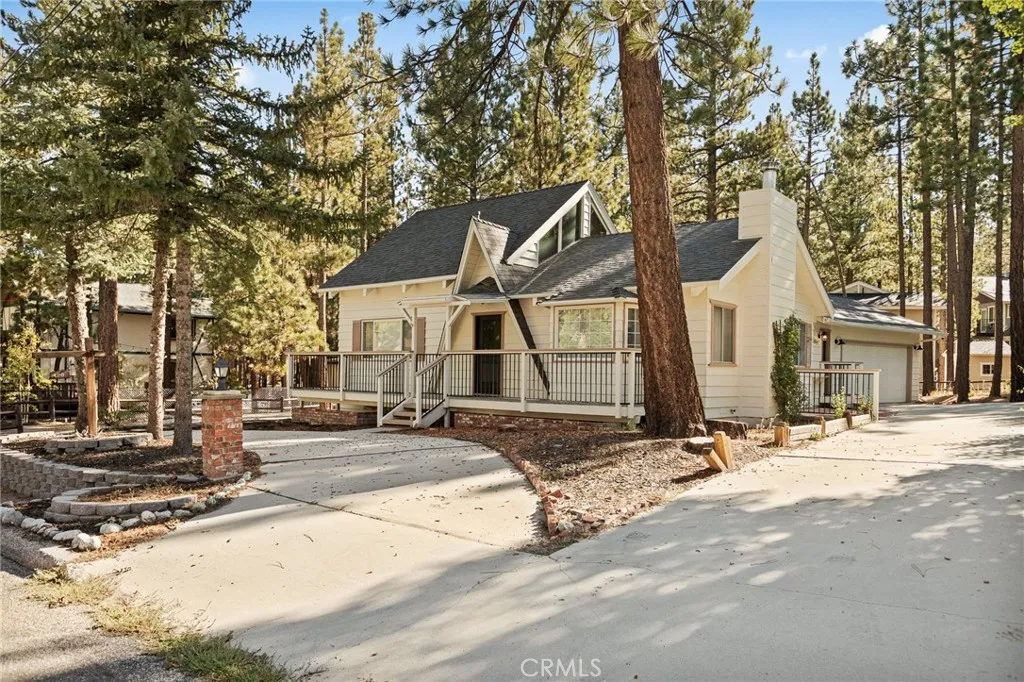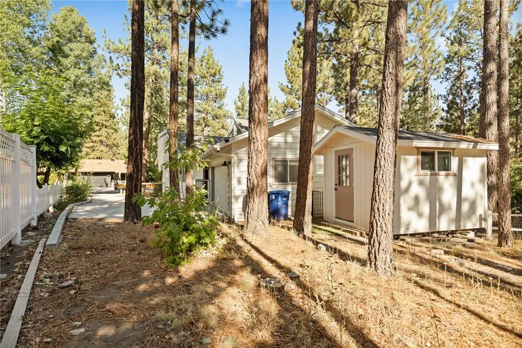 Welcome to the most charming chalet-style dream cabin in Pinewood Estates, Big Bear. This is an incredible opportunity to own the most stylish Big Bear escape, thoughtfully renovated and curated by a Los Angeles interior designer and antique dealer. This 3-bedroom, 2-bath home blends timeless A-frame charm with modern comfort, creating a truly one-of-a-kind retreat. Step inside to soaring A-frame T&G ceilings, a cozy fireplace with wood stove, and a sunny bay window perfect for reading. The beautifully updated kitchen features Cambria quartz countertops with a waterfall peninsula, designer green Zellige backsplash, touchless faucet, and a double-bowl sinkall paired with original vintage cabinetry that adds warmth and character. The loft-style primary suite offers a peaceful retreat with ensuite bath, dual closets, and a large A-frame window framing treetop views. Two downstairs bedrooms include ample storage and vintage dressers, while updated bathrooms showcase modern style with designer finishes. Outdoor living shines with a front deck, fully-fenced backyard, dual-access gates, three producing fruit trees (apple, plum, peach), and a Dad Pad converted shed with electric, insulation, and Milgard windowsperfect for a studio, office or game room for the kids. A looped front driveway plus extended driveway and 2-car garage provide ample parking for cars, RV, or boats. Every detail of this home has been thoughtfully upgraded, including: brand new asphalt shingle roof (Malarkey), fresh exterior & interior paint, new flooring throughout, new front & back deck railings and steps,