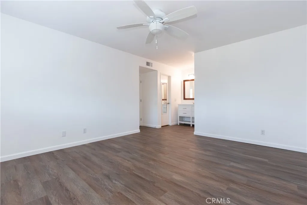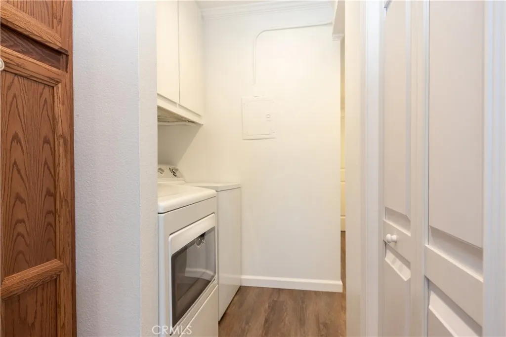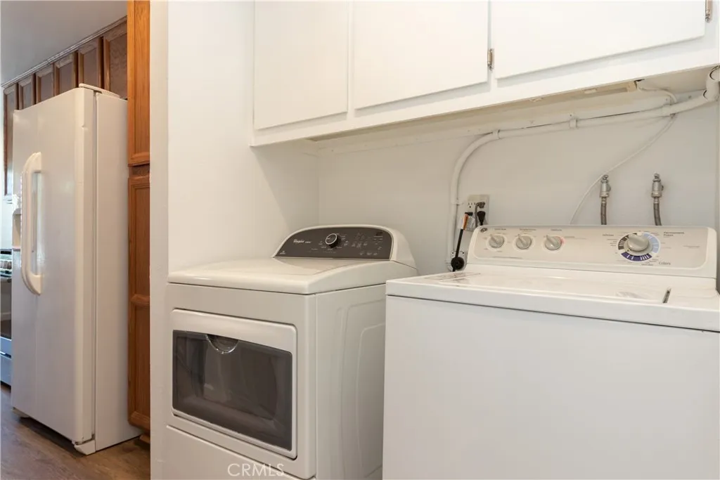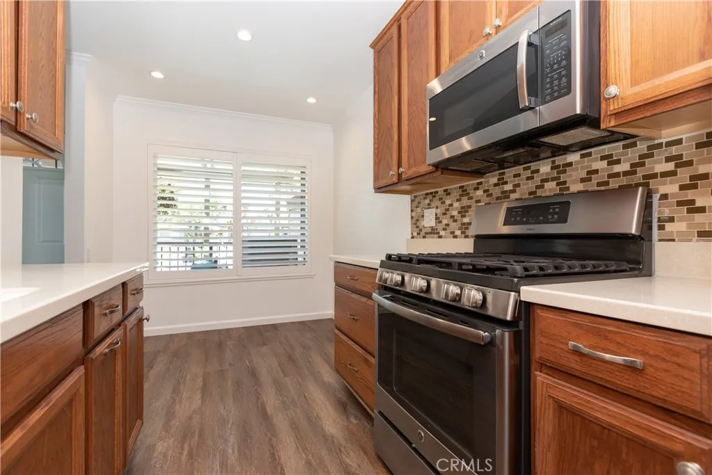 Totally turnkey, upper level end unit located in the Aliso Villas. This is the one you have been waiting for! This 2 bedroom, 1.25 bath shows light and bright with many upgrades. Features include: Brand new paint throughout, along with new vinyl flooring, baseboards and new plantation shutters in the living room, kitchen and both bedrooms. The Jack and Jill bathroom has upgraded shower walls, a tub and two brand new vanities/light fixtures. Beautiful oak (soft close) cabinets in the kitchen, an enclosed pantry with adjustable shelves and the washer, dryer and refrigerator are all included. The master bedroom has a custom walk-in closet that can be configured to your design needs. Other features include: new LED can lighting, ceiling fans in both bedrooms, dual pane windows, an Ecobee smart thermostat, a newer water heater, upgraded a/c unit and a security screen door. The oversized one-car garage includes storage cabinets and overhead storage with a convenient side entry door located at the bottom of the stairs leading to the home. There is also one assigned parking space located near the property. Relax on your covered private patio or enjoy the Community Association Pool, Spa, Playground and Picnic Area nearby. NO-ONE ABOVE or BELOW. Buyers have the option of joining the Lake Mission Viejo Association (LMVA). The property is located in the heart of Mission Viejo, close to schools, shopping, transportation, dining, parks, paths, Lake Mission Viejo and so much more!