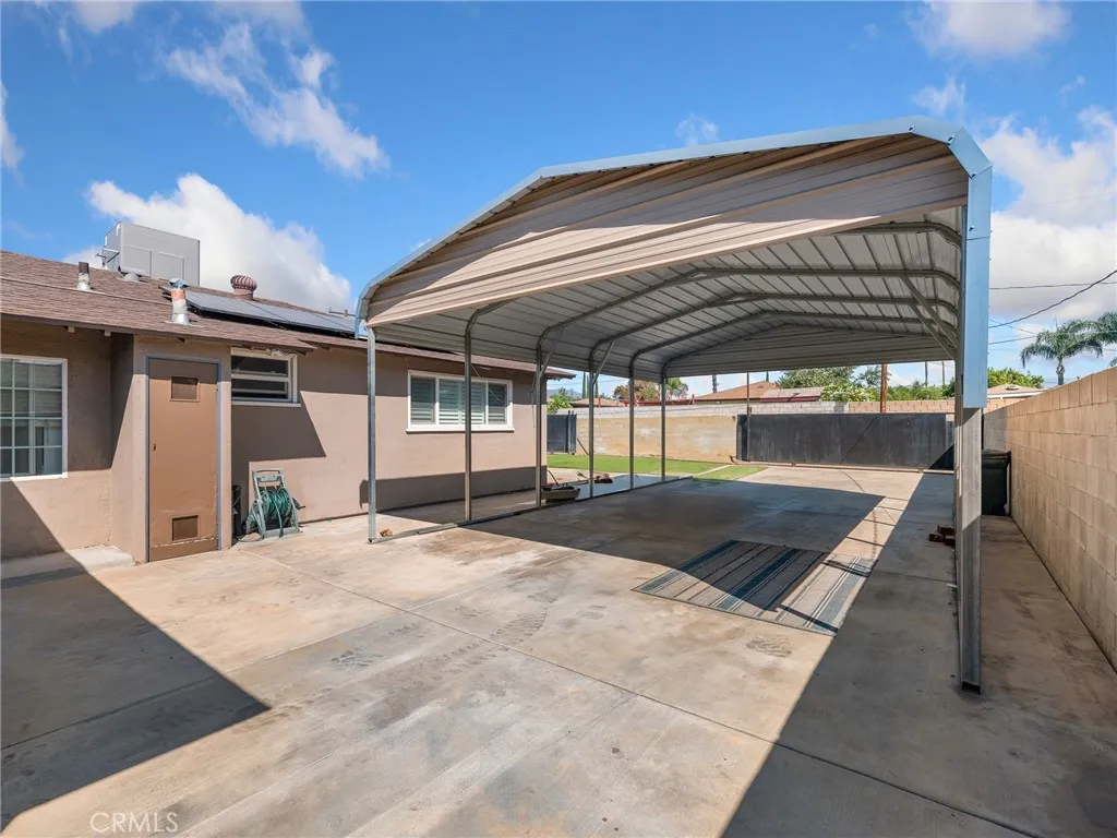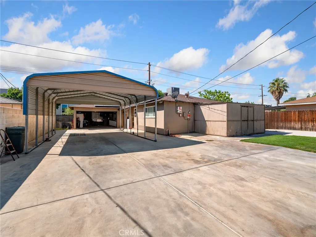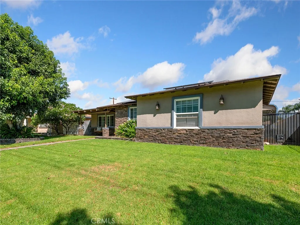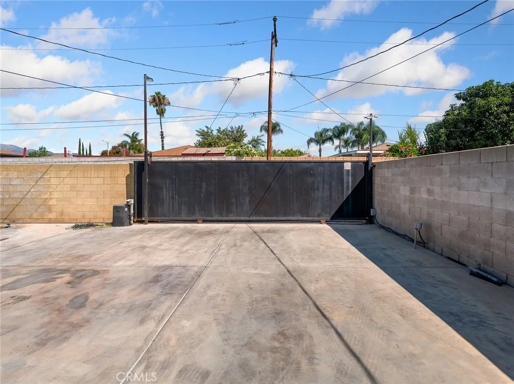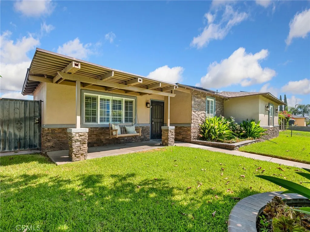 Welcome to this beautifully remodeled 3-bedroom, 2-bath home in Rialto, offering 1,156 sq. ft. of living space on a landscaped 7,300 sq. ft. lot. The exterior features a mature avocado tree, welcoming porch, flagstone accents, and atrium-style front door. Electric driveway gates with alley access, security cameras, exterior lighting, sprinkler system, an 18x26 carport, two-car attached garage, and storage shed provide both convenience and security. Major updates include a newer roof, a 2023 HVAC system, upgraded plumbing from the main line to the kitchen and baths, and a 2019 water heater. A leased solar system offers energy efficiency. Inside, the home is move-in ready with fresh paint, crown molding, new windows, plantation shutters, tile flooring in living areas, and laminate in bedrooms. The living room is wired for surround sound, and every room has USB outlets. The kitchen features granite countertops, stainless steel appliances, a farmhouse sink, and a custom dining nook with built-in bench and shelving. The primary suite offers two closets and a spa-style bath with custom tile shower and glass doors. The guest bath includes granite counters, pedestal sink, and walk-in shower. Secondary bedrooms are stylish, with one showcasing a New York City firehouse vibe with brick accent wall, sliding barn door, and sconce lighting. Additional highlights include hallway storage, ceiling fans throughout, a Nest thermostat, and garage cabinetry with washer and dryer hookups. The backyard is private with block wall and wood fencing, offering plenty of outdoor living space. Located