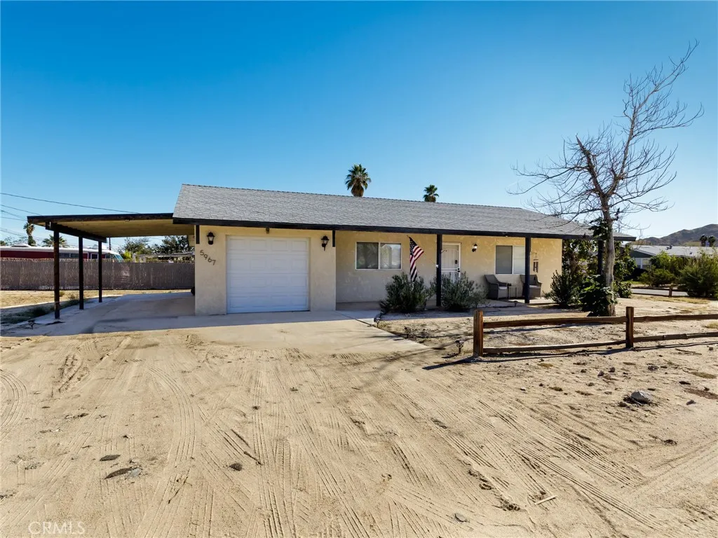 Adorable 1 bedroom 1 bathroom corner lot home in the Chocolate Drop neighborhood of 29 Palms! This home features upgrades throughout. The open concept interior design boasts a large kitchen peninsula and cozy living room. Central heating and air, a swamp cooler, and ceiling fans ensure comfort throughout the year. The front porch is perfectly located to enjoy evening sunsets and incredible mountain views. Plenty of parking including an attached 1 car garage and metal carport. Wood split rail fencing lines the property boundaries. Currently a long term rental. Short drive to the North entrance to Joshua Tree National Park. The central location makes this a fantastic opportunity for a starter, retirement, or rental home!