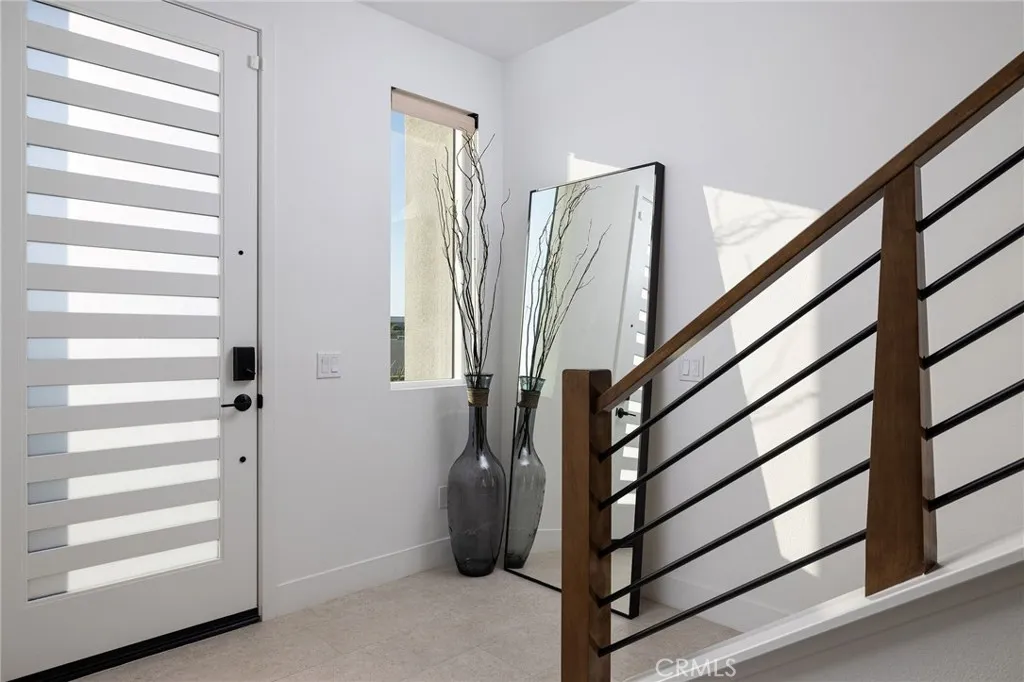 This newly built luxury townhome in The Landing at Tustin Legacy offers the perfect blend of modern sophistication and everyday convenience in one of Orange County's most desirable new communities. Completed in 2023, this light-filled contemporary home welcomes you with an open-concept layout featuring soaring 12-foot ceilings, imported Italian stone floors, and sleek matte black designer finishes that create an atmosphere of understated elegance. Enter the 3-story plan through the thoughtfully designed lower level that includes an ensuite bedroom (or optional office or fitness room) and direct access to the two-car garage. This space also opens directly to a sunny patio, bringing the outdoors in and making for a welcoming curb appeal. Large windows fill the second-level great room with natural light, creating an ideal environment for both entertaining guests and everyday relaxation. The living room flows seamlessly to a private balcony, extending your living area outdoors. The luxe chef's kitchen is finished with full-height maple cabinetry, a complete stainless steel JennAir/KitchenAid appliance suite, and a striking quartz island ready for casual bites and conversation. Upstairs, two generously sized bedrooms each provide ample accommodation with large windows and spacious closets. The primary suite serves as a true retreat, with two walk-in closets featuring professional organizers and a spa-like bathroom with double sink vanity and oversized shower. Modern convenience is built-in, with smart features including paid solar panels, an EV charger, Google Home smart system,
