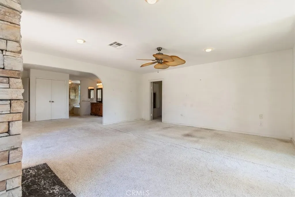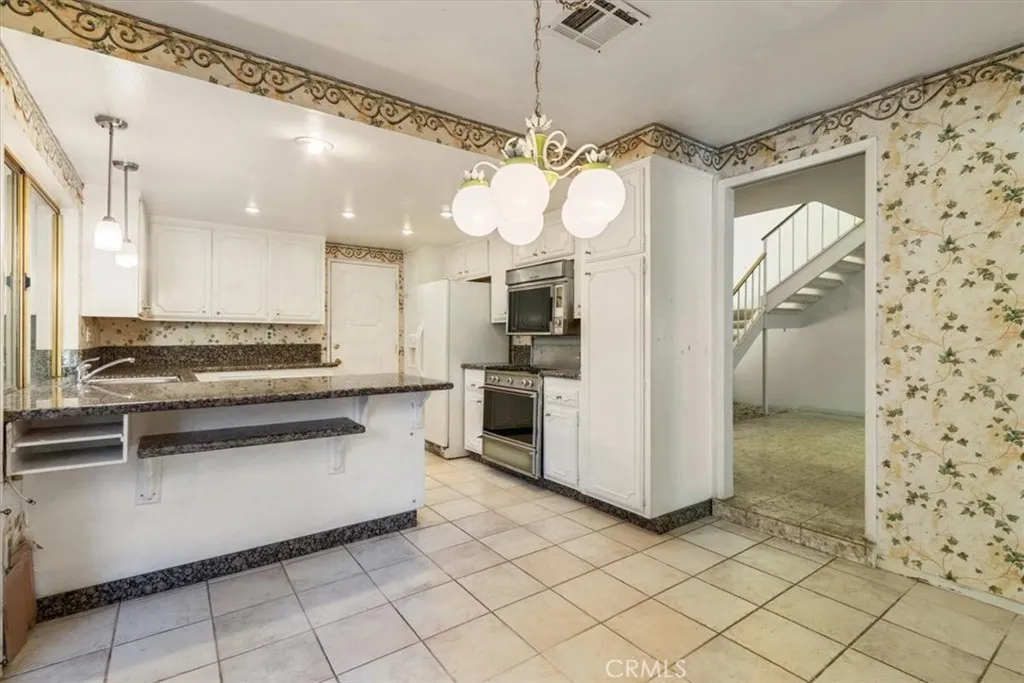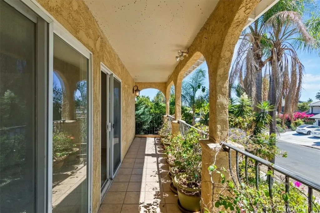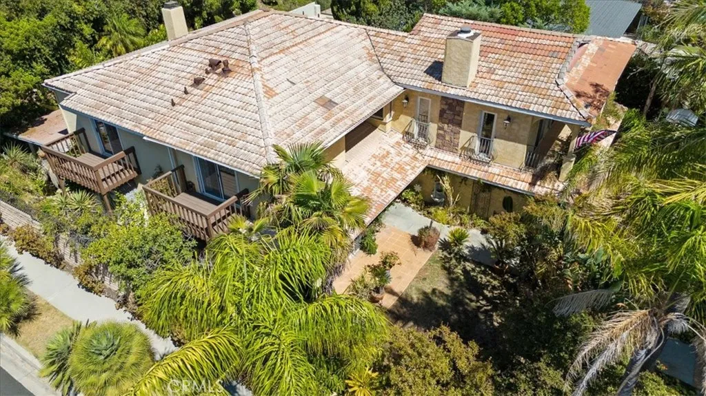 This Mediterranean-style home, with its distinctive Mid-Century Modern flair, presents a rare opportunity for a buyer with vision. Situated on a desirable corner lot within a highly sought-after top-tier school district, the property features a private, gated entry. Inside, soaring ceilings, an elegant MCM staircase, and an impressive floor-to-ceiling fireplace are complemented by expansive windows that fill the sunken living and dining areas with natural light. The main level offers a flexible bedroom and a full bath, alongside a spacious den that could function as a sixth bedroom or combine to create a private mother-in-law suite or attached rental apartment. Stone flooring in the living and dining rooms leads to a covered patio and a lush, tropical-style garden featuring a Koi pond, lap pool, and two covered patios. An eat-in kitchen with sliding doors opens to a second covered patio with stone tile and a unique aviary. A three-car garage provides ample storage. The second floor features an extra-large primary bedroom with a huge private balcony, fireplace, and two closets, including a walk-in, plus a massive en-suite bath. Three additional generously sized bedrooms, two with their own balconies, and extensive storage complete the upstairs. This home is a canvas awaiting your creative vision.