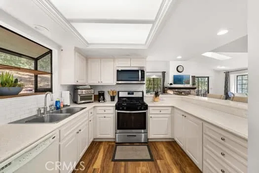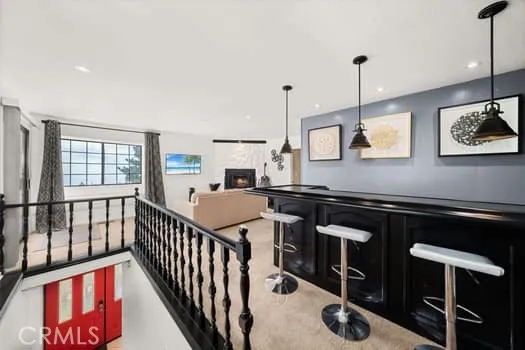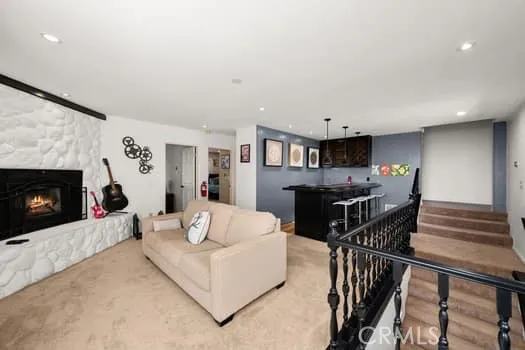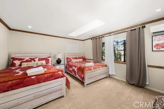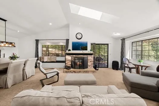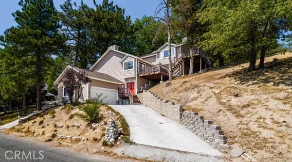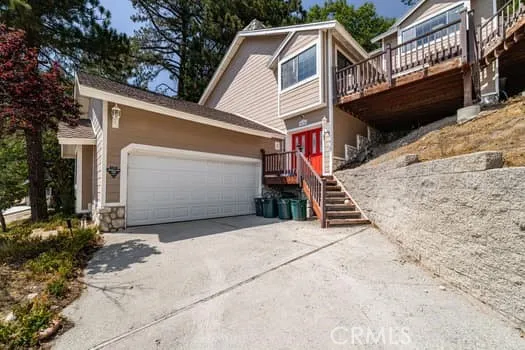 This beautiful FULLY FURNISHED bi-level home is nestled in Running Springs within the San Bernardino National Forest, and as soon as you lay your eyes on it, youll immediately recognize the owners true Pride-Of-Ownership. Here are just a few of its many other fine features: Custom double doors swing open to a flowing 2,424 square foot open concept floor plan that is in Move-In-Condition with recessed lighting, a designer paint scheme, and a complementary blend of plush carpet and laminate flooring. The stairs bring you up to the spacious living room with direct deck access, a majestic gas-burning fireplace with raised hearth, and entertainers wet bar with custom pendant lighting. The familys cook is going to fully appreciate the kitchens large garden window, abundant cabinets, ample Corian counters, durable dual basin stainless steel sink, built-in appliances, breakfast bar, and the convenience of the adjoining dining area. Since the family room with its bright skylight, direct deck access, and stacked stone gas-burning fireplace with raised hearth flows seamlessly with the dining area, youll find it easy to serve and entertain your guests simultaneously. All 3 bedrooms have efficient mini split AC units. The grand suite also has a large skylight, walk-in closet, and a beautifully appointed bathroom with large dual sink mirrored vanity. The bonus room could be used as your 4th bedroom or office. There is a total of 2.5 bathrooms and functionally located laundry room with handy utility sink. Energy efficient dual pane windows will help keep your utility bills low. Plenty of