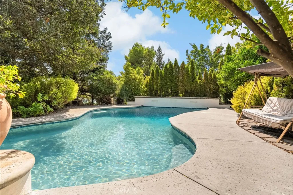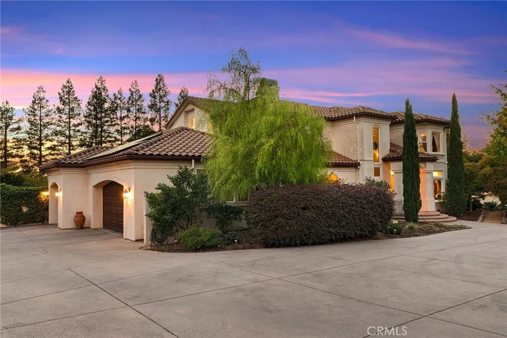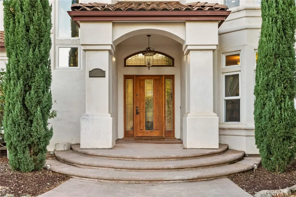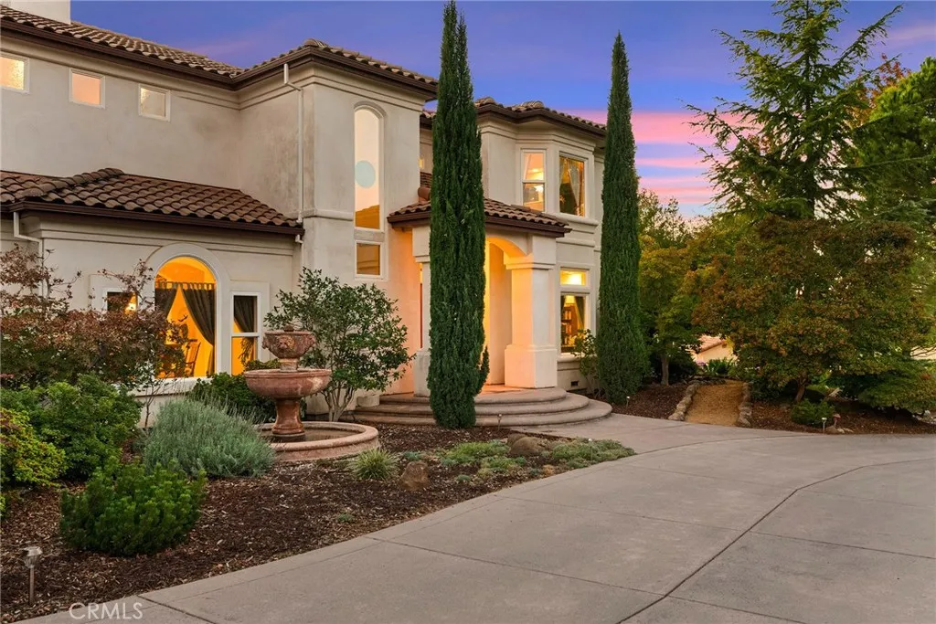 Welcome to a truly remarkable estate within the highly sought-after gated community of Canyon Oaks. Nestled on a private cul-de-sac on a sprawling one-acre lot near the entry gate, this Spanish-inspired residence showcases breathtaking landscaping and elegant design elements throughout. Step through the grand entryway into a home that exudes sophistication, with arched walkways and expansive windows that flood each room with natural light and offer beautiful views of the meticulously crafted grounds. The living room is an entertainer's dream, boasting soaring high ceilings, a cozy fireplace, and seamless flow into a gourmet kitchen. Here, you'll find luxurious granite countertops, double ovens, stainless steel appliances, an island and peninsula, plus a charming dining nook. Additional features on the main level include a climate-controlled wine storage room, two guest bedrooms, two guest bathrooms (one with a relaxing sauna shower), a formal dining room, and a cozy library with its own fireplace. Ascend the stunning wrought iron staircase to a second-floor terrace that overlooks the main living area. The upstairs media room provides a versatile space for entertainment or relaxation. The primary suite is an expansive retreat, featuring a fireplace, skylights, a private reading area, a balcony with scenic views, and a massive walk-in closet. The luxurious ensuite bathroom offers a soaking tub, walk-in shower, double sinks, and a vanity area. Upstairs, youll also find two additional guest bedrooms and a full guest bathroom. The backyard is an absolute oasis with a lush lawn,